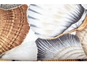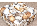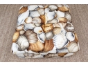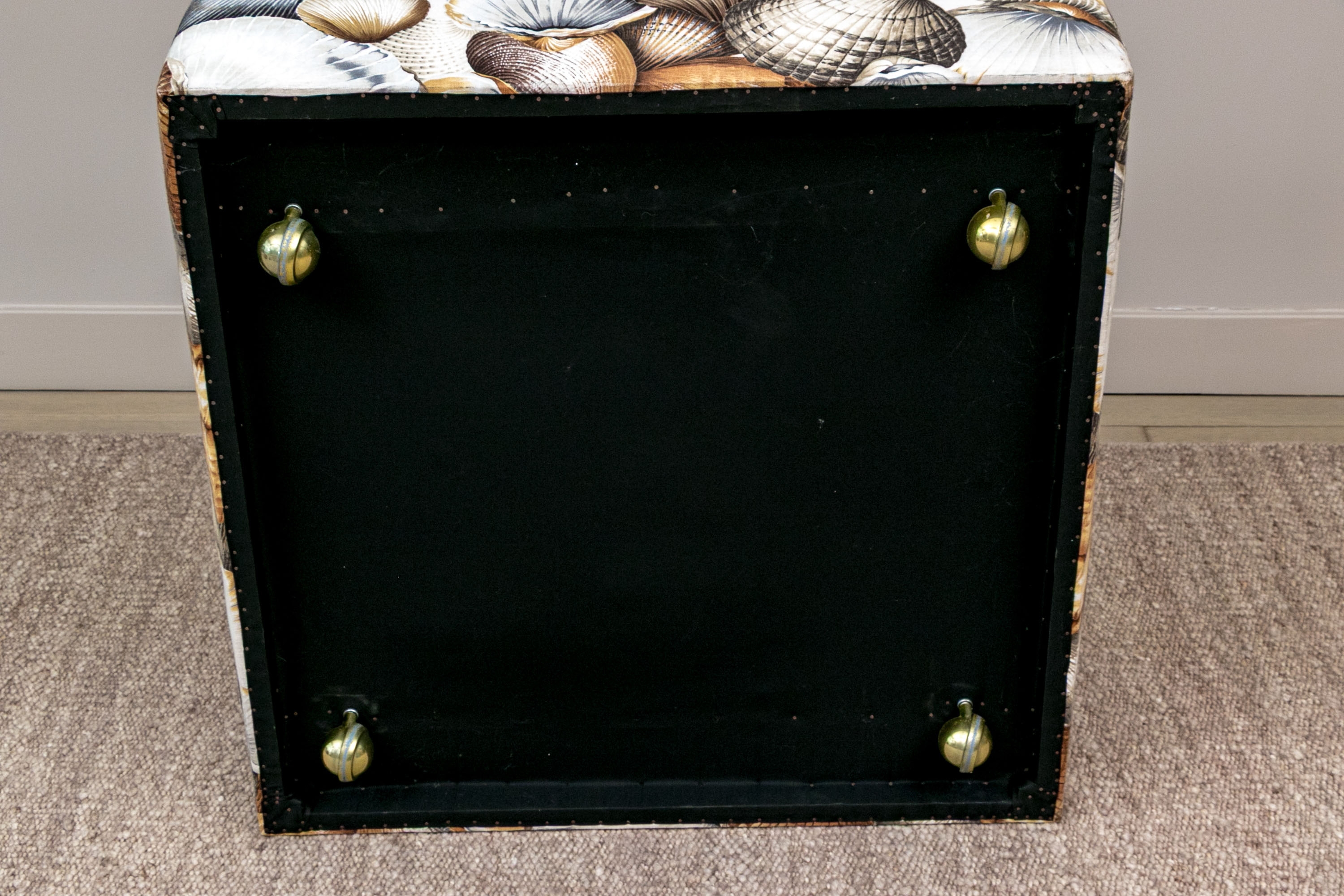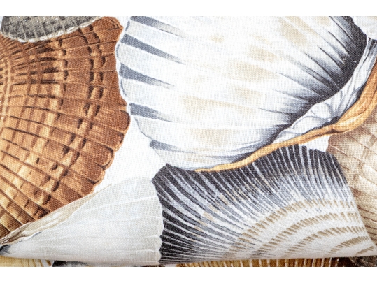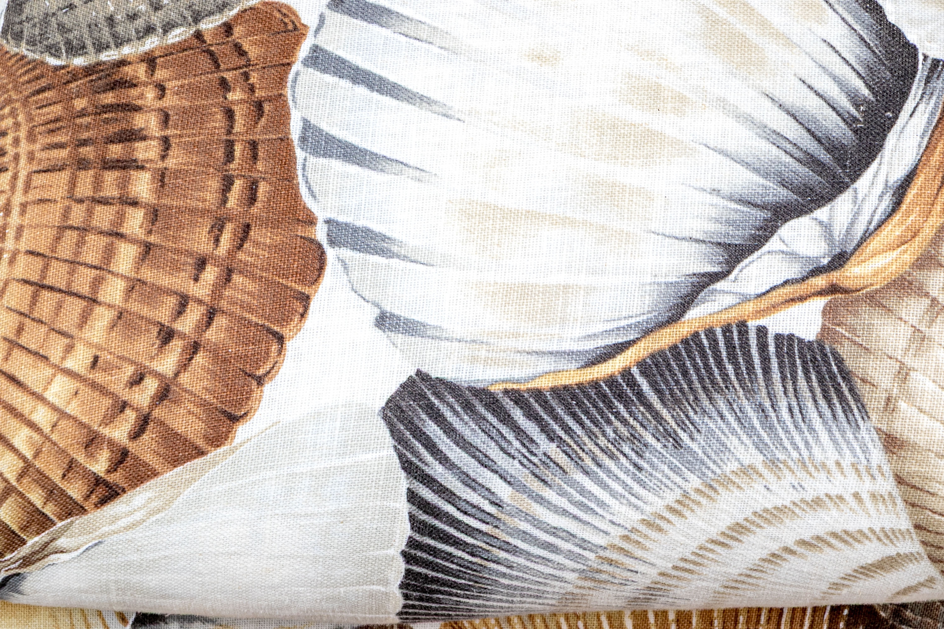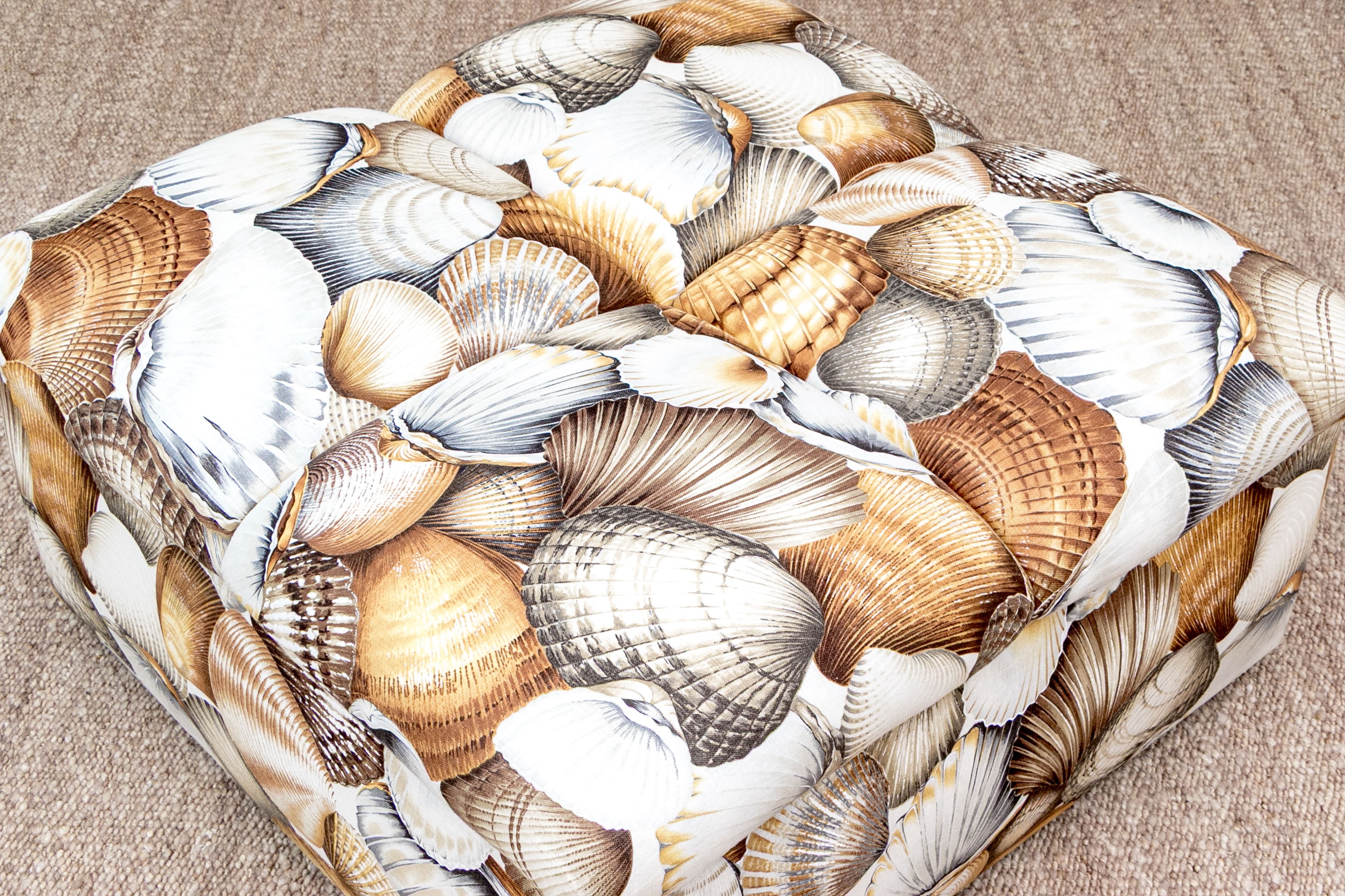 An ottoman featuring a distinct seashell print with woven upholstery fabric, giving it a coastal or beach-themed aesthetic in natural or muted tones with grays, browns, and creams and raised up on brass ball casters. The ottoman is especially designed for extra seating or resting your feet making it a functional and decorative for various rooms, such as a bedroom, living room, or entryway.