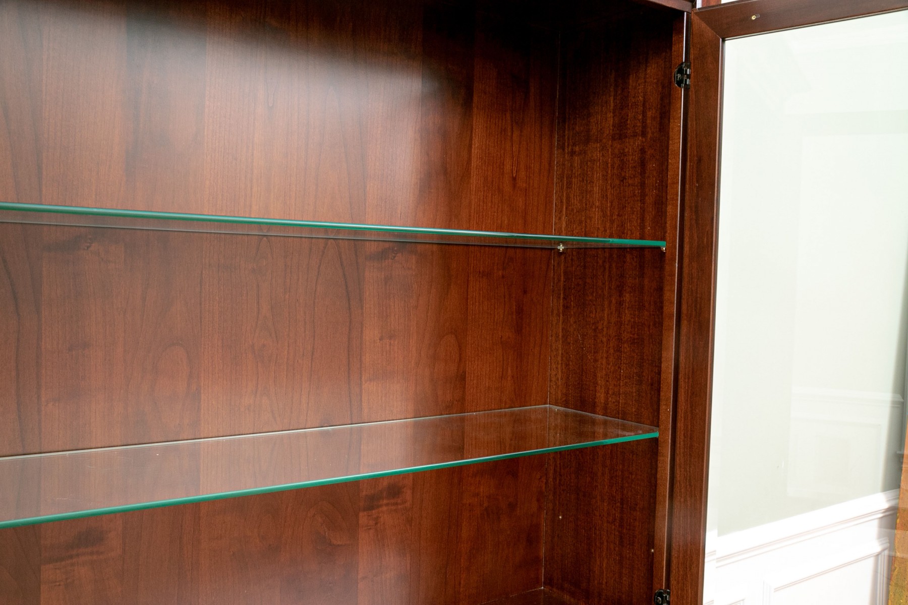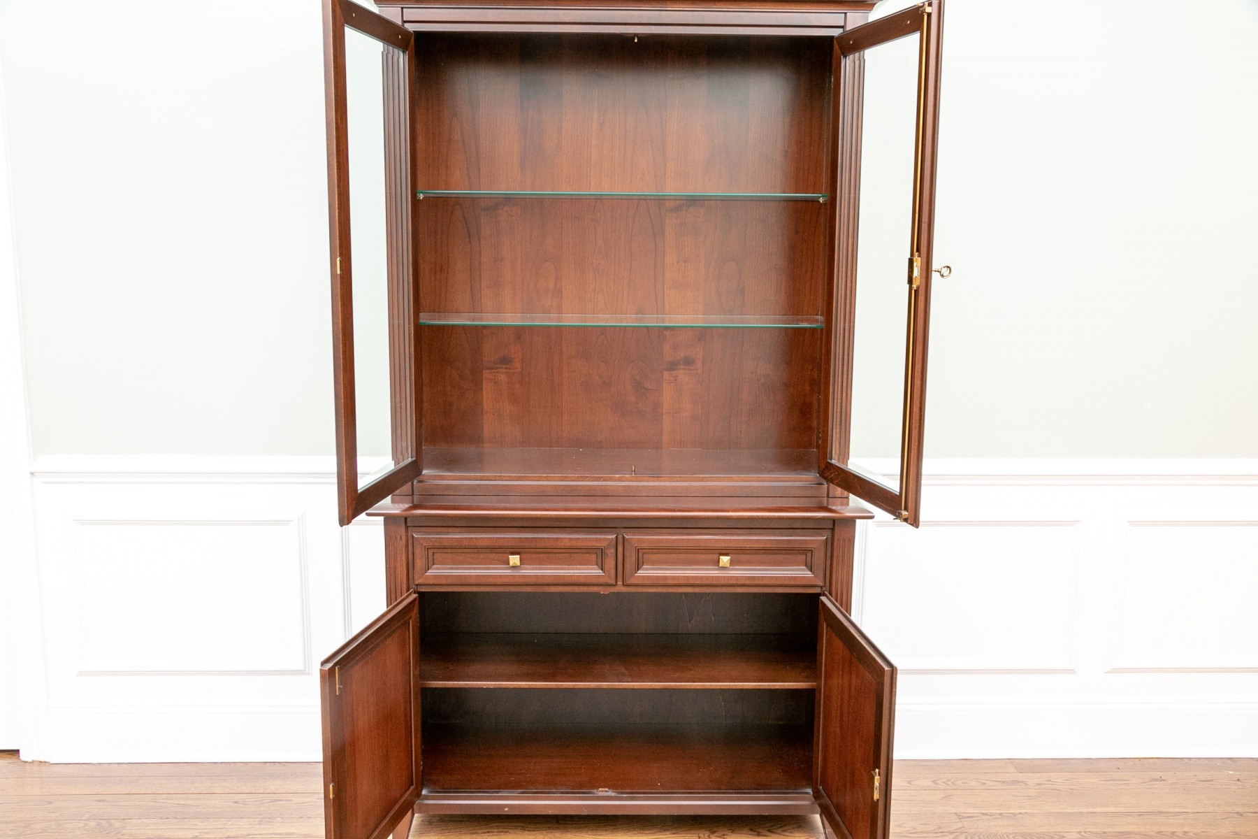 Made of cherry wood, this cabinet features two glass doors that open to reveal three shelves inside for storage and display. The top of the cabinet is also made of glass, allowing for a clear view of the items on display