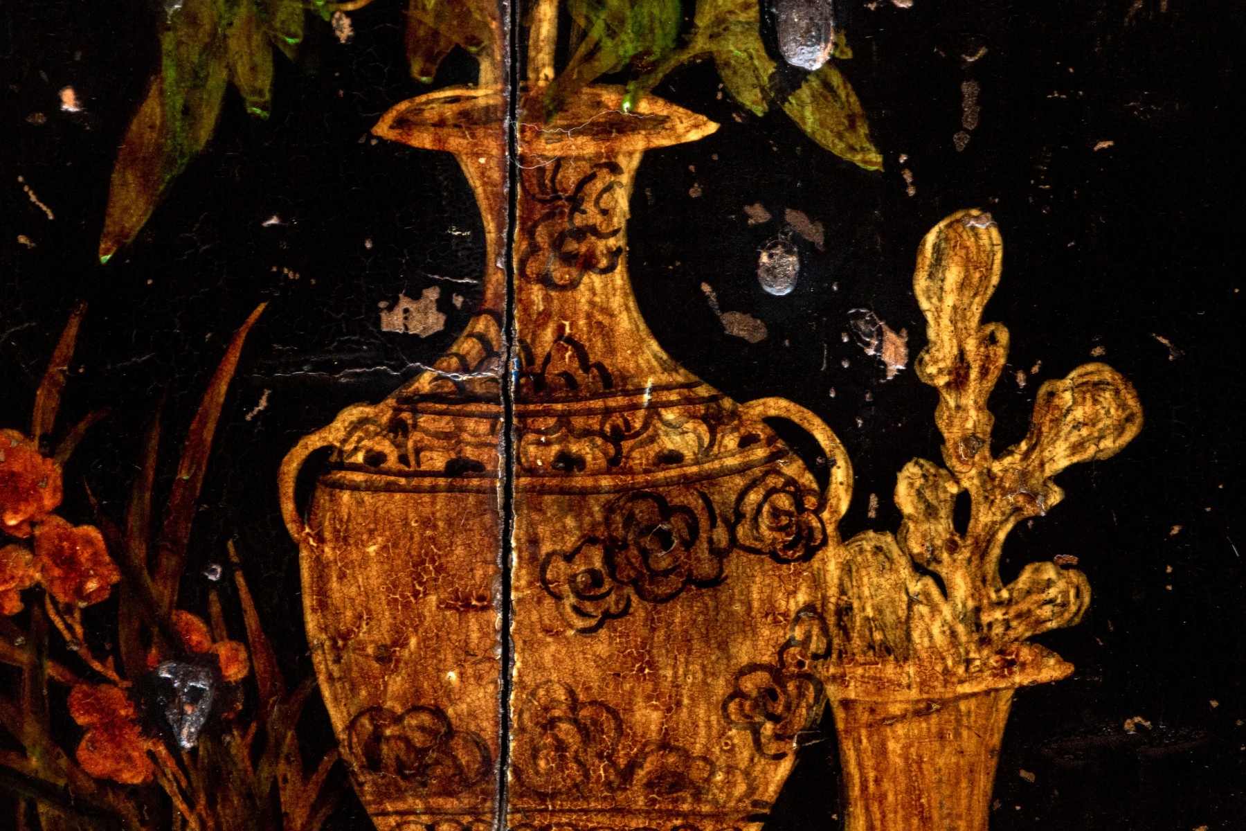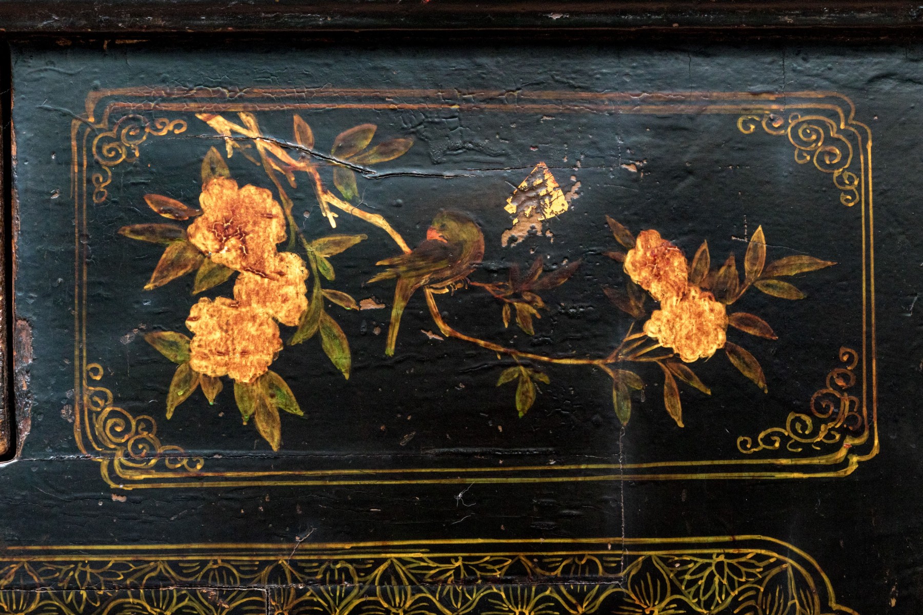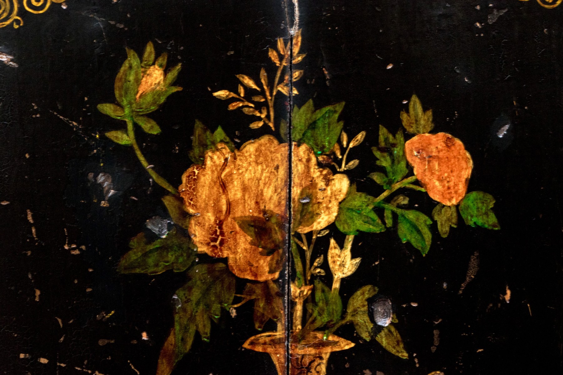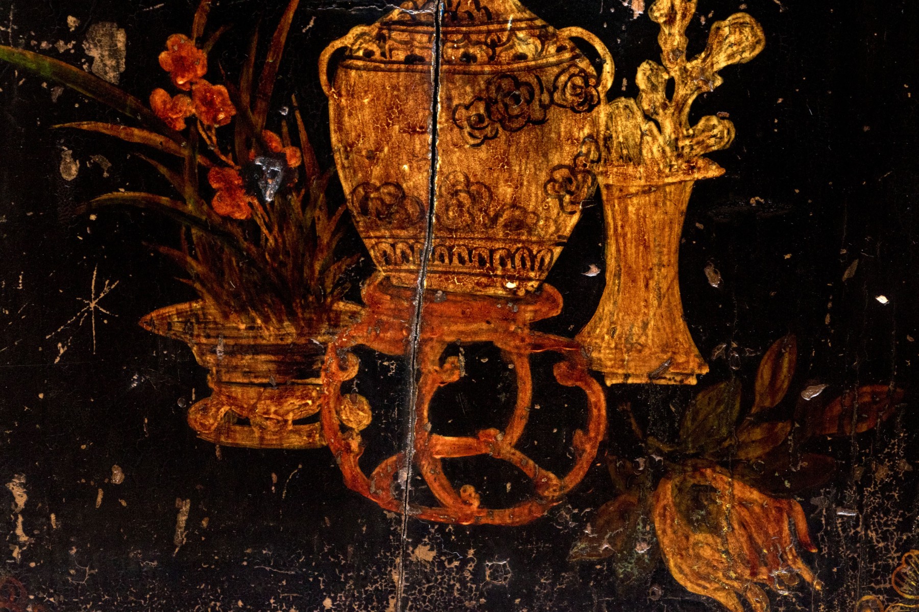 The whole has a black lacquered ground with still life decorative panels in gilt and polychrome paint finish.