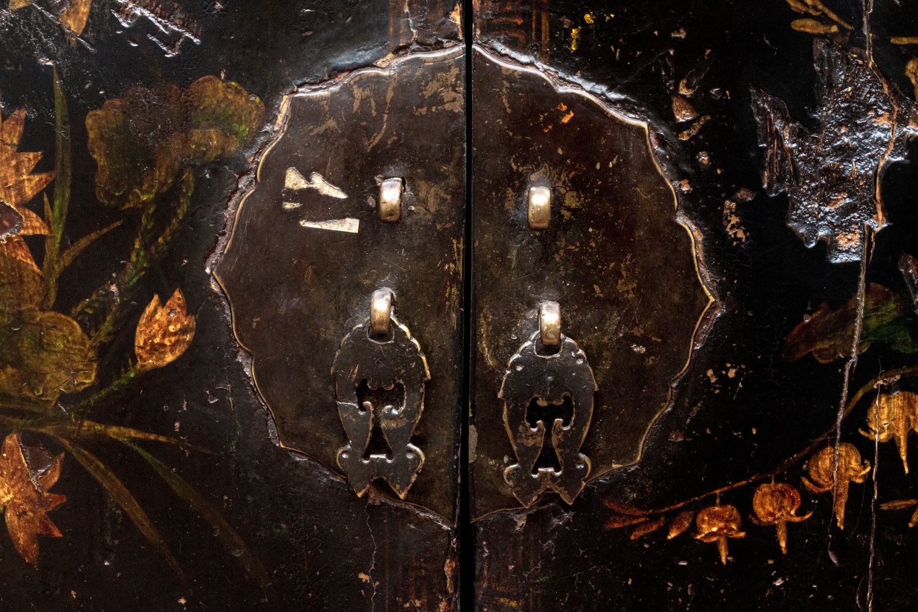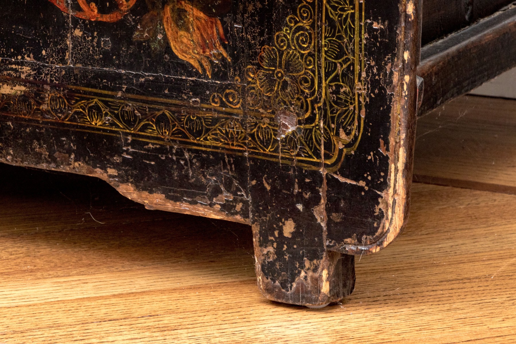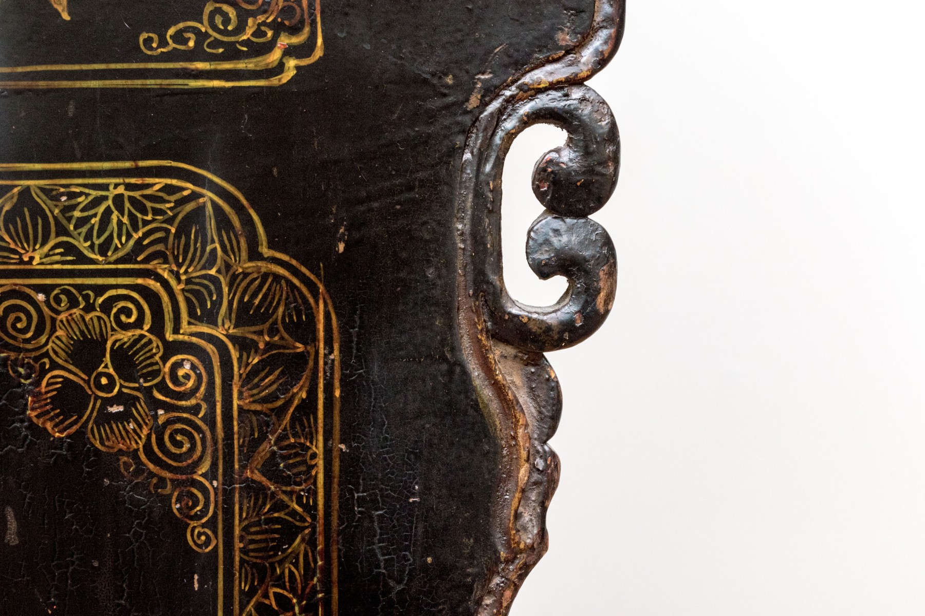 The whole has a black lacquered ground with still life decorative panels in gilt and polychrome paint finish.