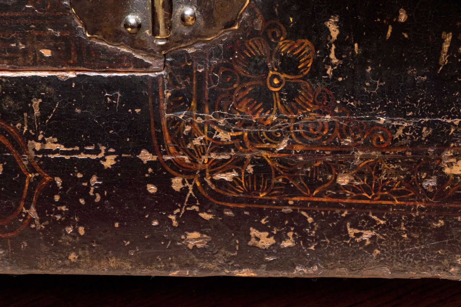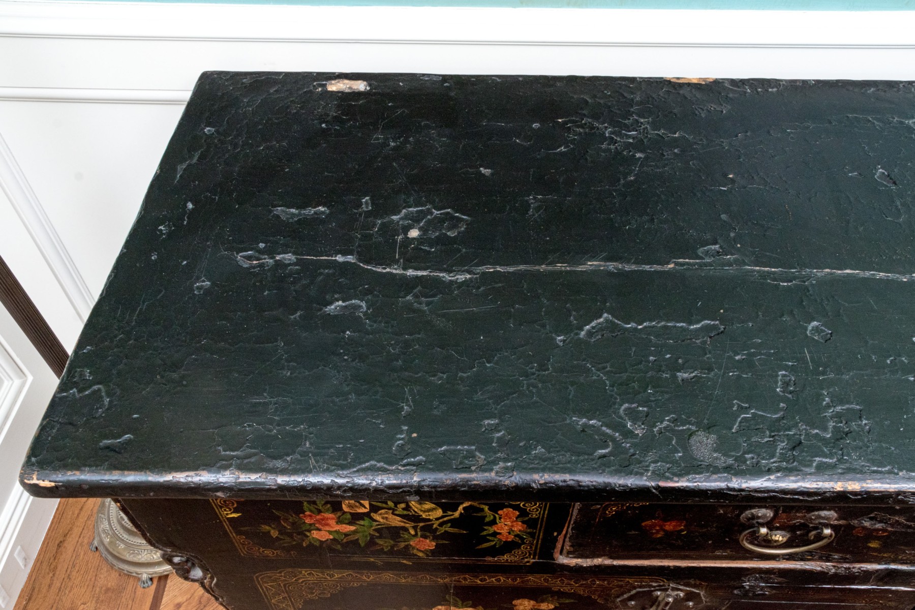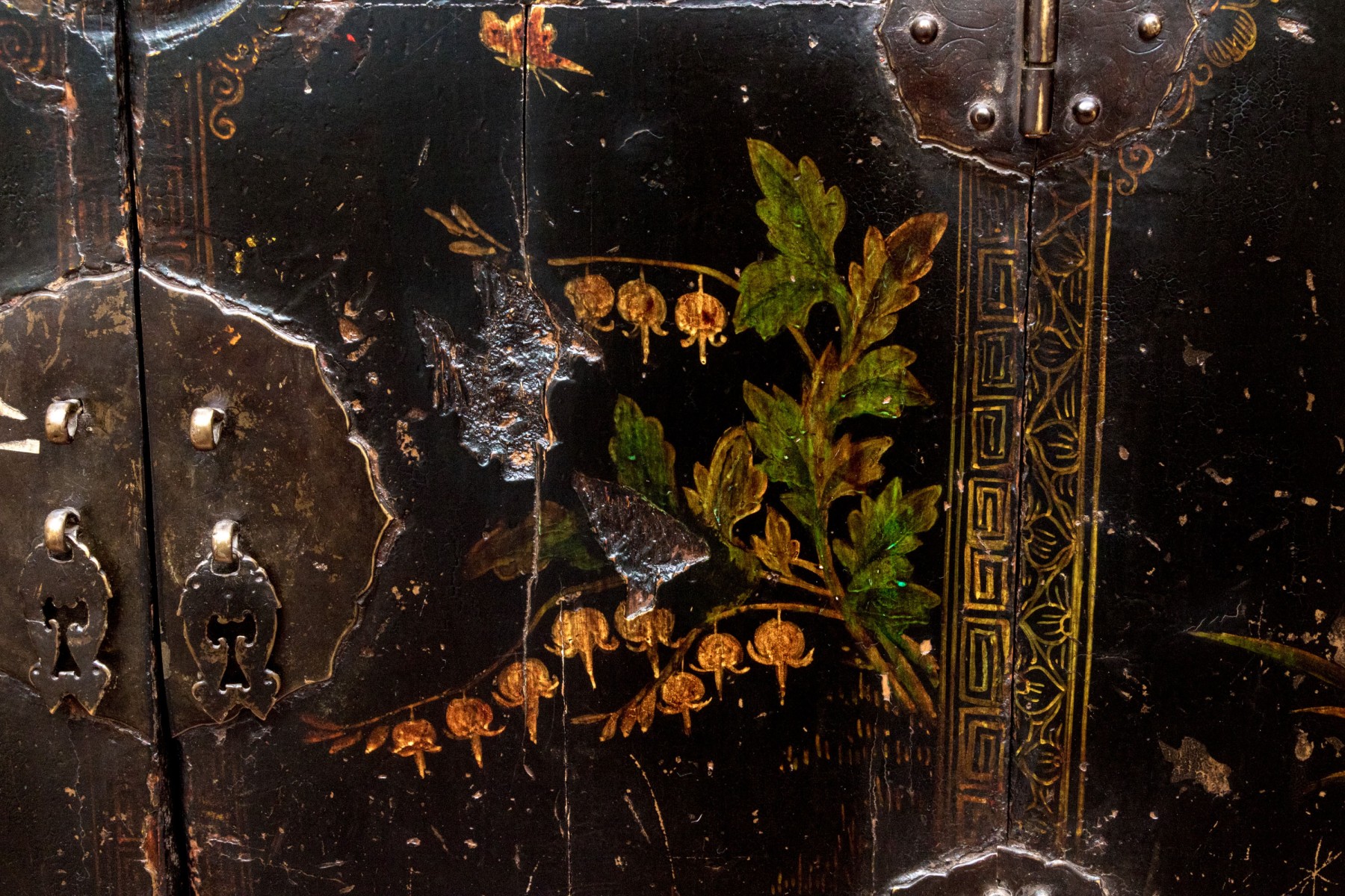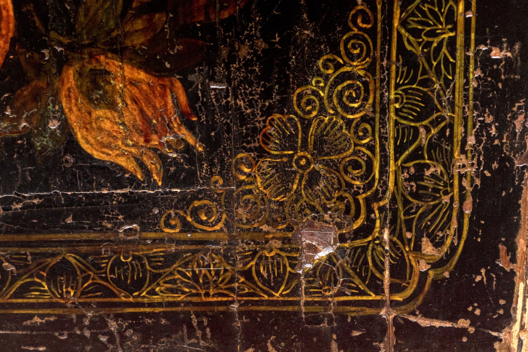The whole has a black lacquered ground with still life decorative panels in gilt and polychrome paint finish.
