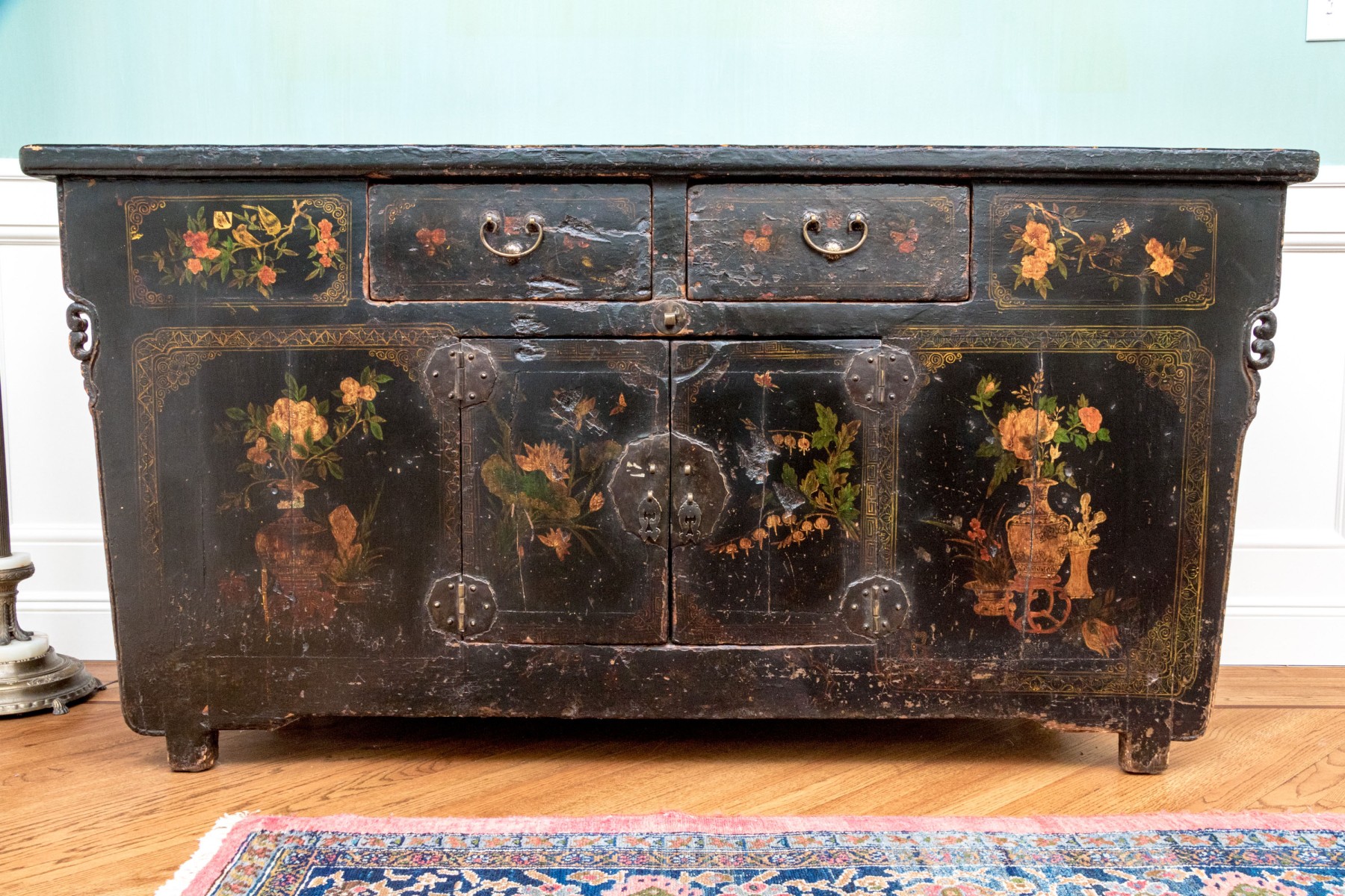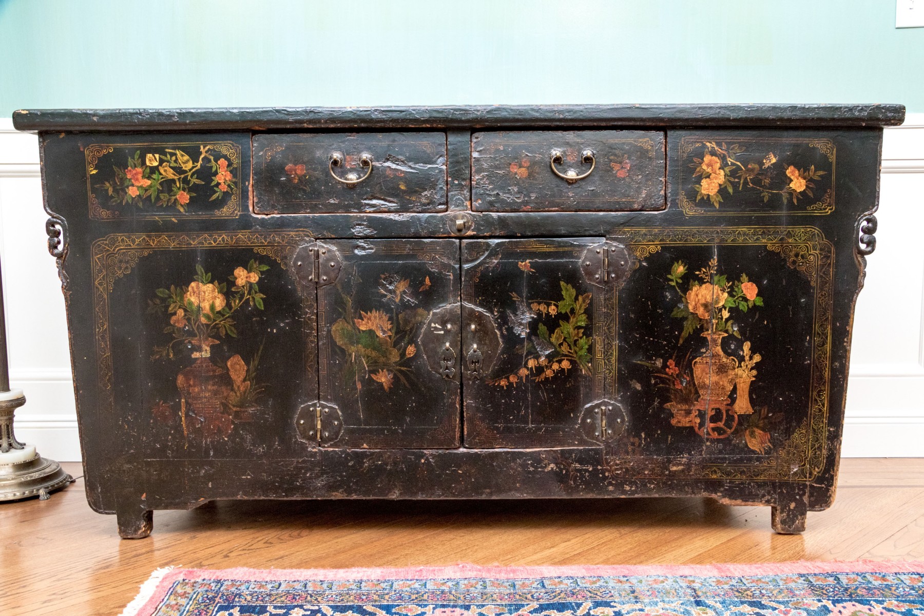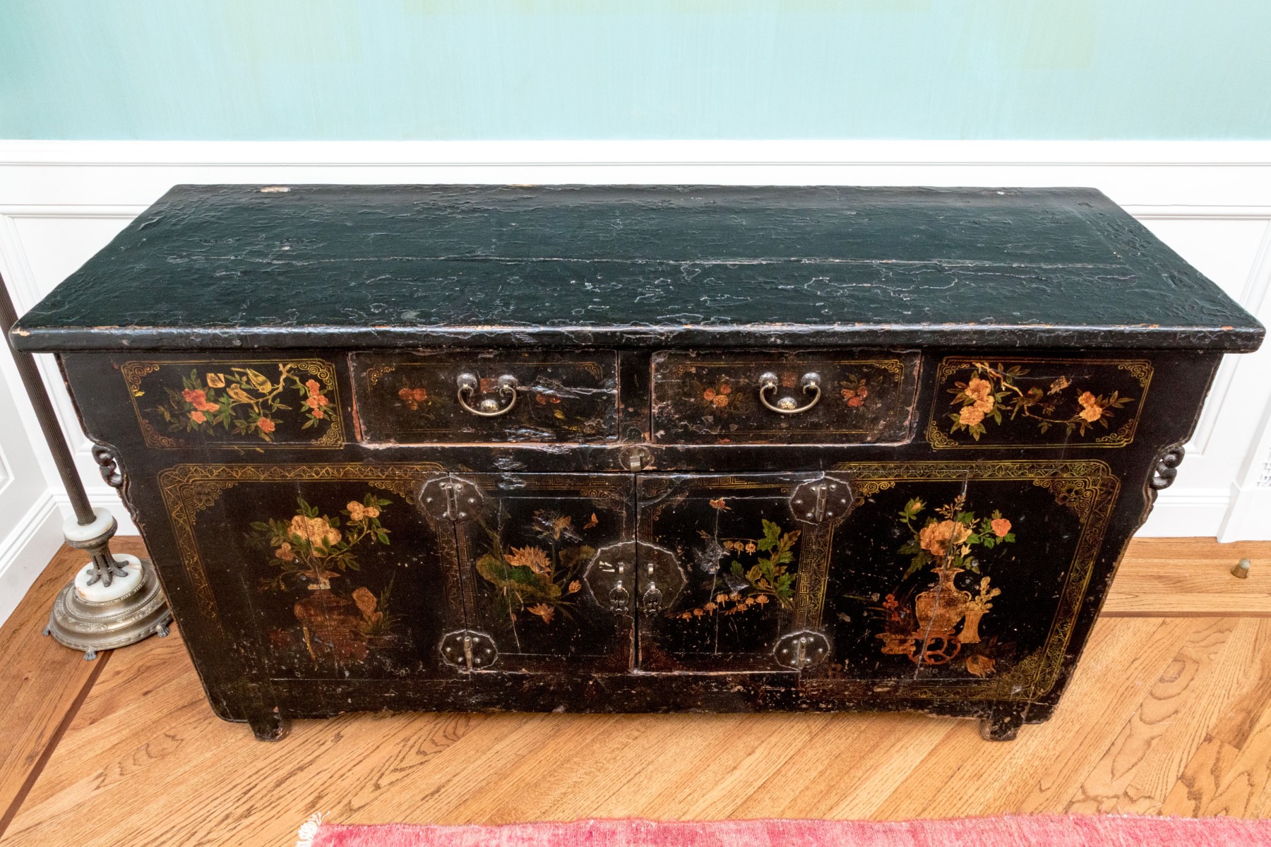 Raised upon four feet, the Asian lacquered wooden altar table or sideboard cabinet has a pair of hinged that open to reveal an interior storage compartment. Above are a pair of drawers with brass lingzhi form swing handles. Atop is a long rectangular top.