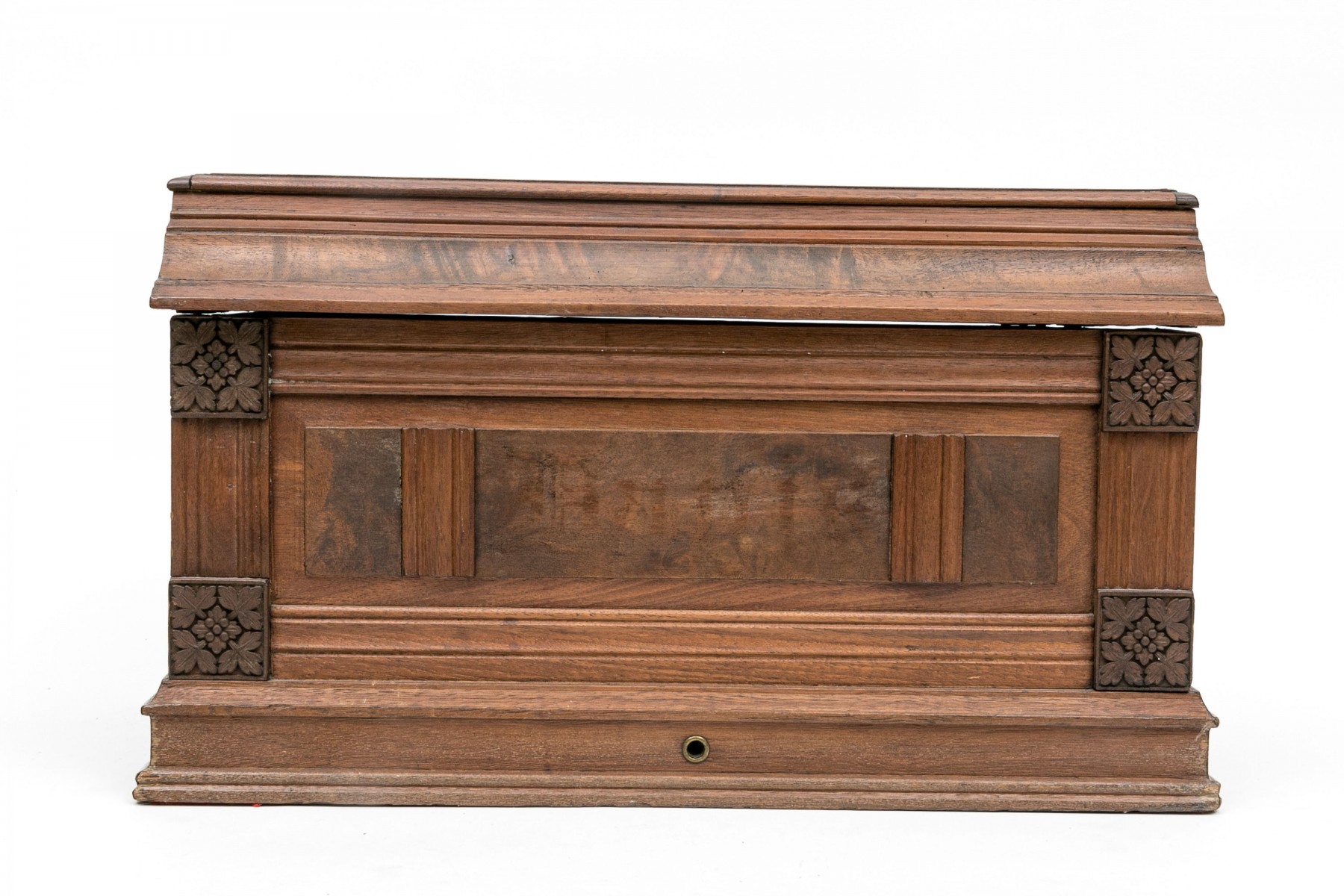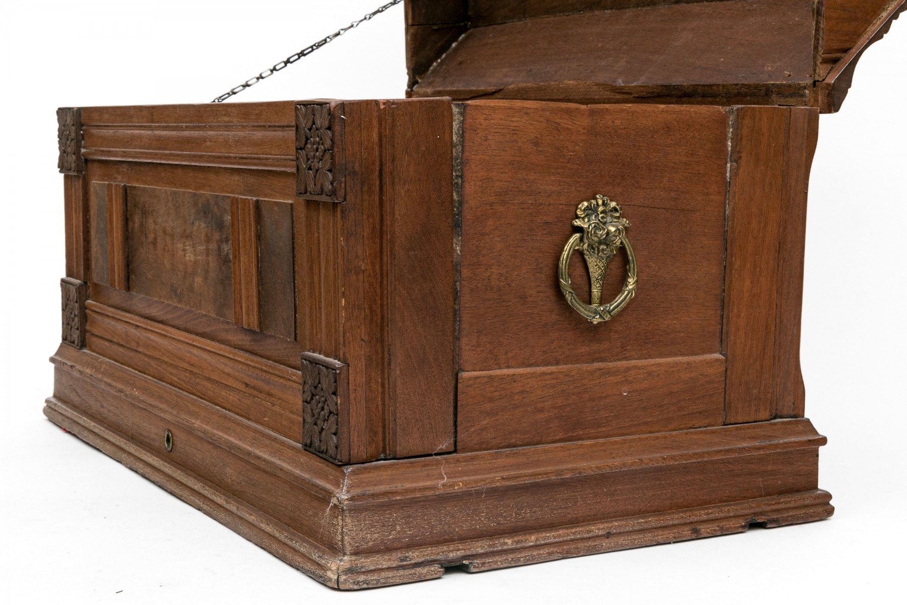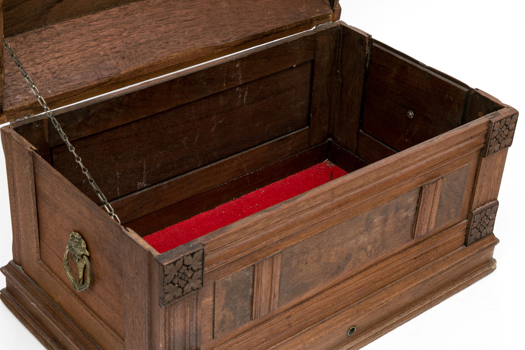 Interior with red velvet lining to bottom. Brass handles on either end. Hinged.