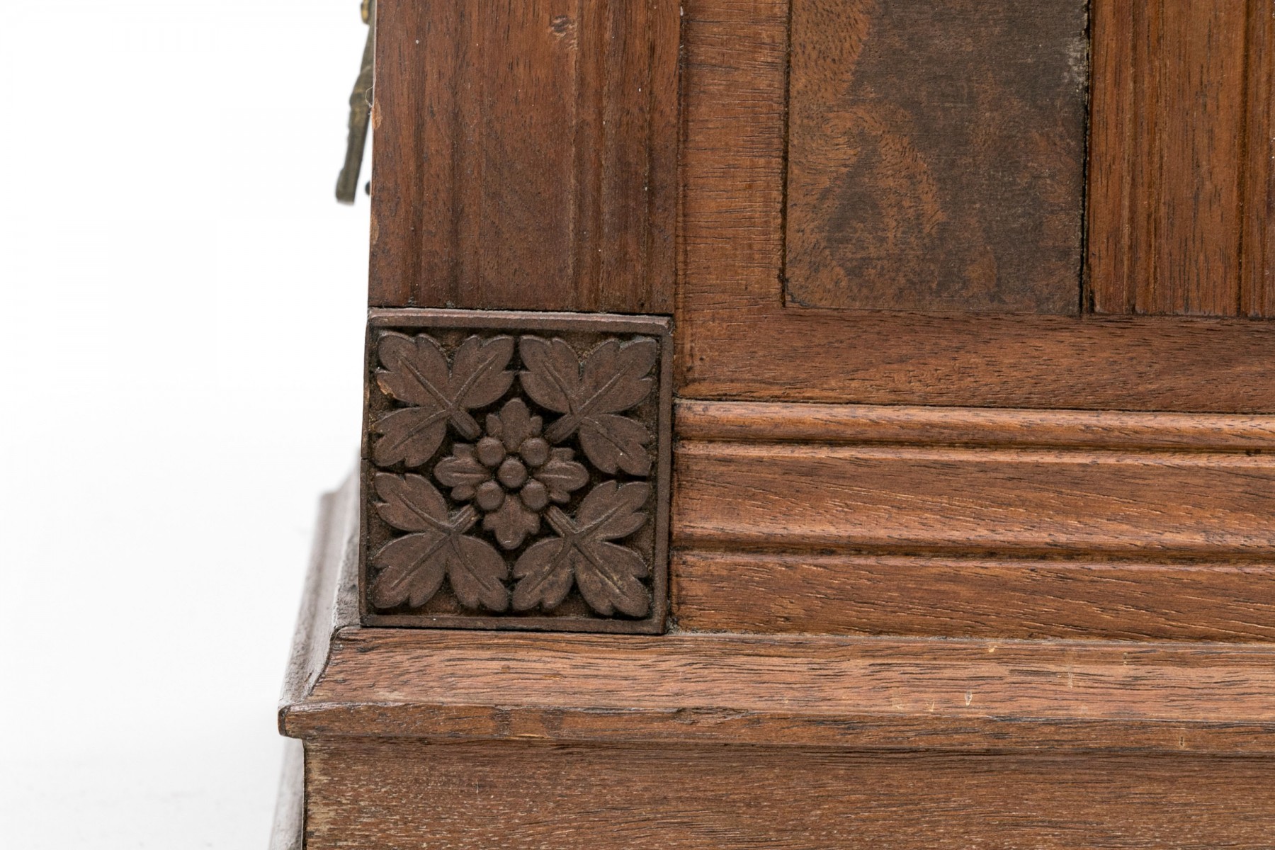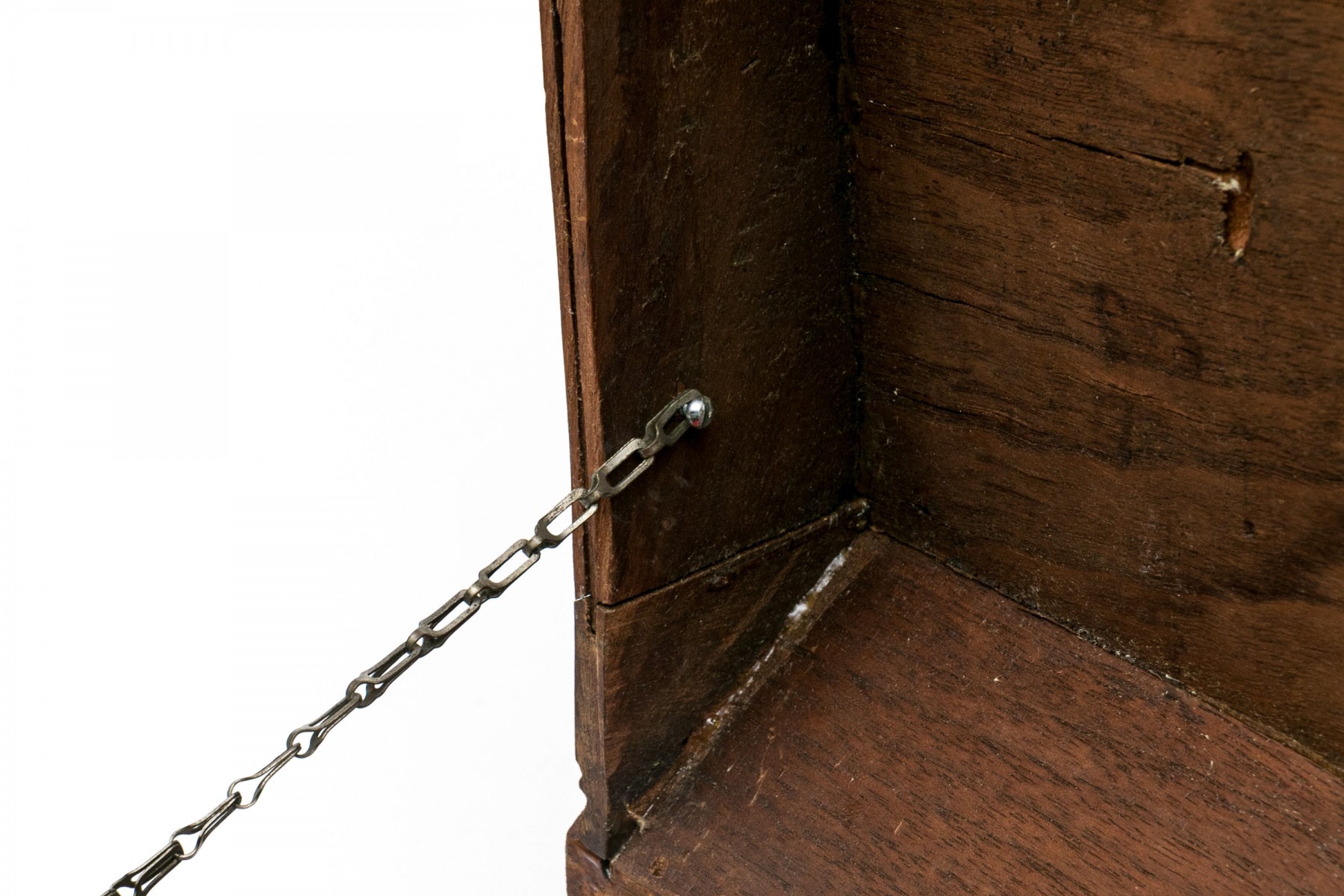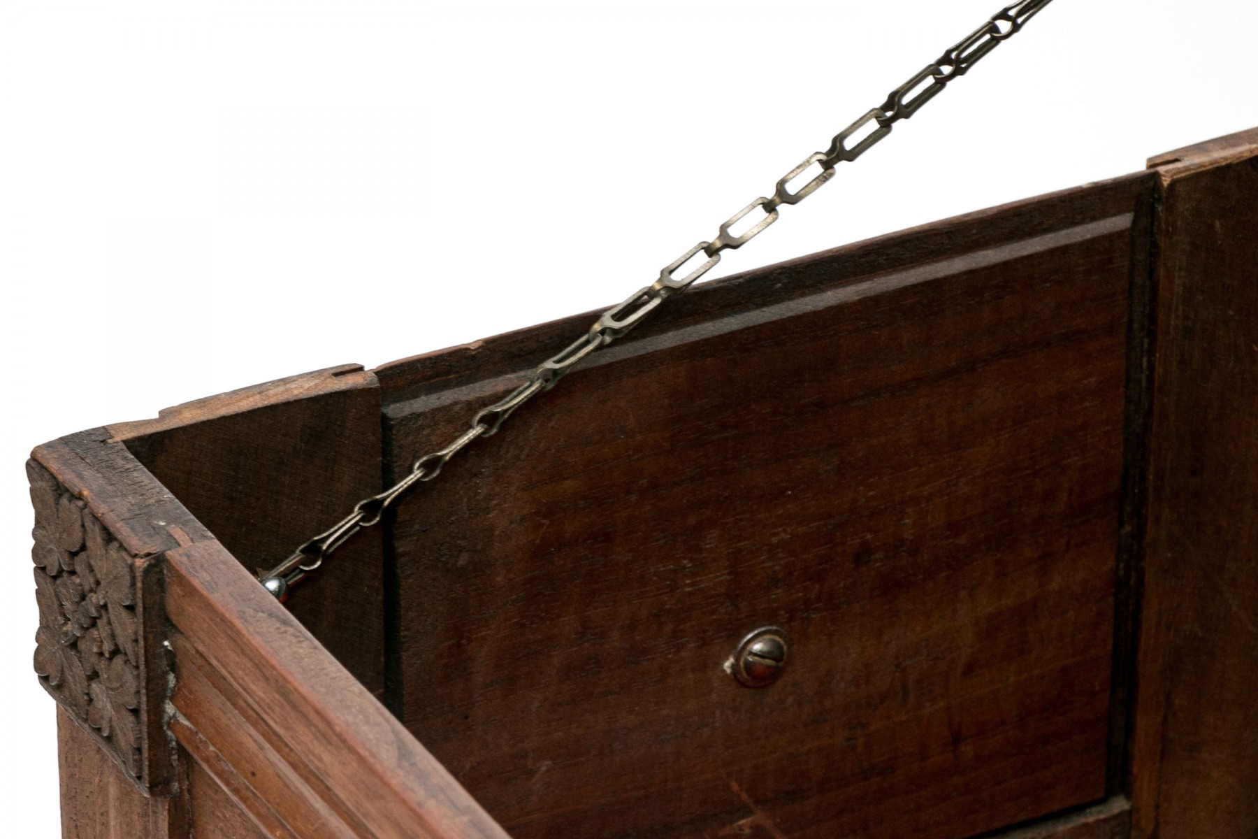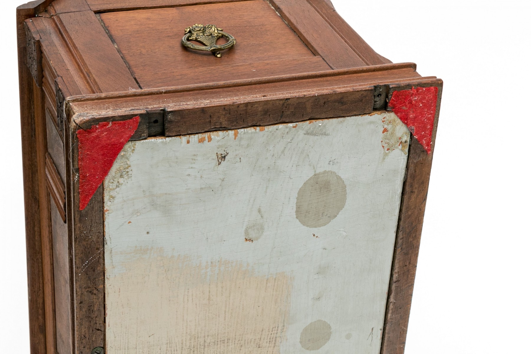 Interior with red velvet lining to bottom. Brass handles on either end. Hinged.
