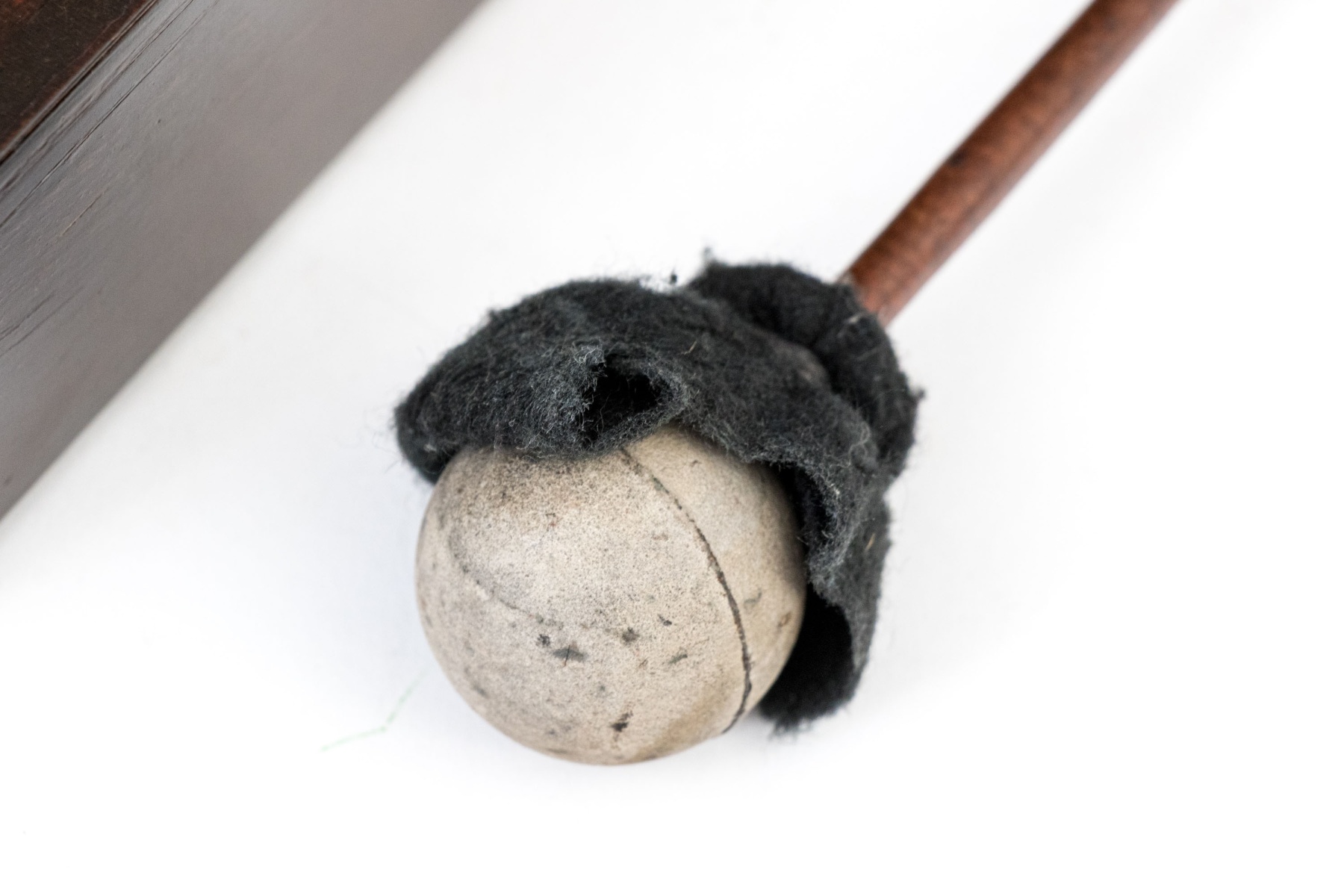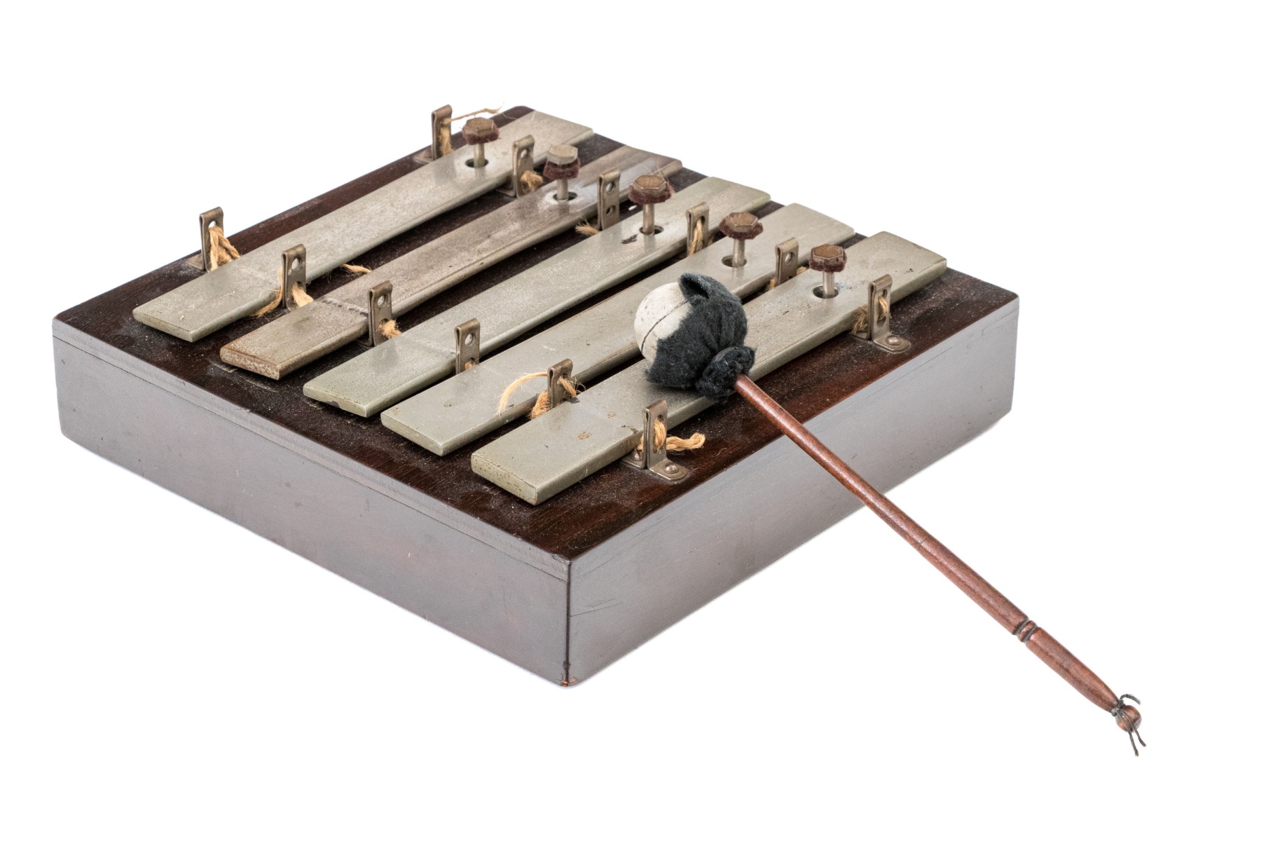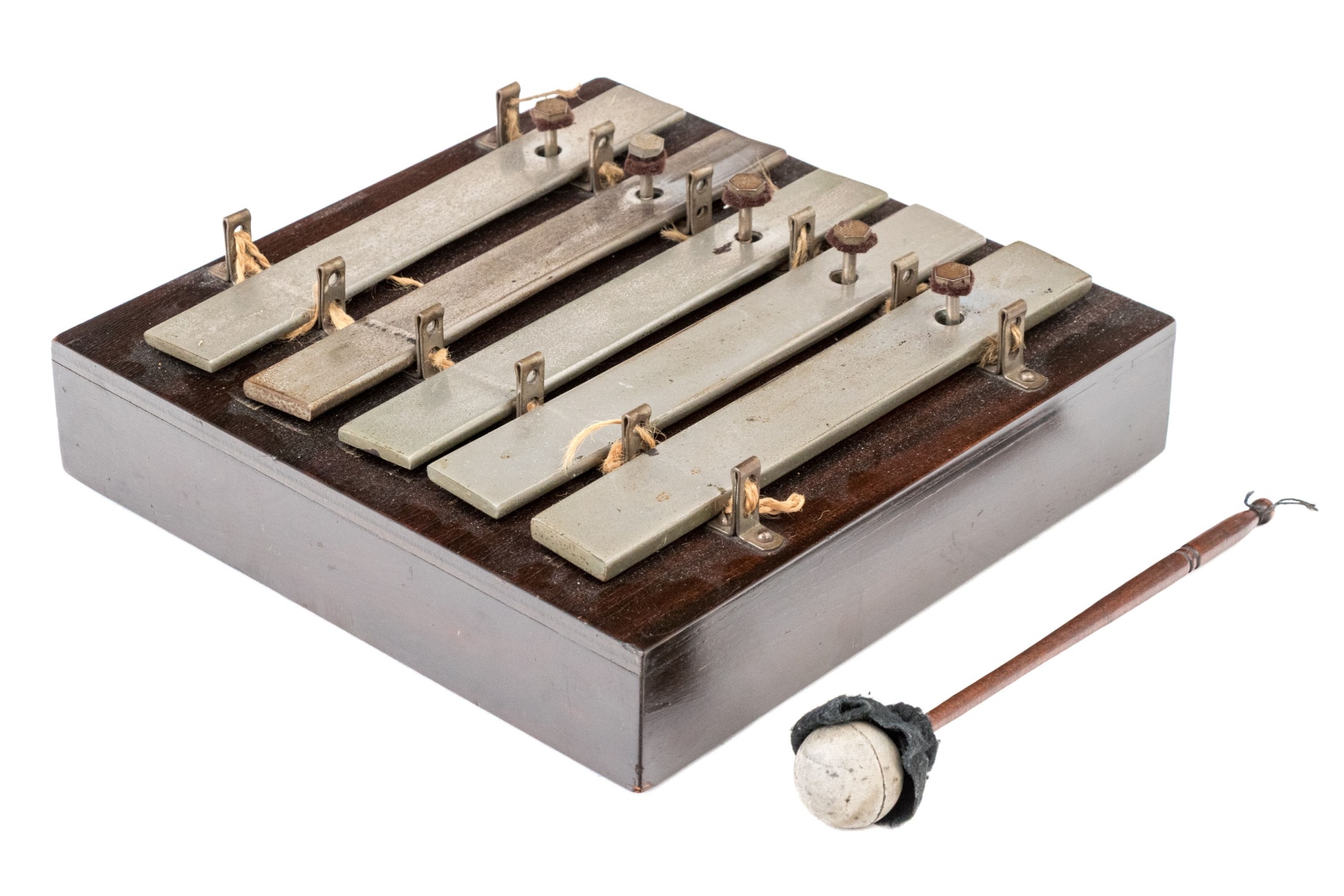 A charming semi-antique butler's dinner chime metallophone with five metal plates on a square wood base, accompanied by a wood-handled mallet for striking.