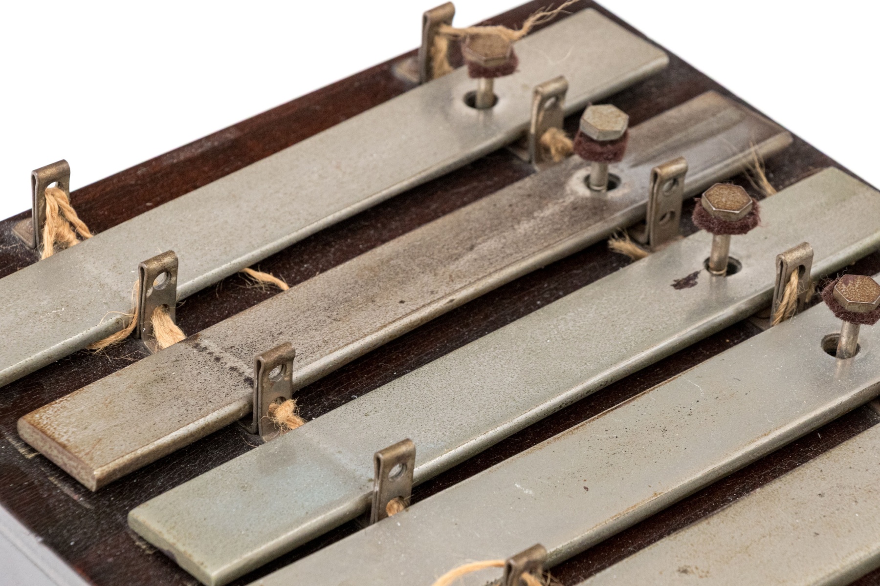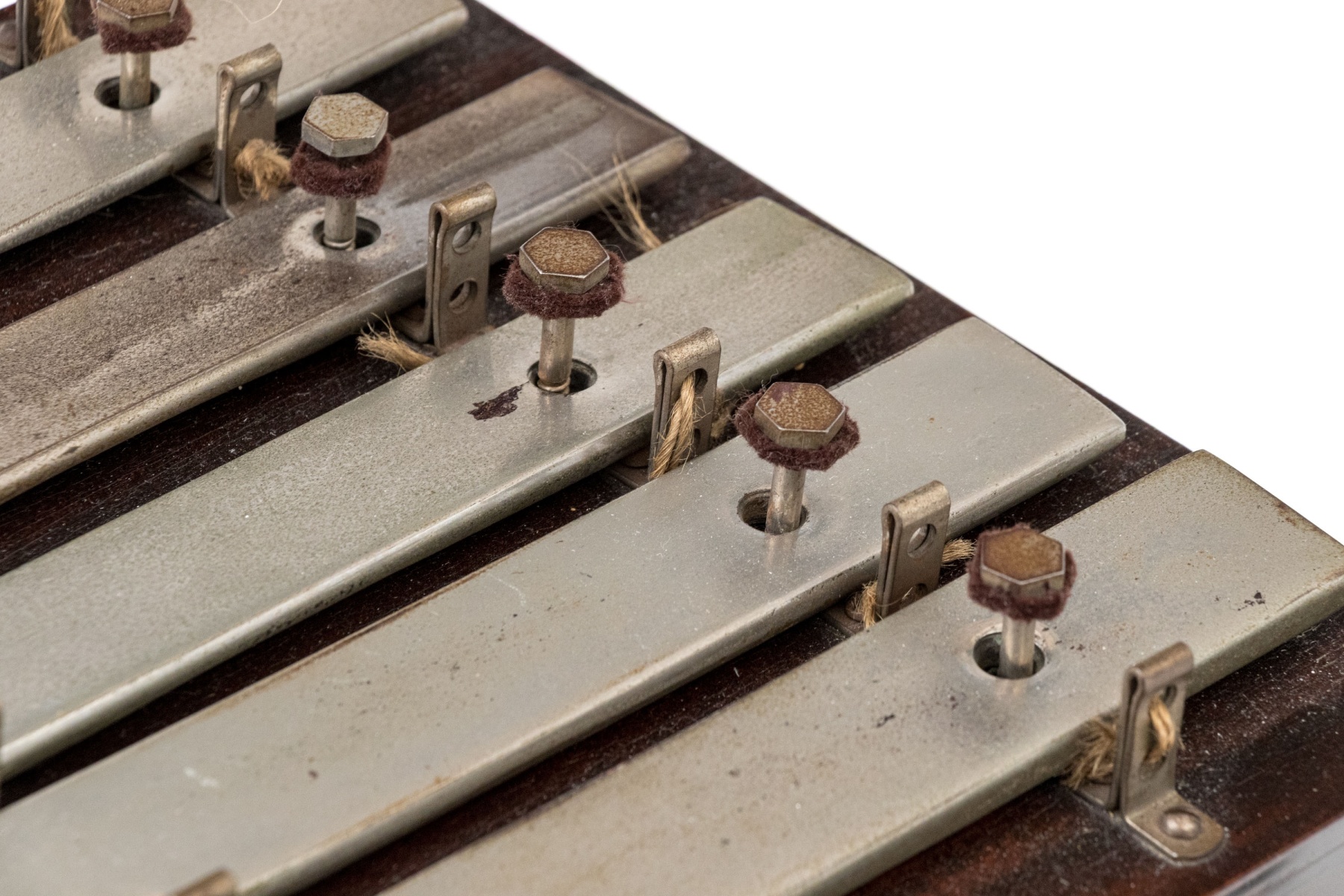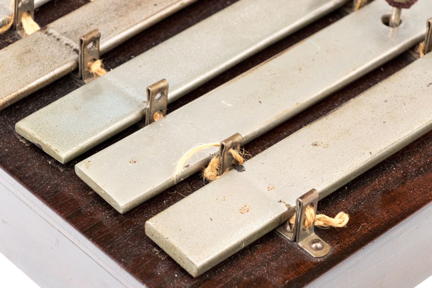 A charming semi-antique butler's dinner chime metallophone with five metal plates on a square wood base, accompanied by a wood-handled mallet for striking.