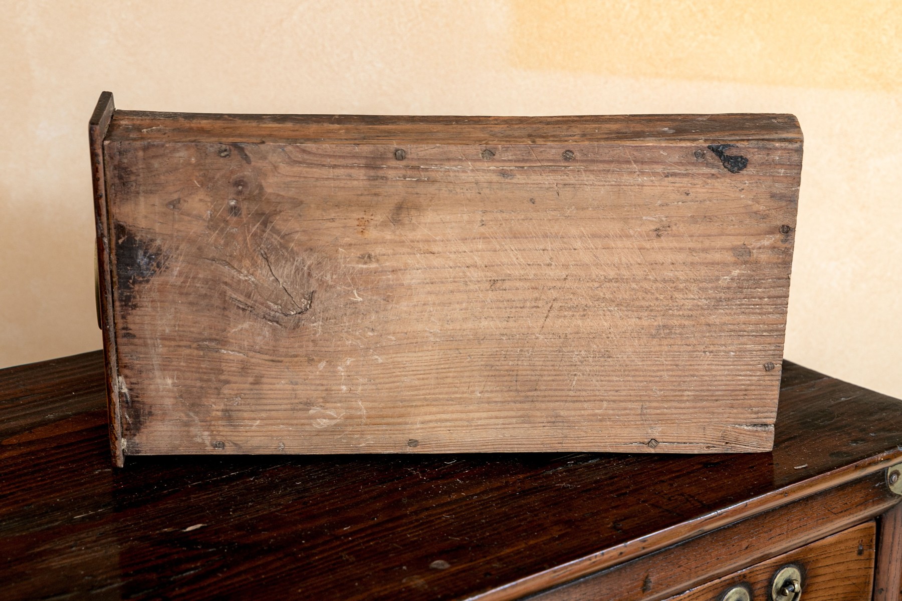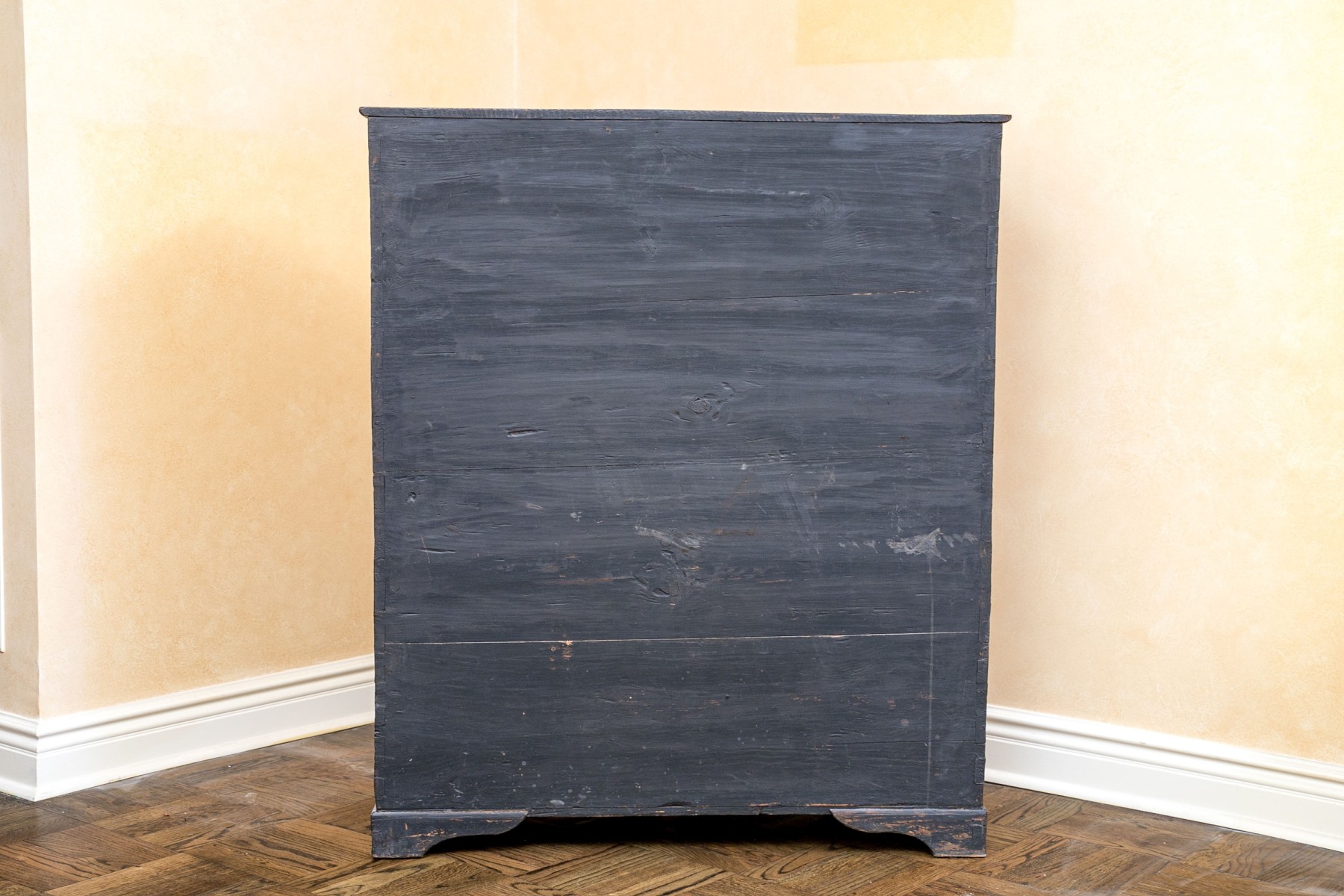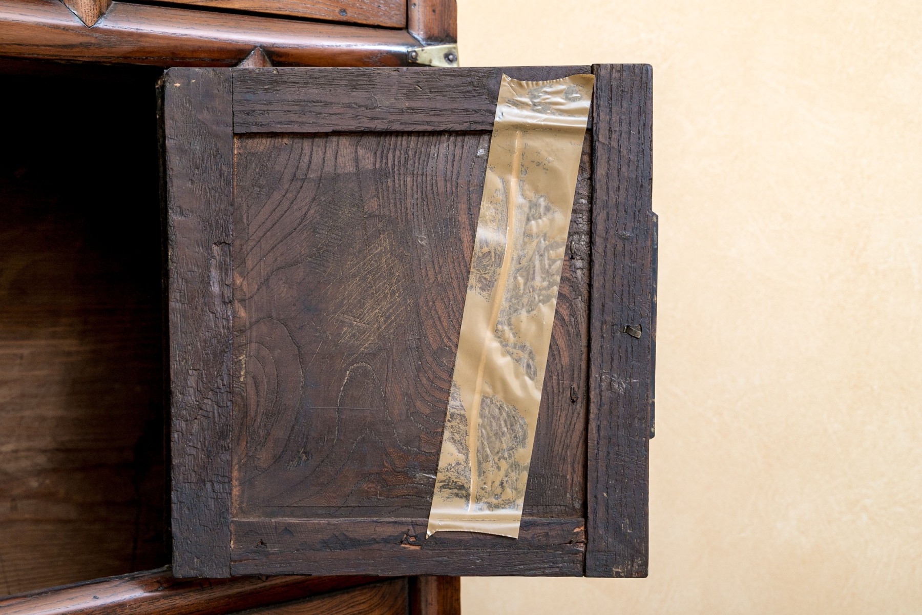 A wonderful piece overall, with some scattered checking including the right upper cabinet door and along the bottom of the lower half chest. Missing some sections, most notably at the center top between the four small drawers.