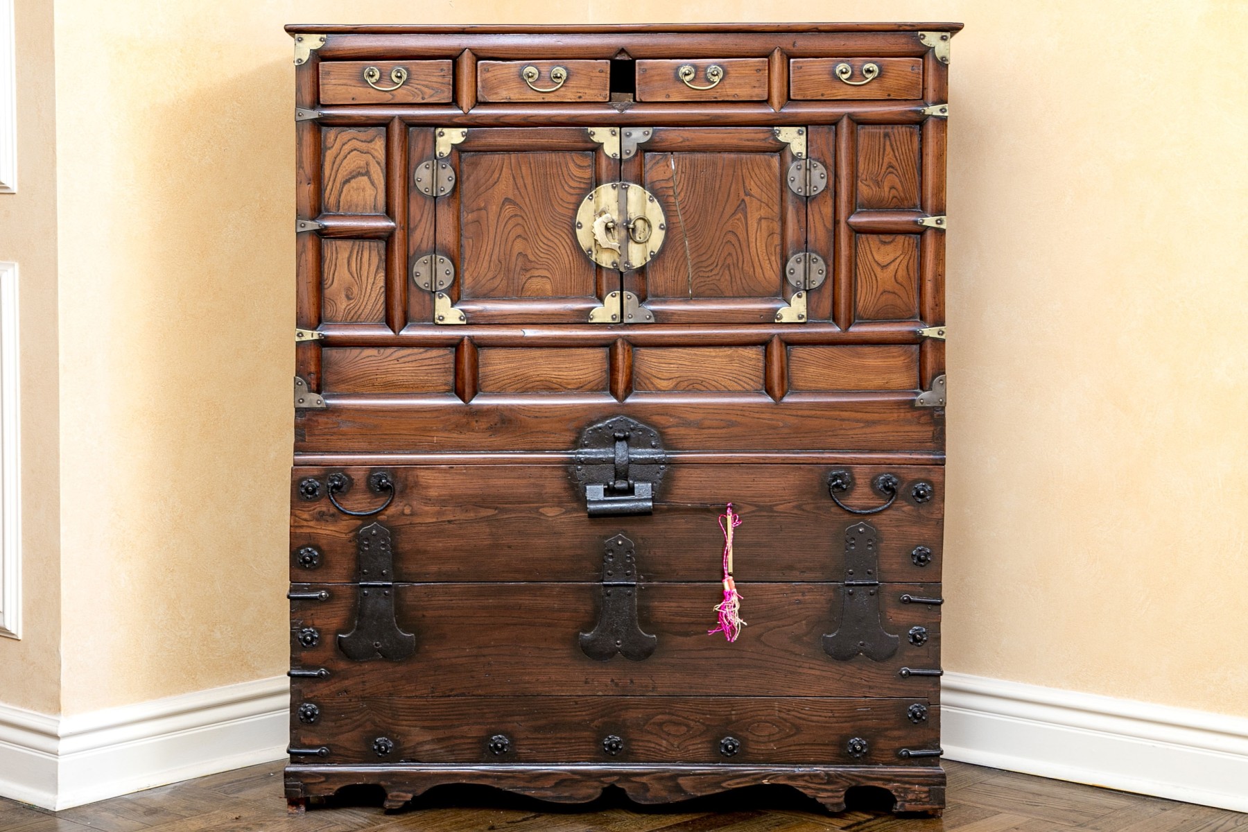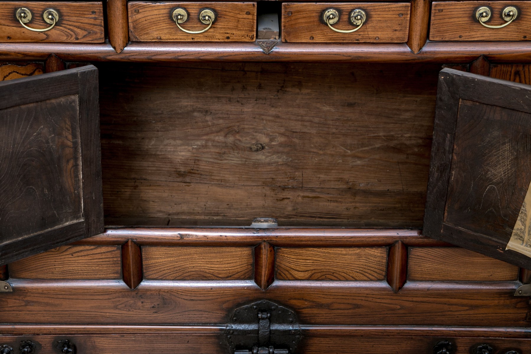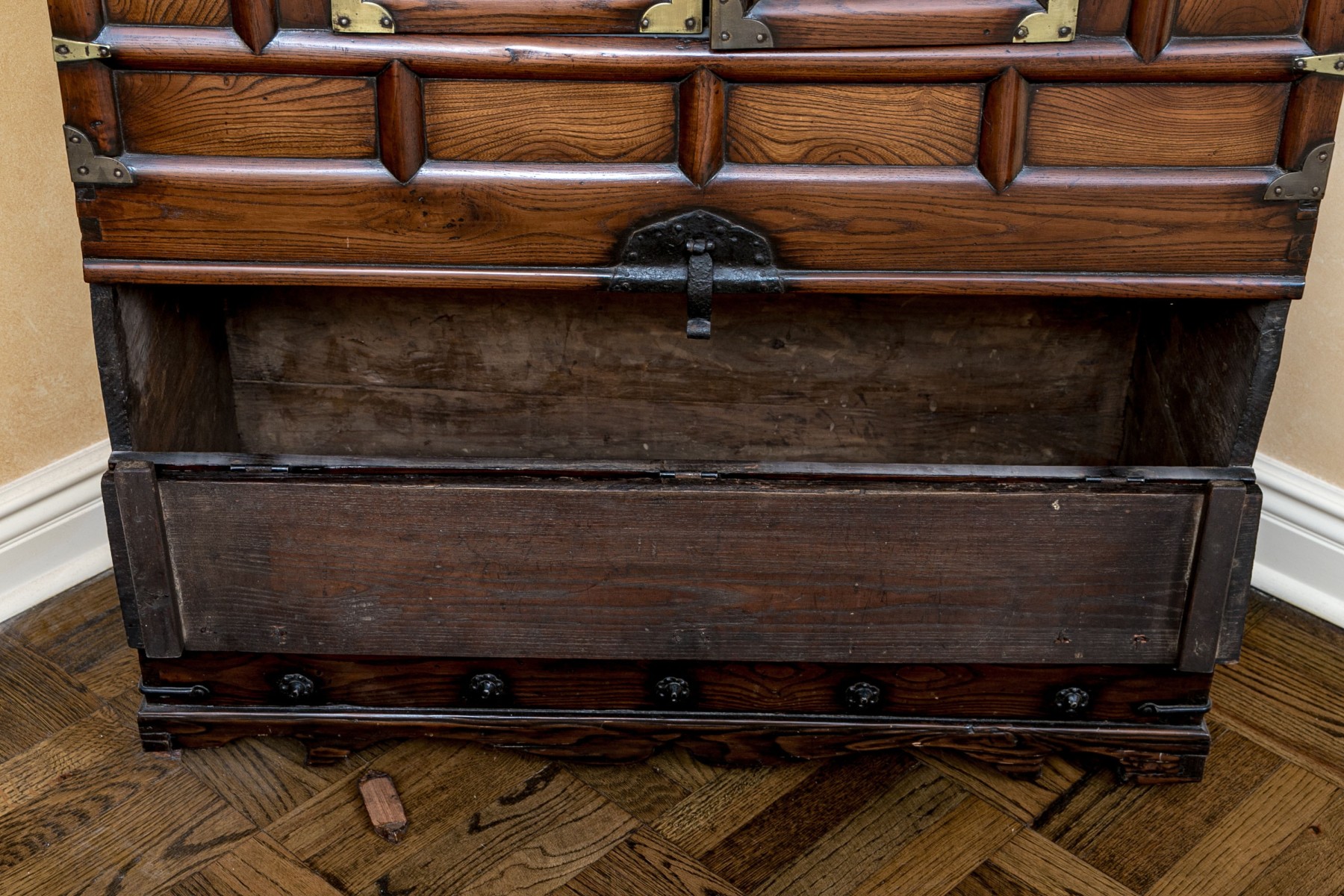 An excellent semi-antique Korean bandaji showcasing an upper half consisting of four drawers over a double-door cabinet, all with brass hardware. The upper half is beautifully detailed with raised borders around panels with eye-catching wood grain. The lower half features a storage chest with a hinged upper door, detailed with decorative rosettes and shapely brackets in a blackened iron finish.