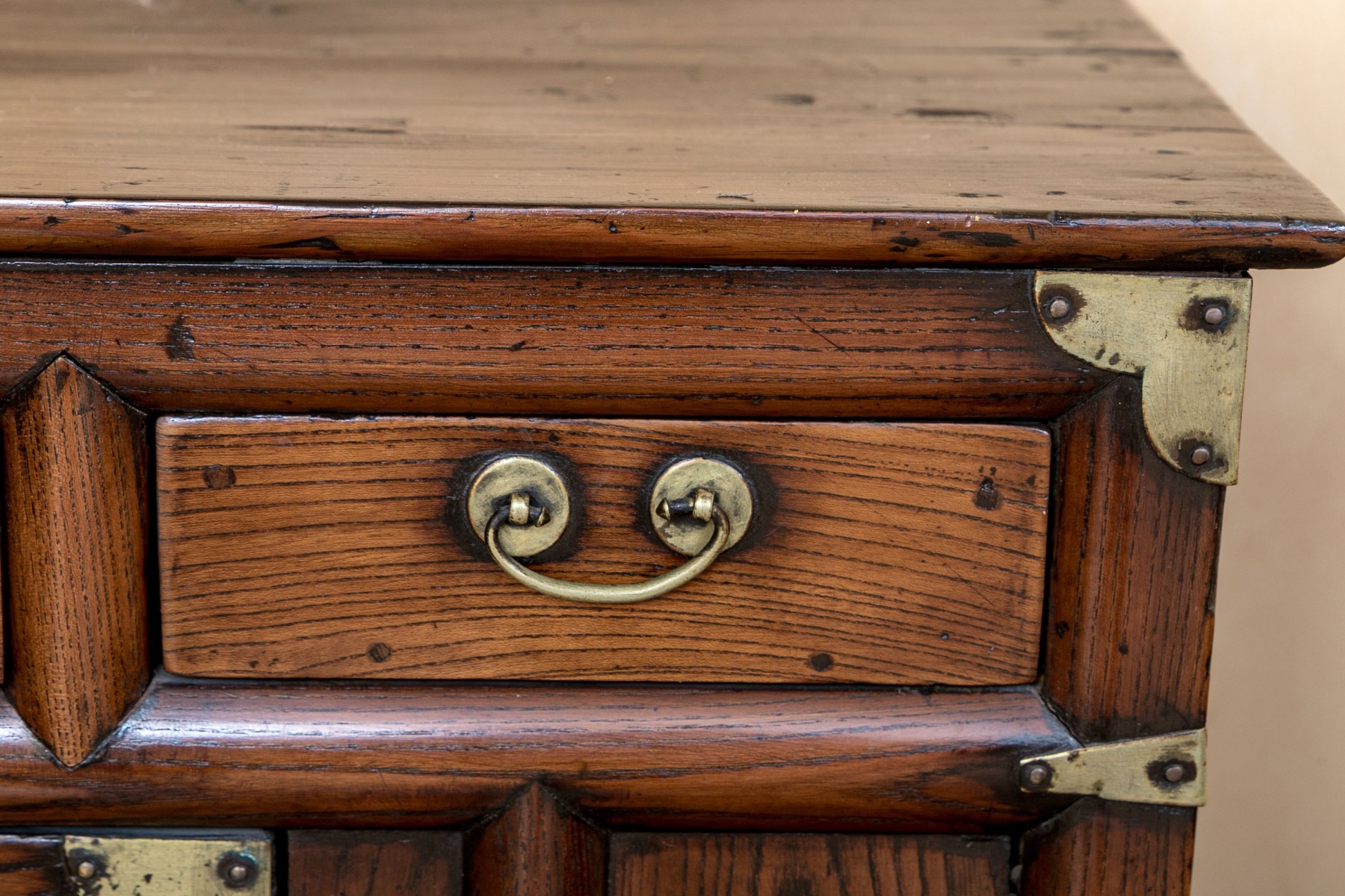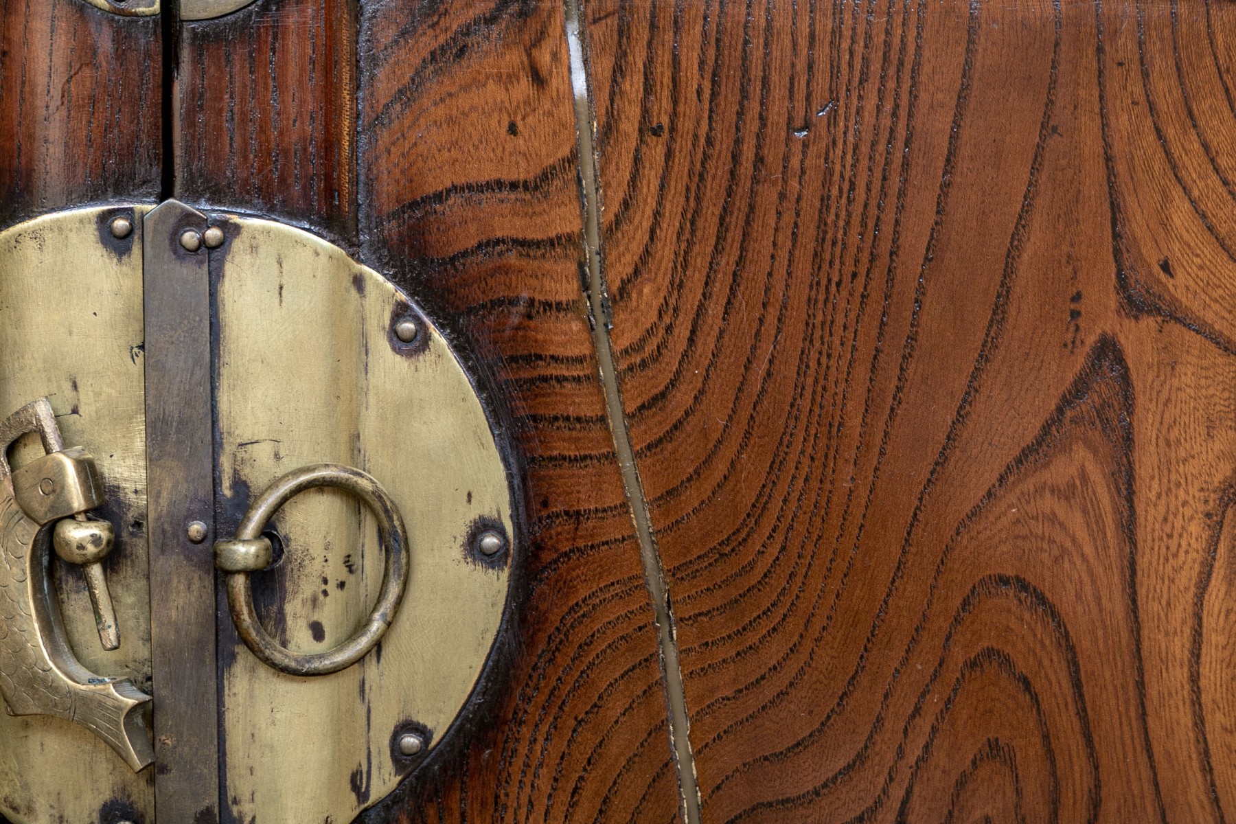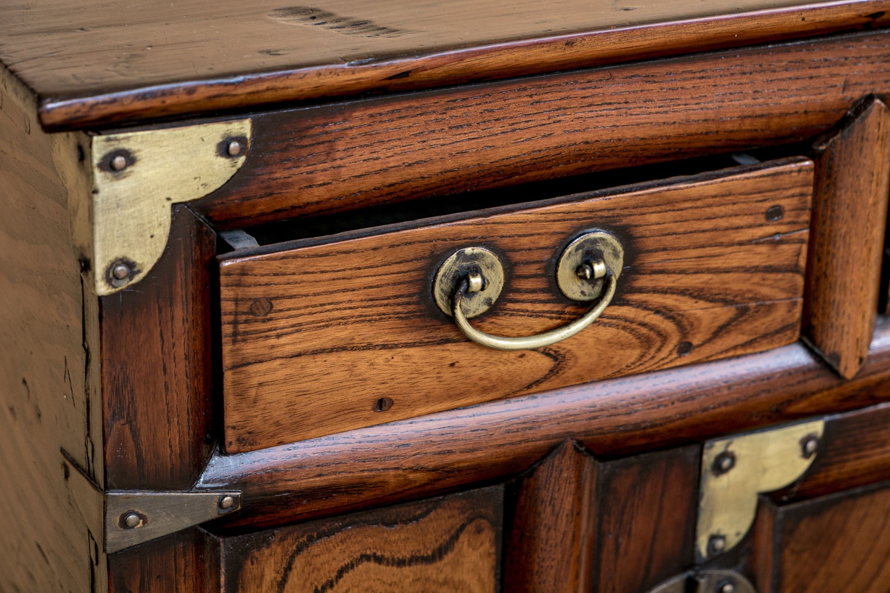 An excellent semi-antique Korean bandaji showcasing an upper half consisting of four drawers over a double-door cabinet, all with brass hardware. The upper half is beautifully detailed with raised borders around panels with eye-catching wood grain. The lower half features a storage chest with a hinged upper door, detailed with decorative rosettes and shapely brackets in a blackened iron finish.