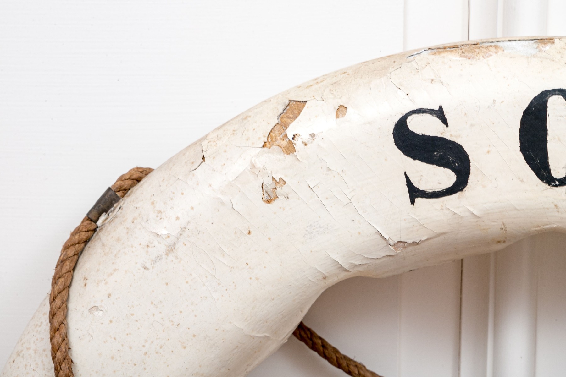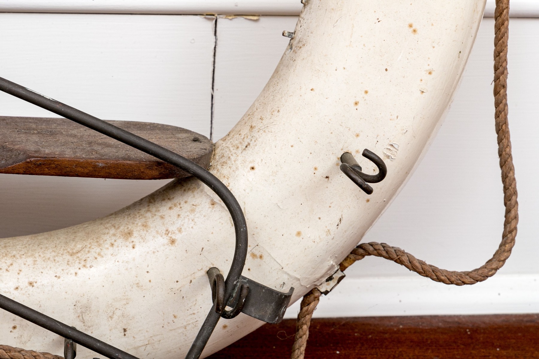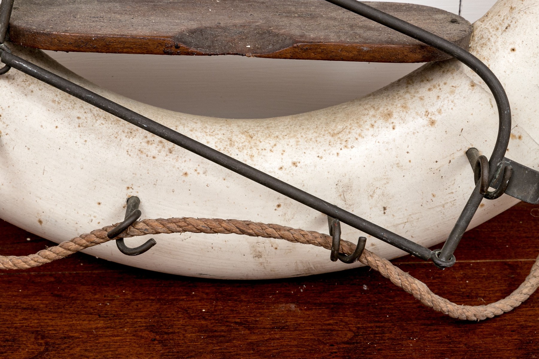 There is wear to the white finish, with losses and cracking to the paint. Mould or foxed spots and wear to the rope all consistent with age and use.