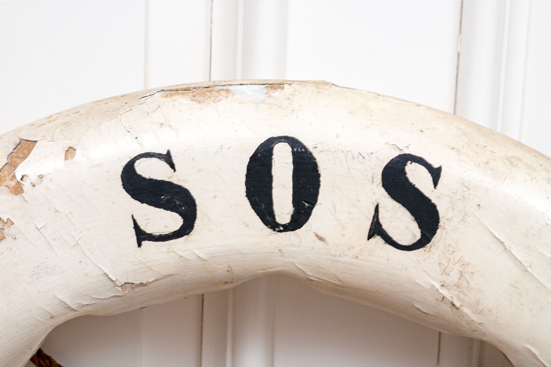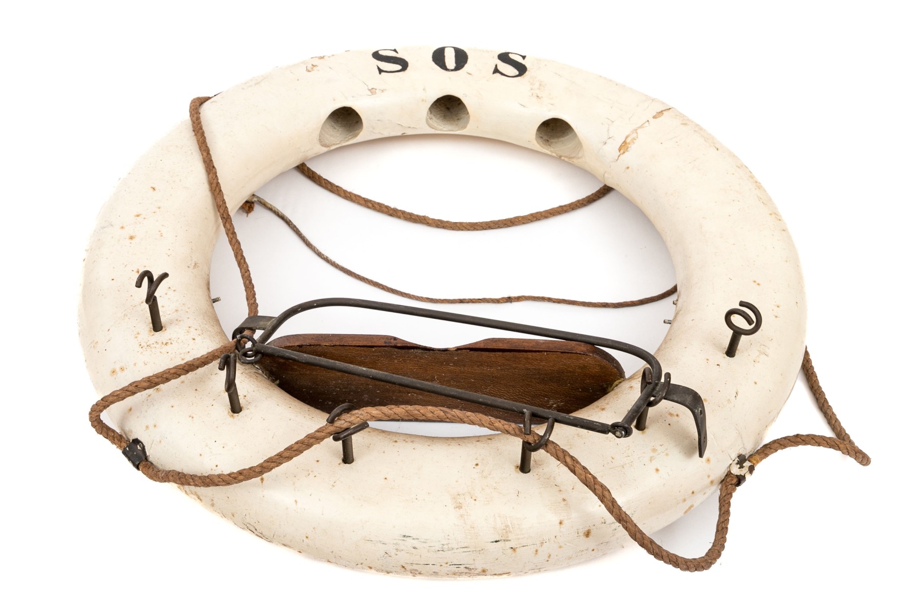 The white ring form life bouy, is marked in black SOS with six metallic fittings for rope to be strung through with a metallic mounted section to mount to the deck.