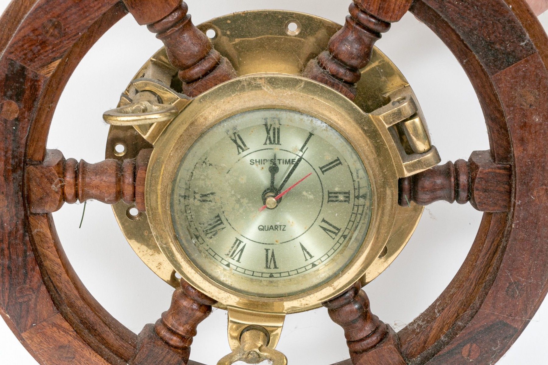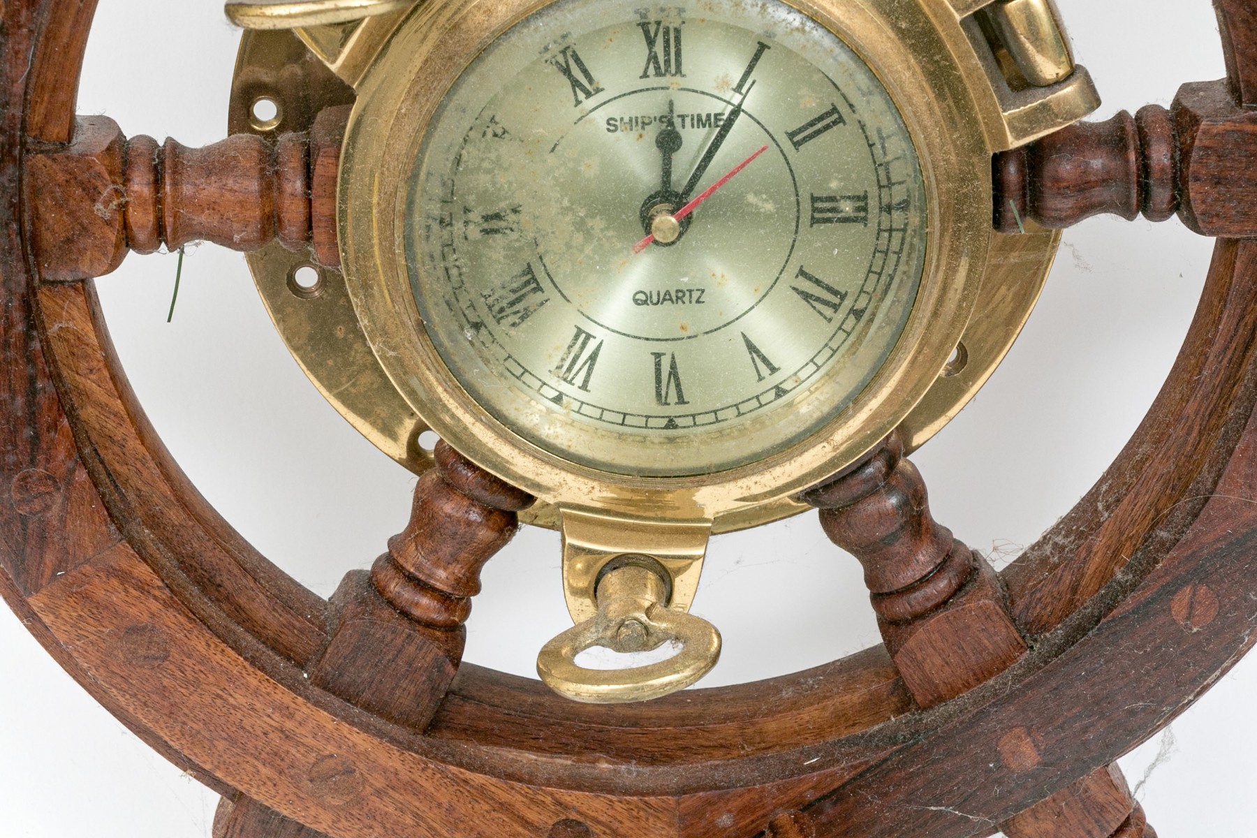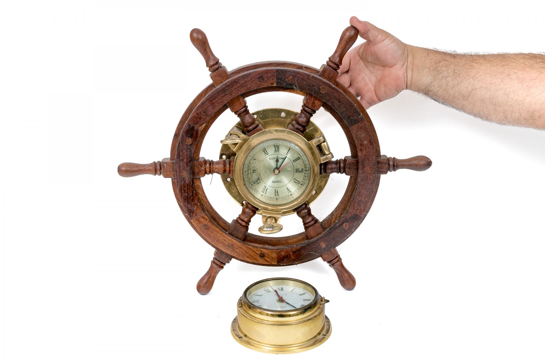 Together with a wood, brass and glass fantastic clock set in the center of a ships wheel. The thickly cast and impressively made clock is "Shiptime / Quartz".