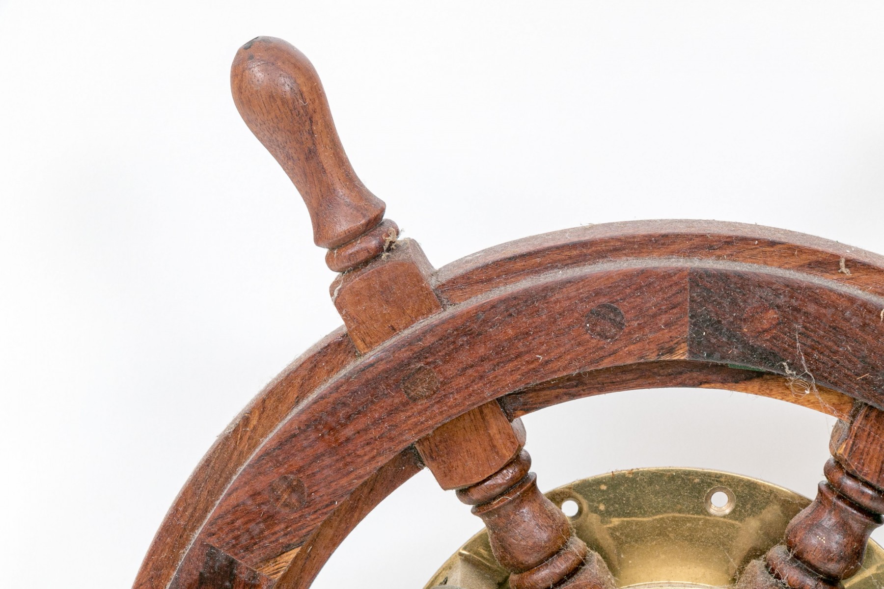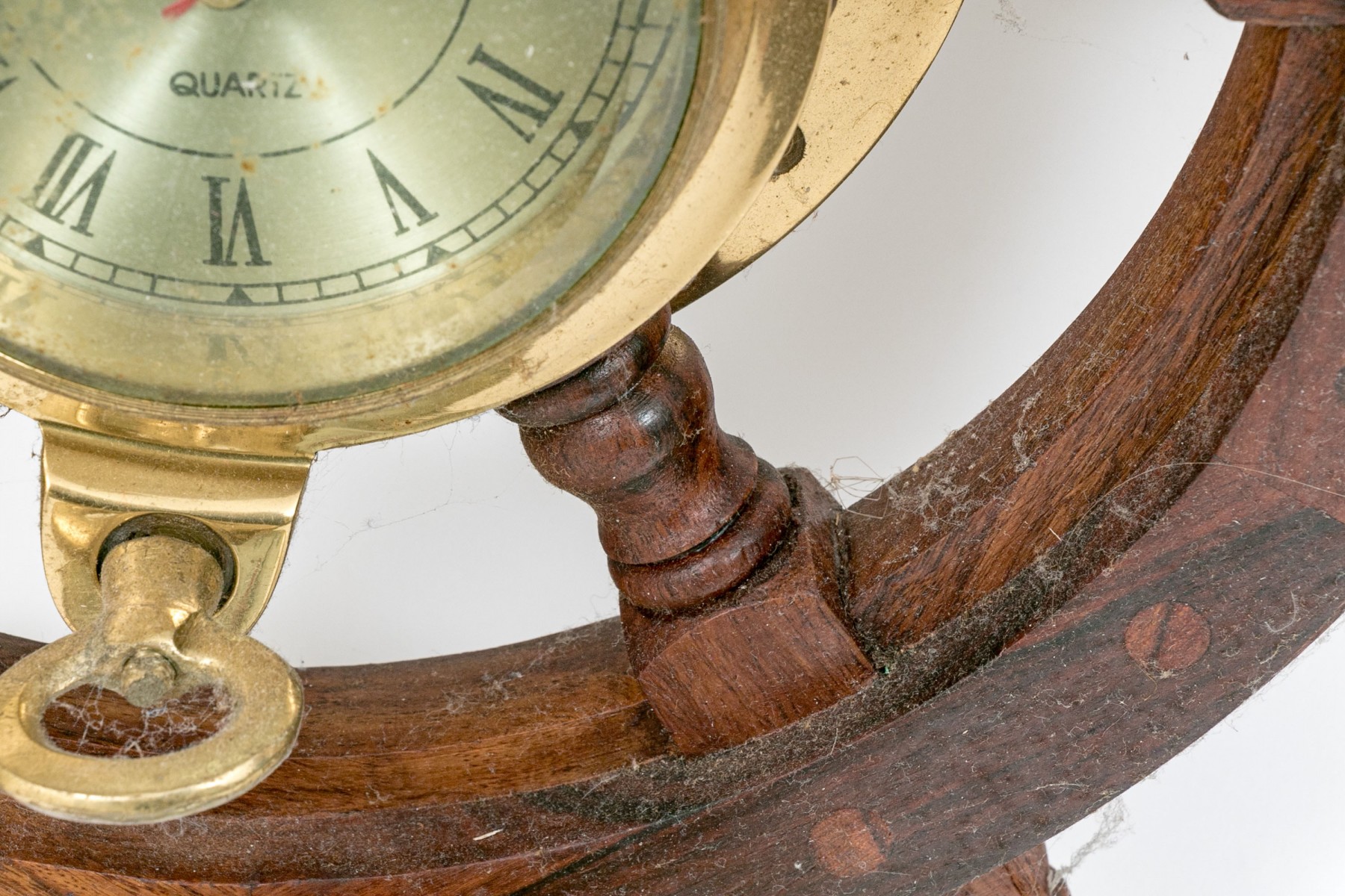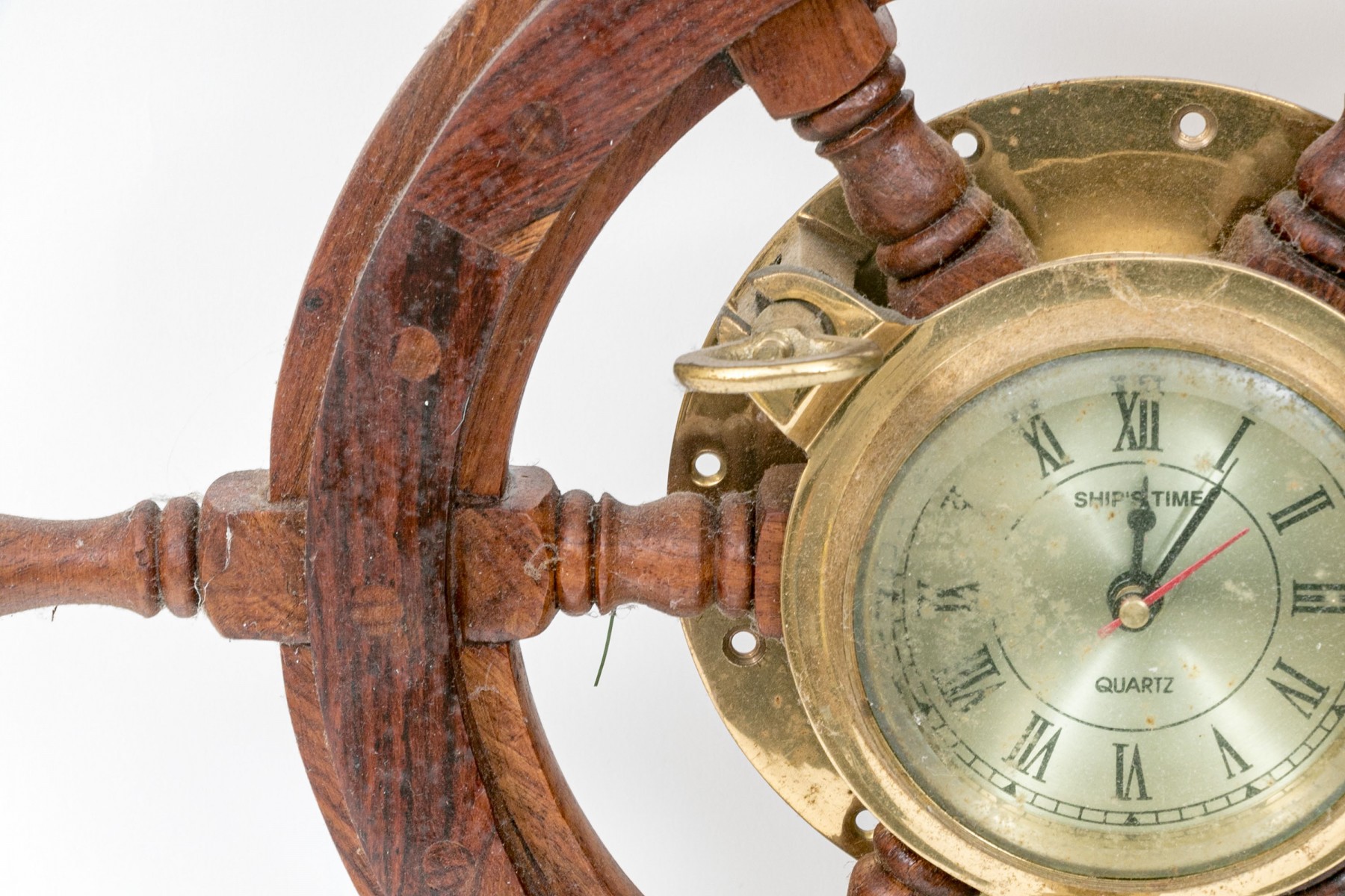 Together with a wood, brass and glass fantastic clock set in the center of a ships wheel. The thickly cast and impressively made clock is "Shiptime / Quartz".