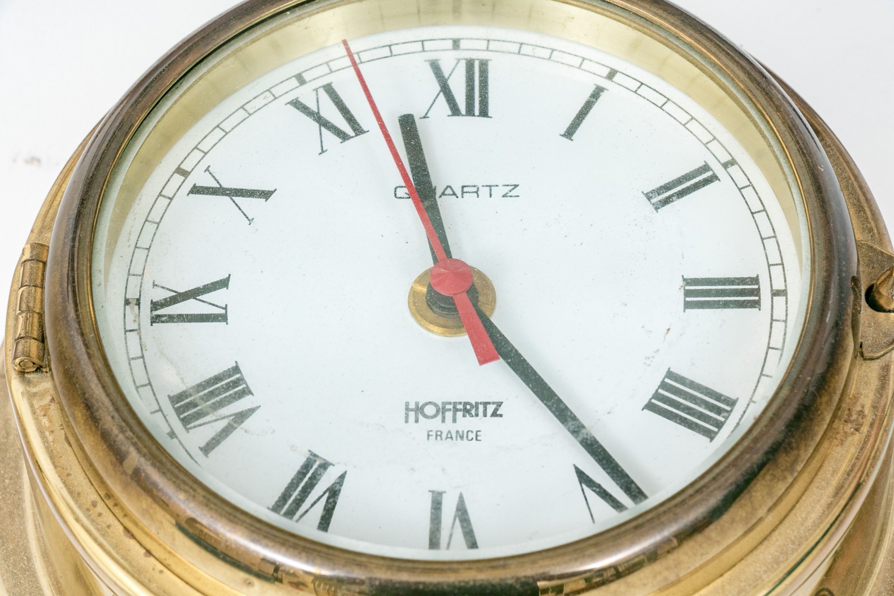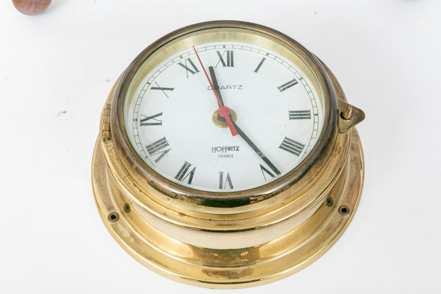 Including a brass and glass porthole style clock by "Hoffritz / France", with hinged door.