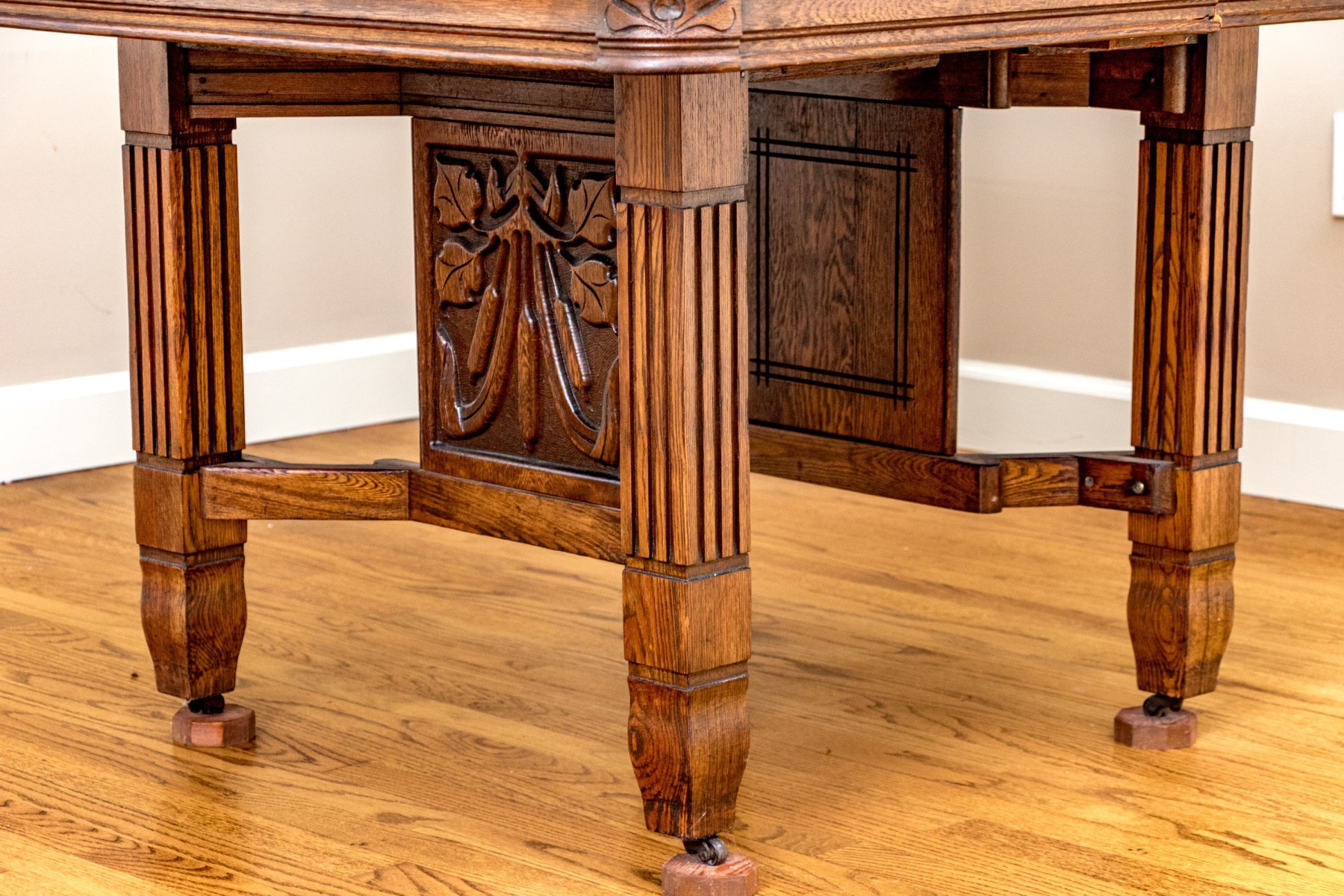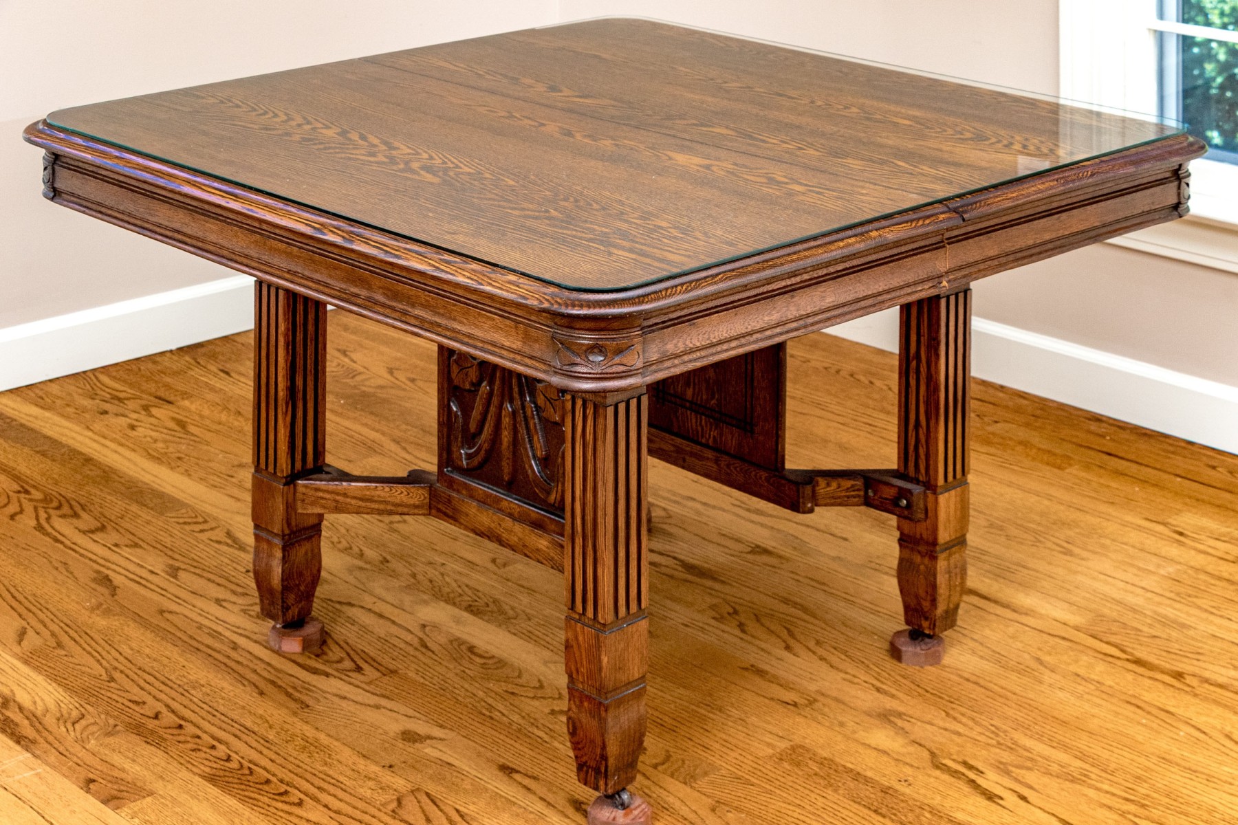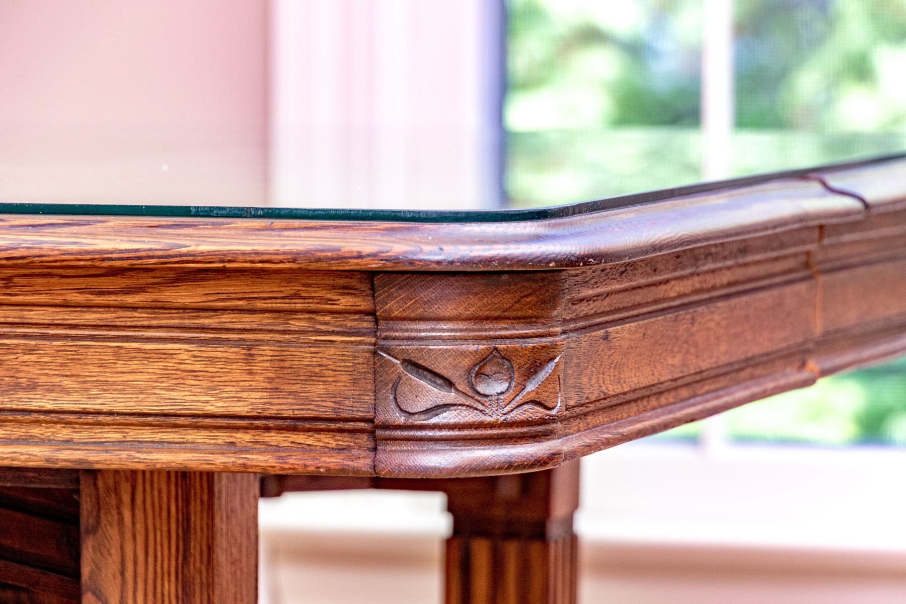 A fabulous extension dining table with Art Deco flare, finely constructed in warm-toned medium brown oak. The table features a glass top over a rounded corner square form with decorative carving at the corners, raised four fluted rectangular legs around eye-catching recessed supports showcasing rectangular panels carved with elegant foliate flourishes. A fifth leg extends down for additional support. Does not include any extension leaves.