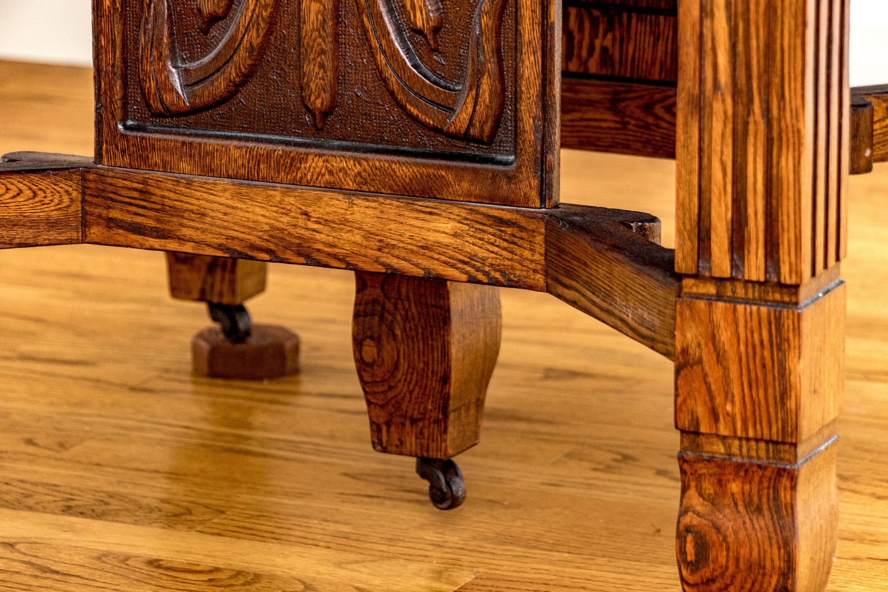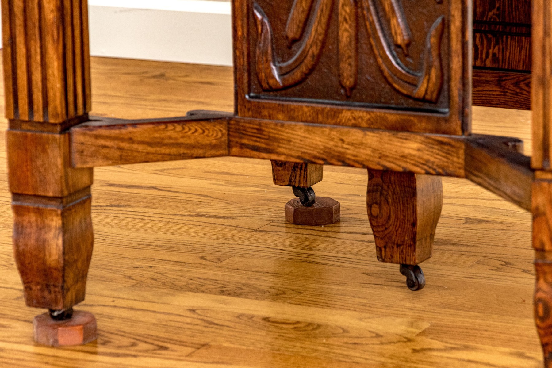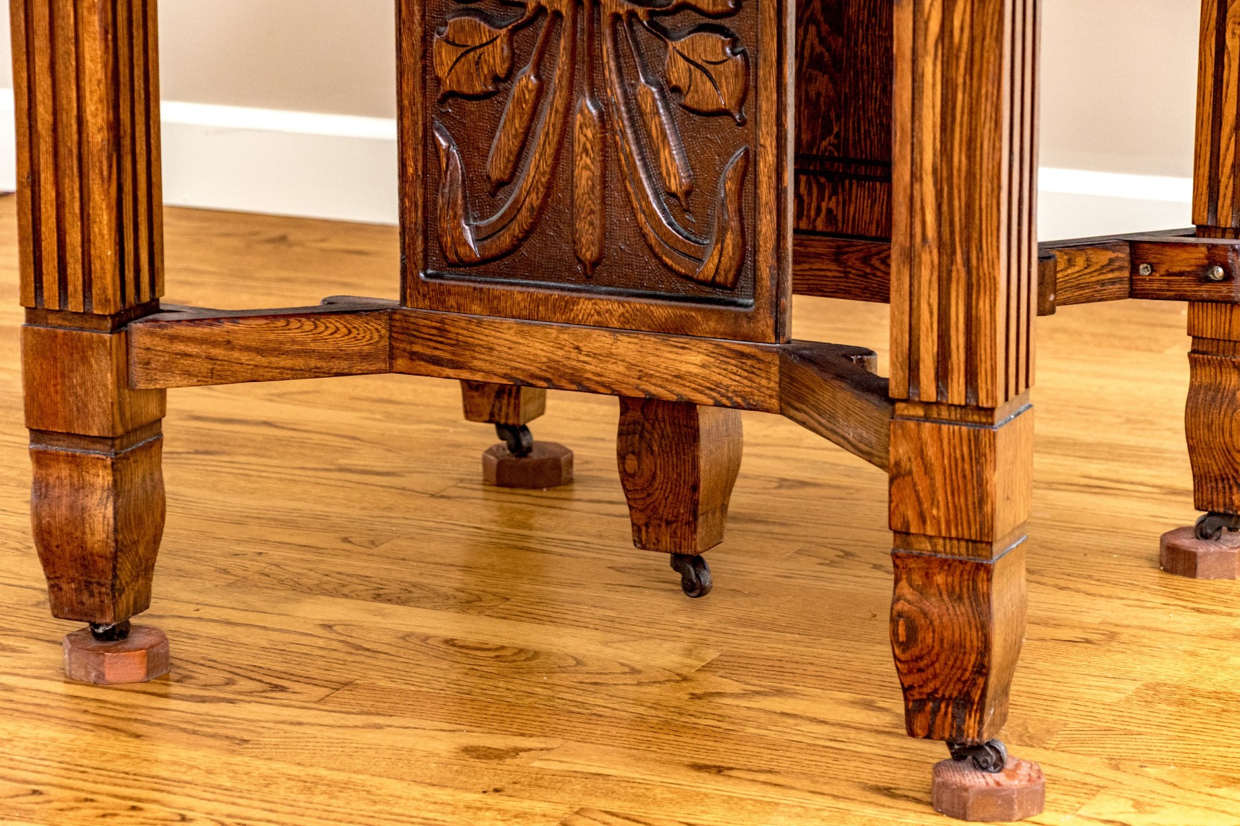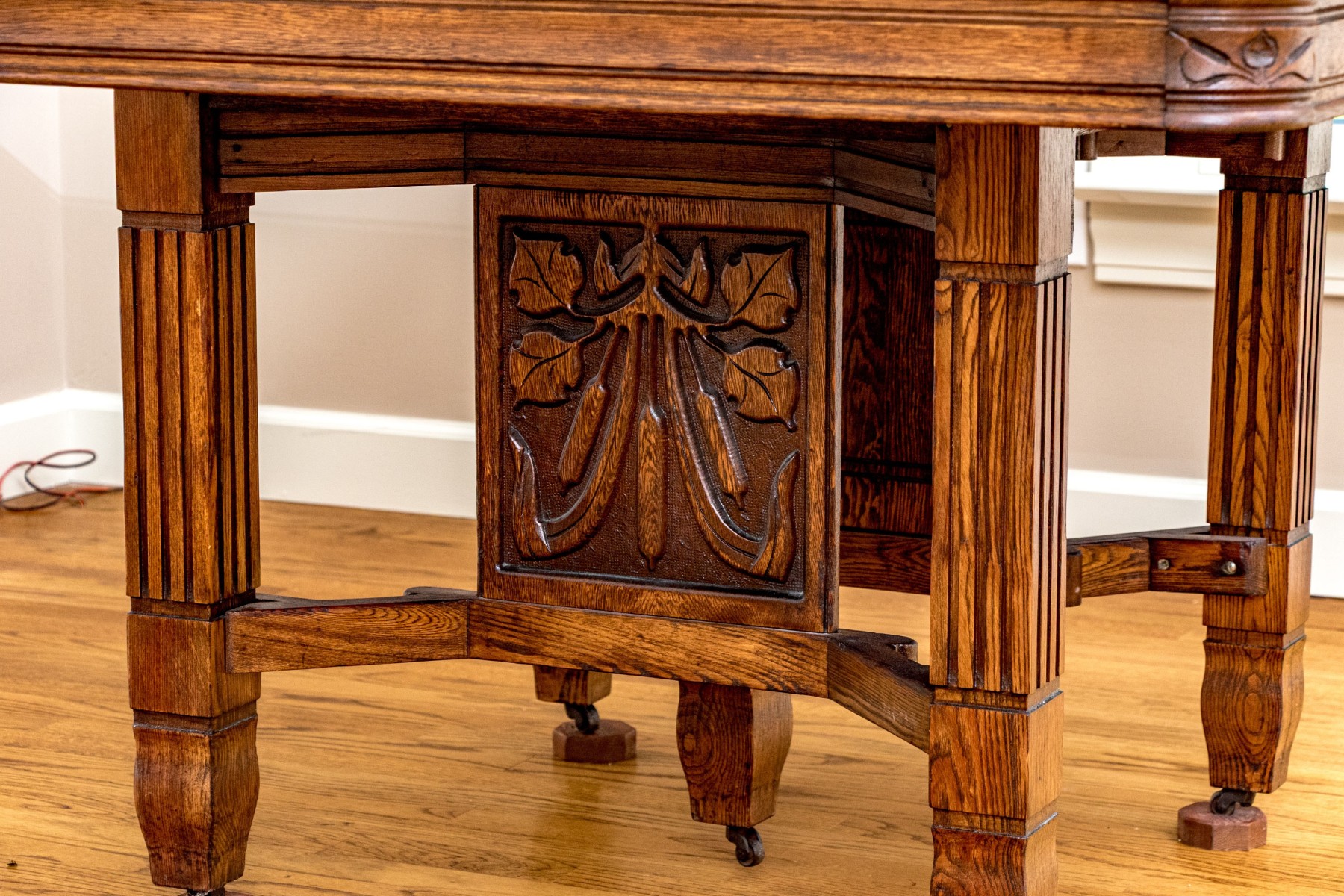 A fabulous extension dining table with Art Deco flare, finely constructed in warm-toned medium brown oak. The table features a glass top over a rounded corner square form with decorative carving at the corners, raised four fluted rectangular legs around eye-catching recessed supports showcasing rectangular panels carved with elegant foliate flourishes. A fifth leg extends down for additional support. Does not include any extension leaves.