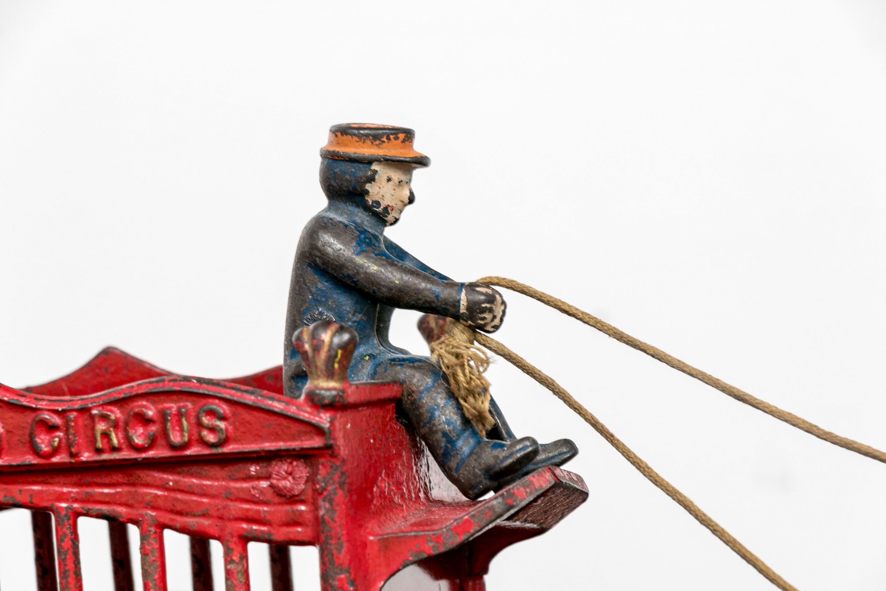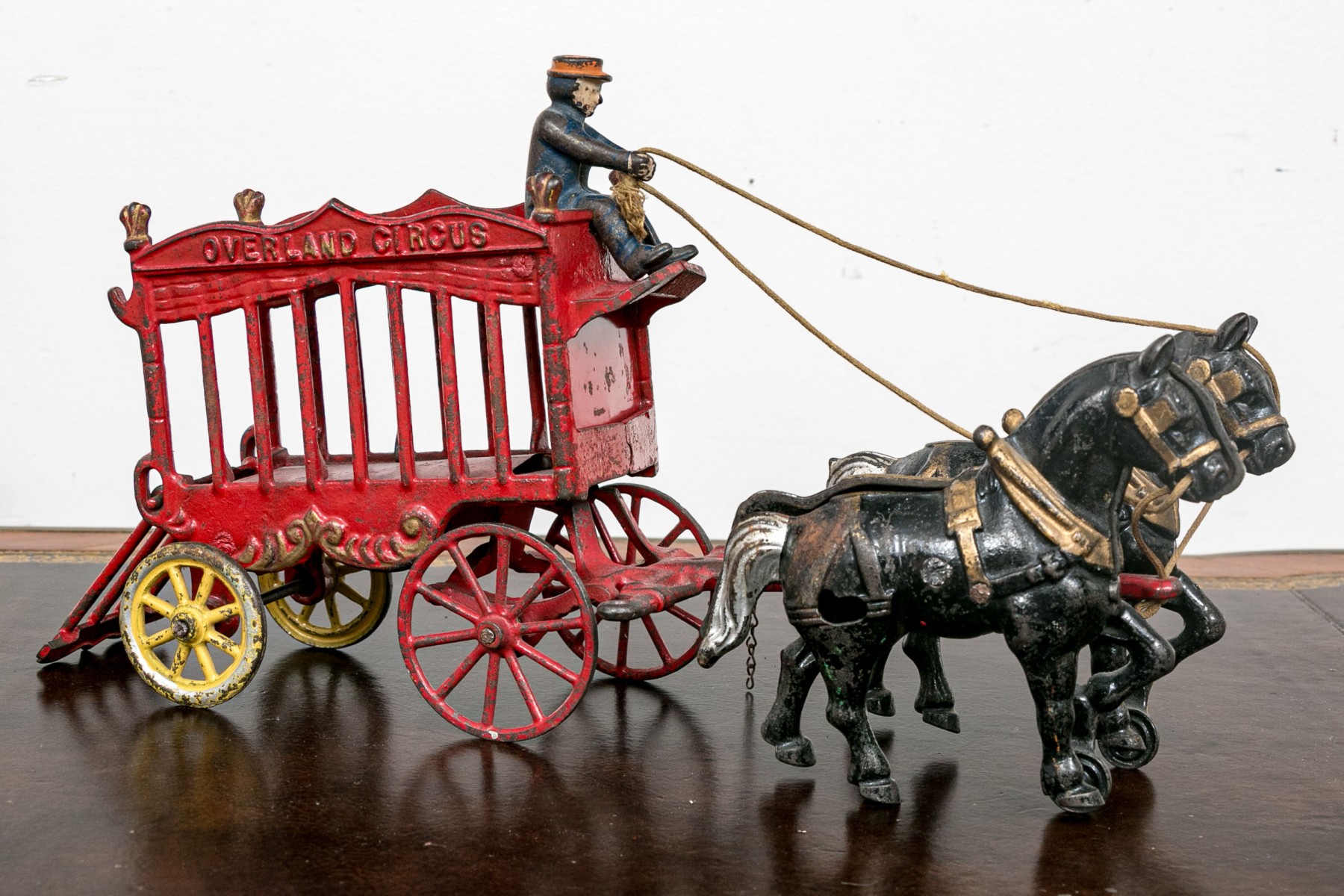 Semi antique paint finished cast iron "Overland Circus" toy horse drawn carriage with driver.