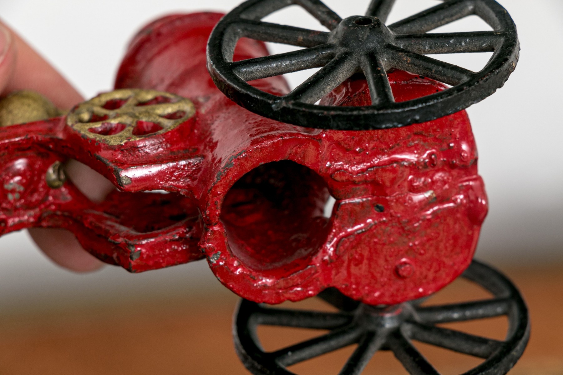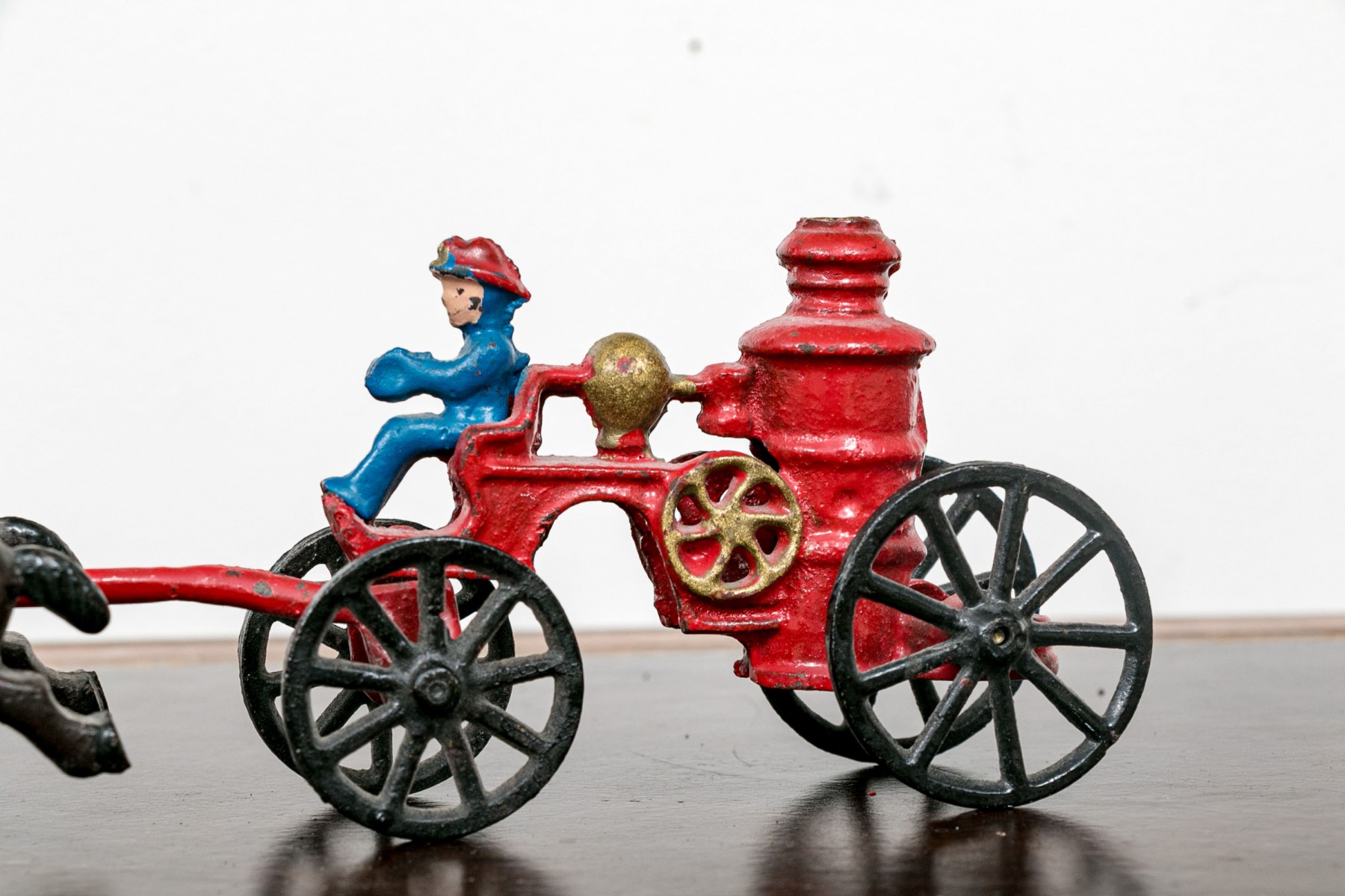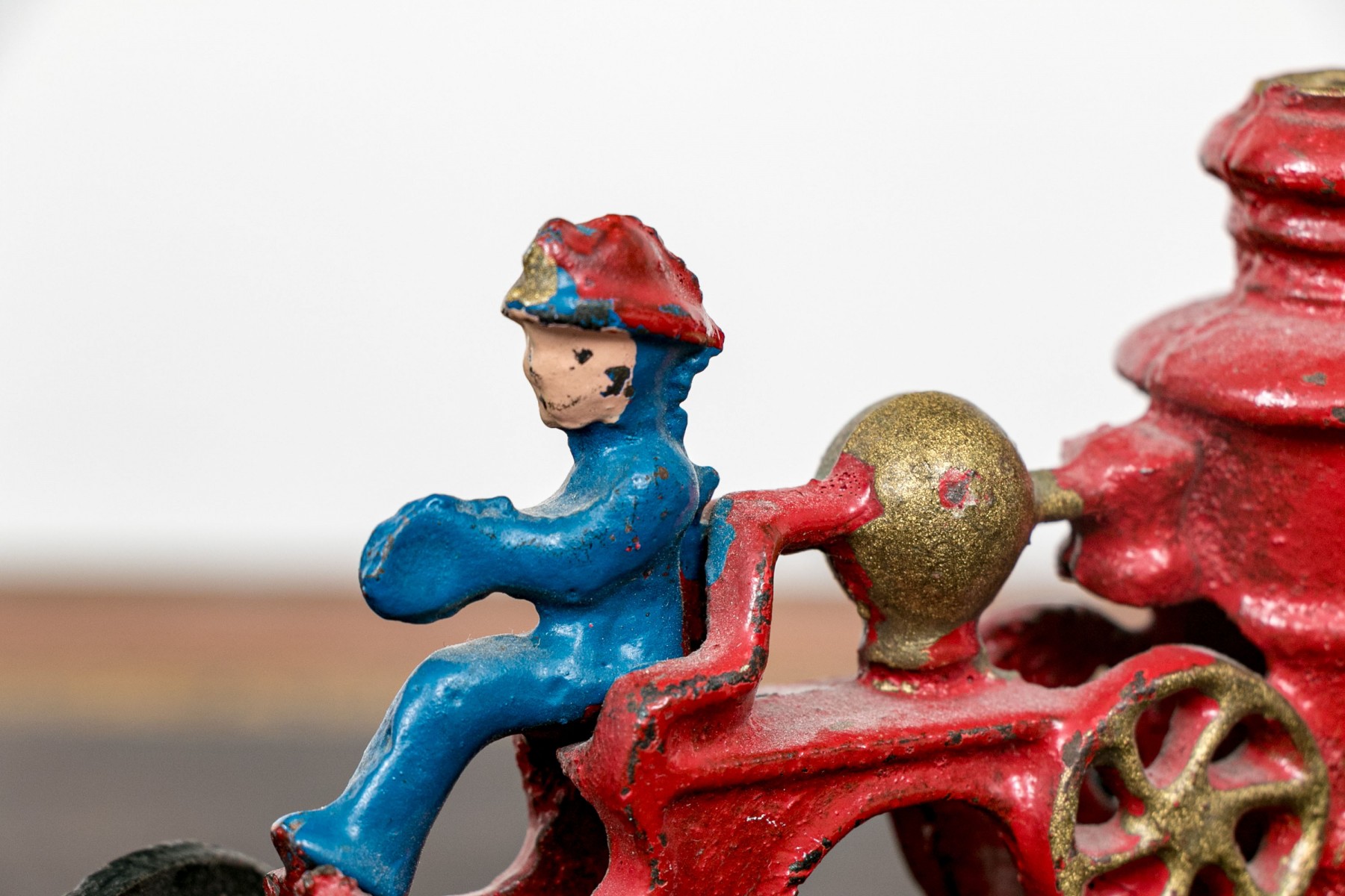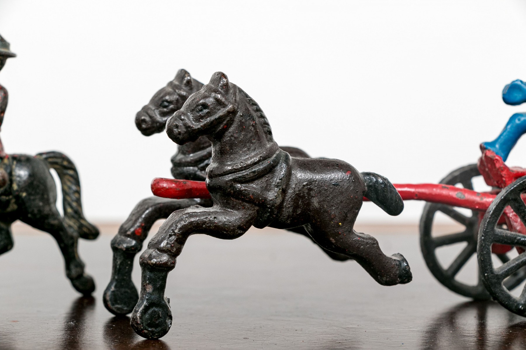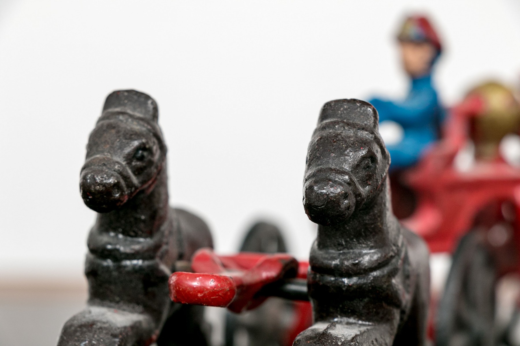 Includes the paint finished cast iron fire cart with driver in red hat and blue attire, mounted to two horses ahead pulling the cart. The two horses wear a harness which appears to have a place for additional horses to affix to but are not present.