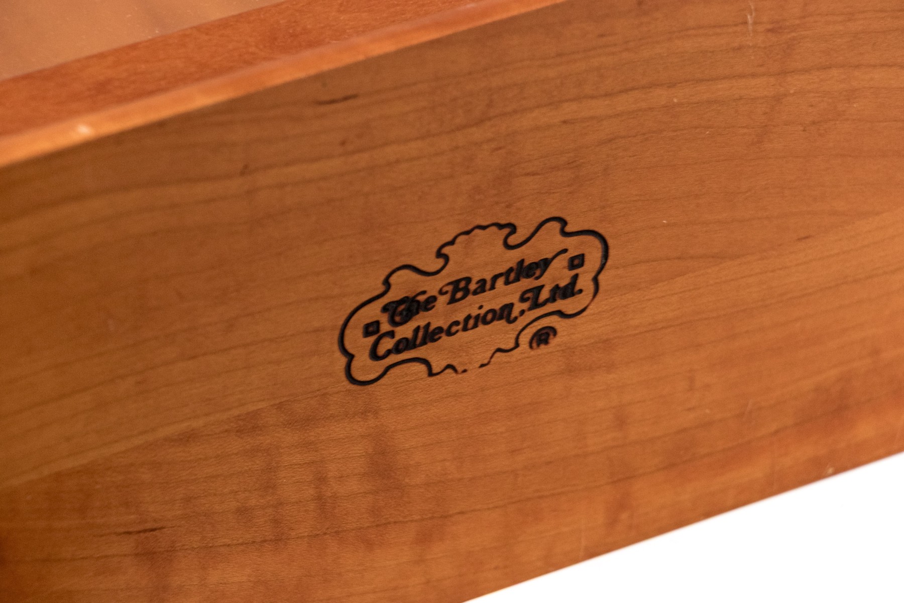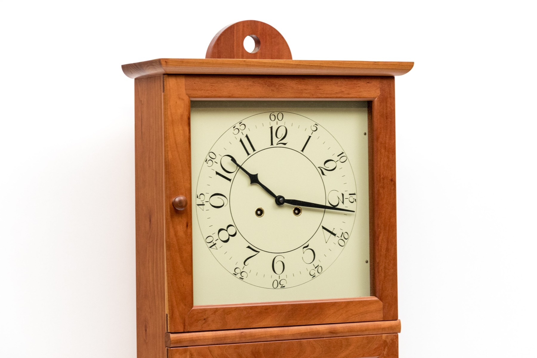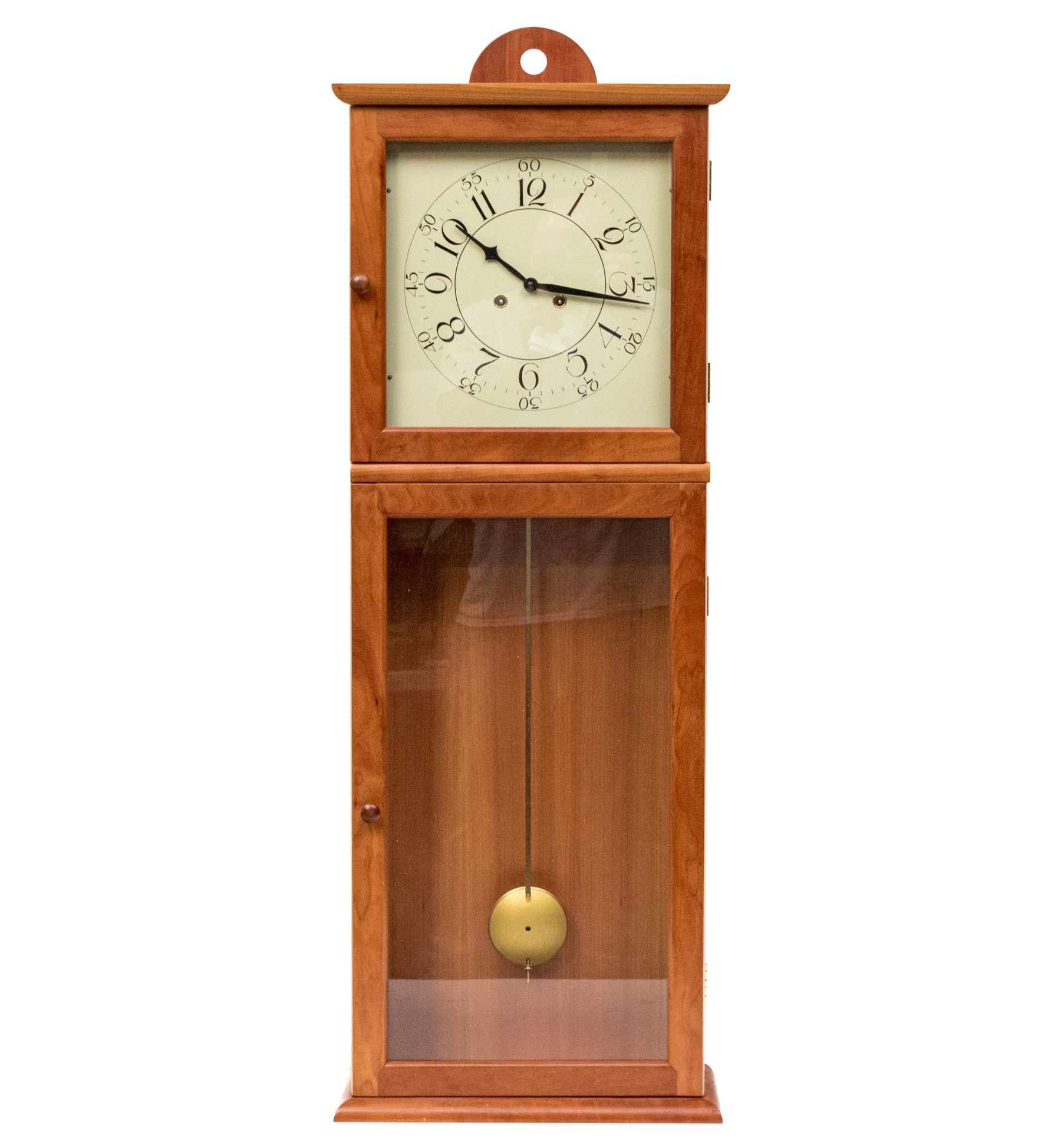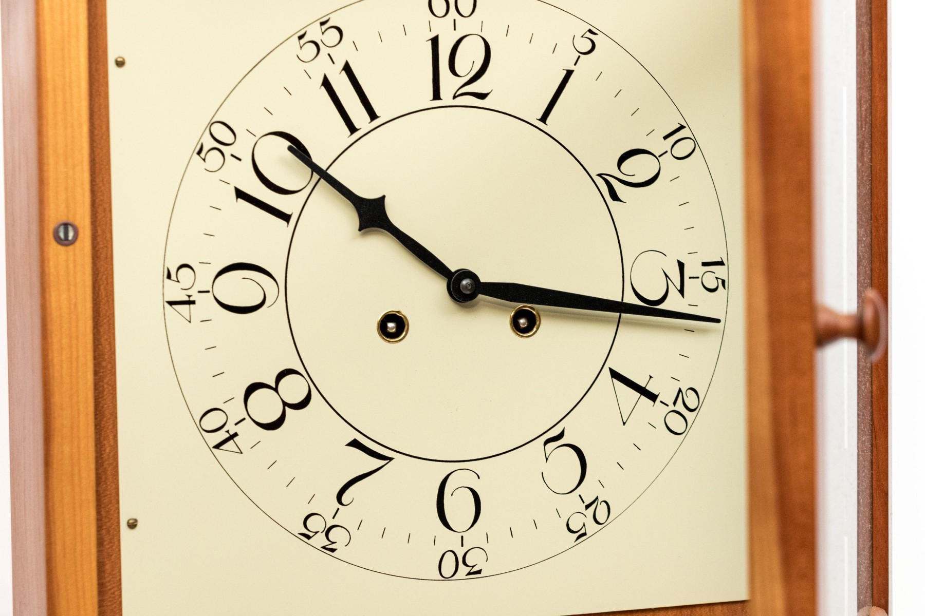 A handsome maple framed wall mounted clock. The clock with an ivory tone face, with hour and minute hand with Arabic numerals around the dial. The dial can be accessed through the hinged glass paneled door.