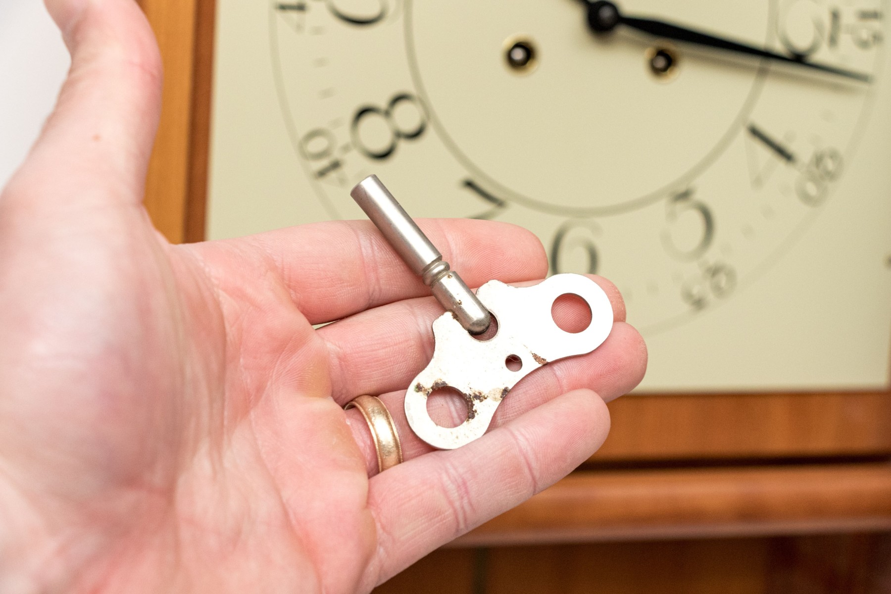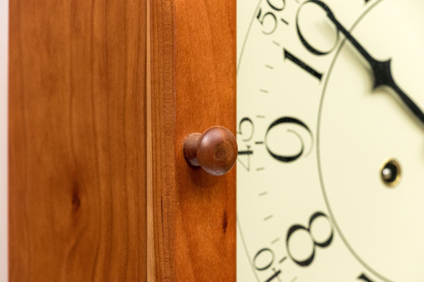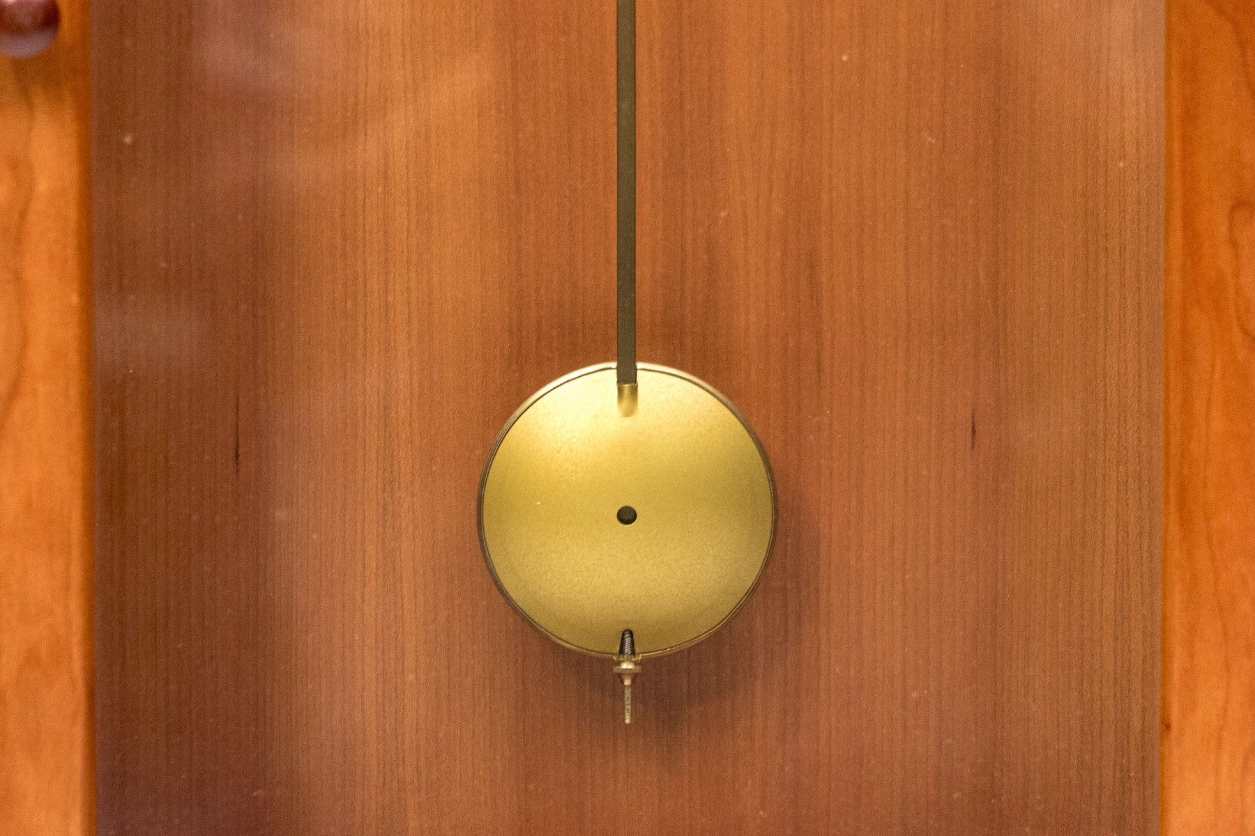 Below is a glass paneled door which opens up to the pendulum and key to interior.