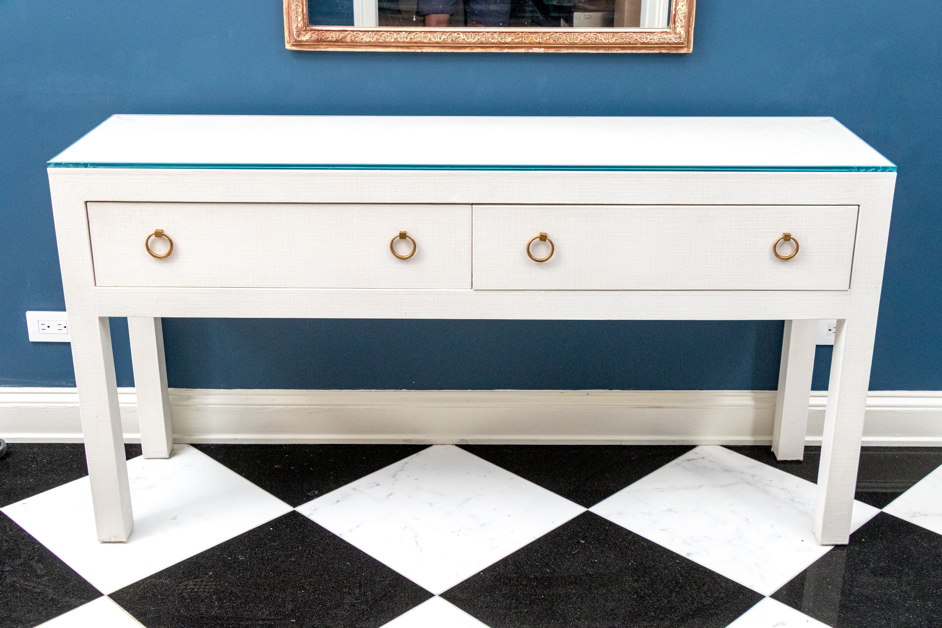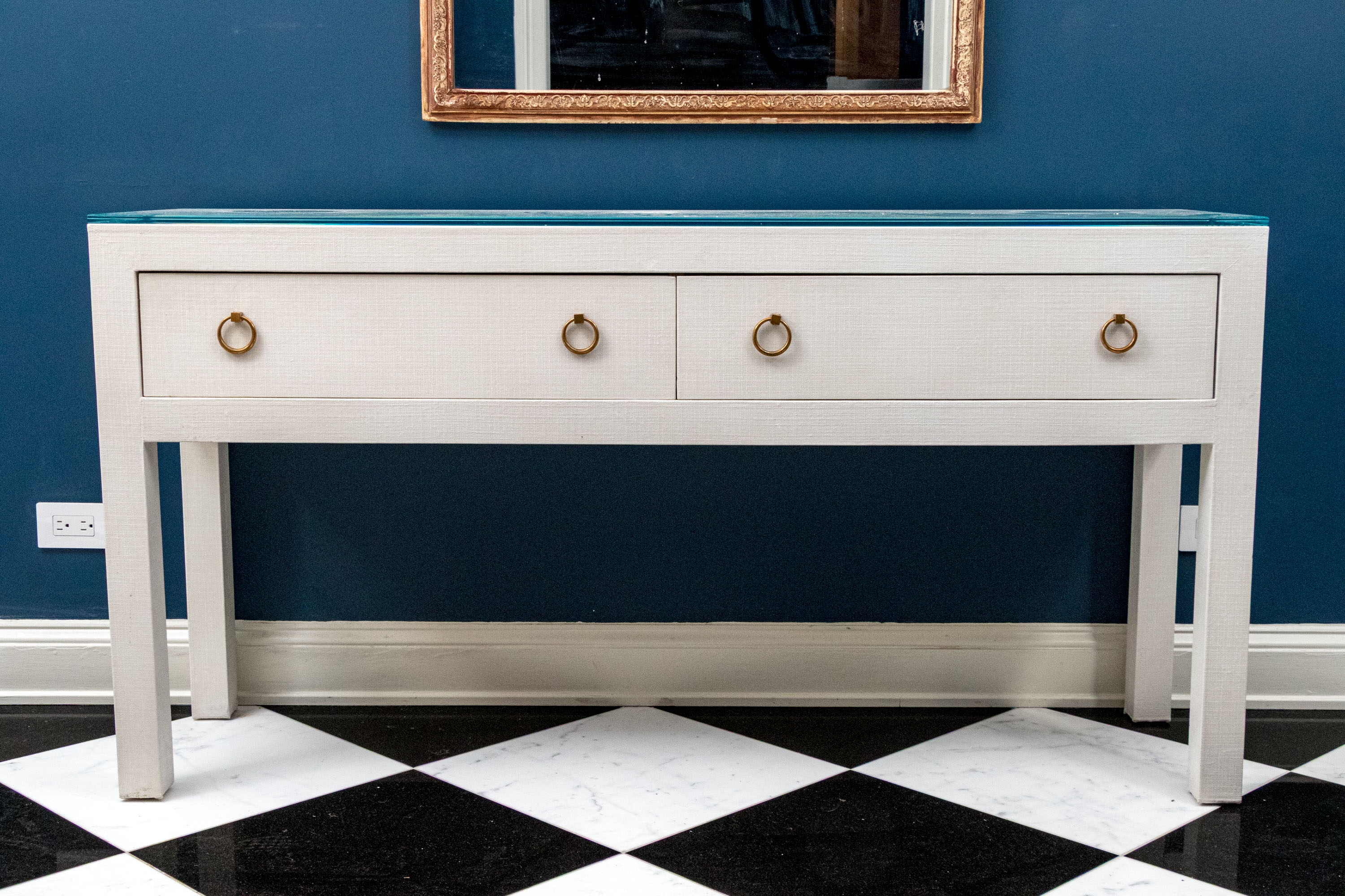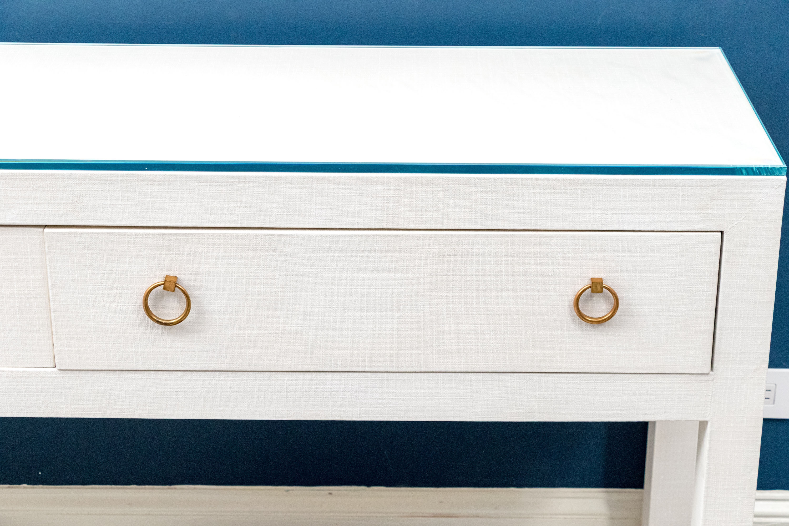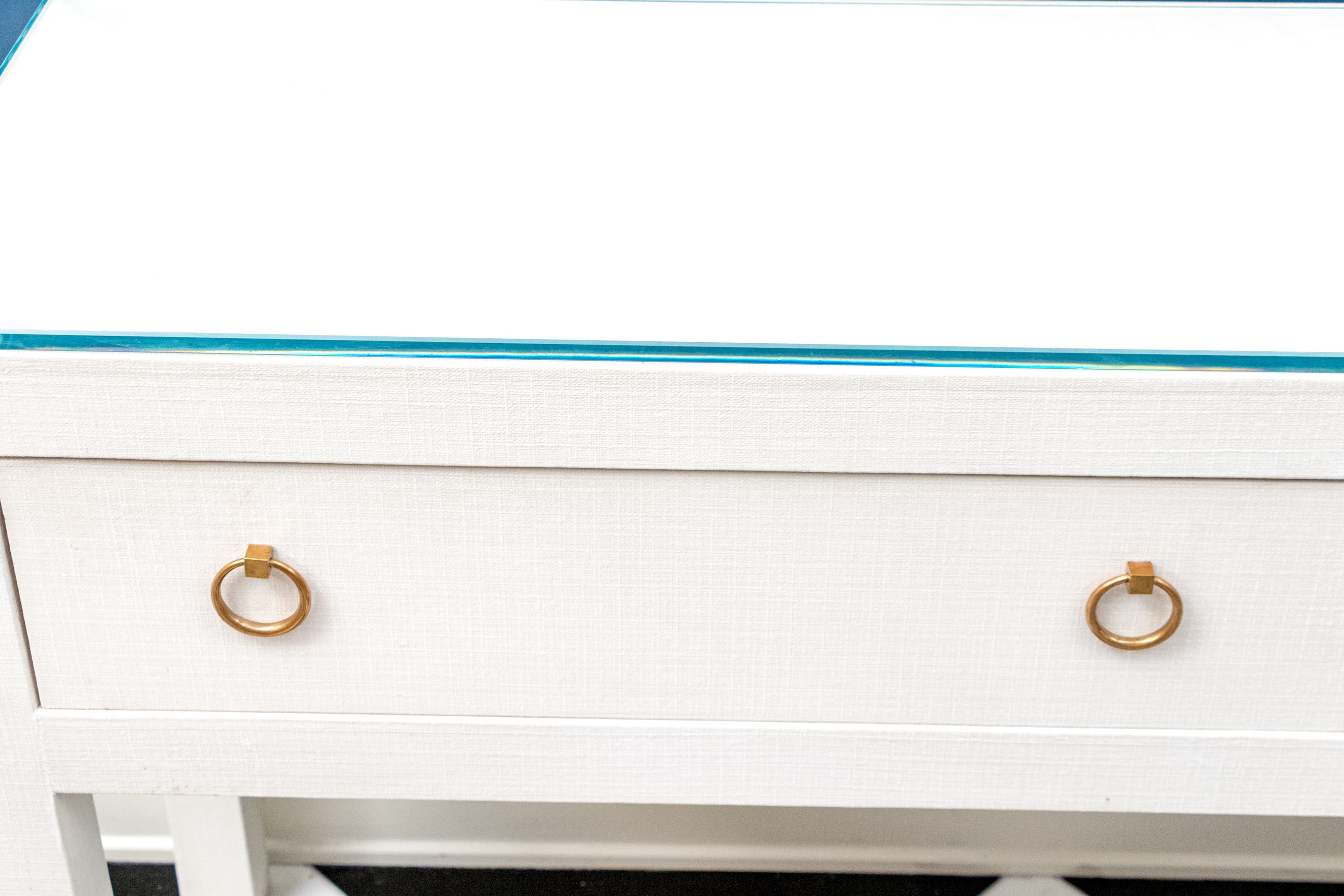 A chic Serena & Lily "Driftway" console with a sleek, minimalist rectangular profile wrapped in chalk white painted linen. The console sports a thick glass top over a case fitted with two spacious drawers adorned with stylish, tapering gilt rings. Raised over rectangular legs.