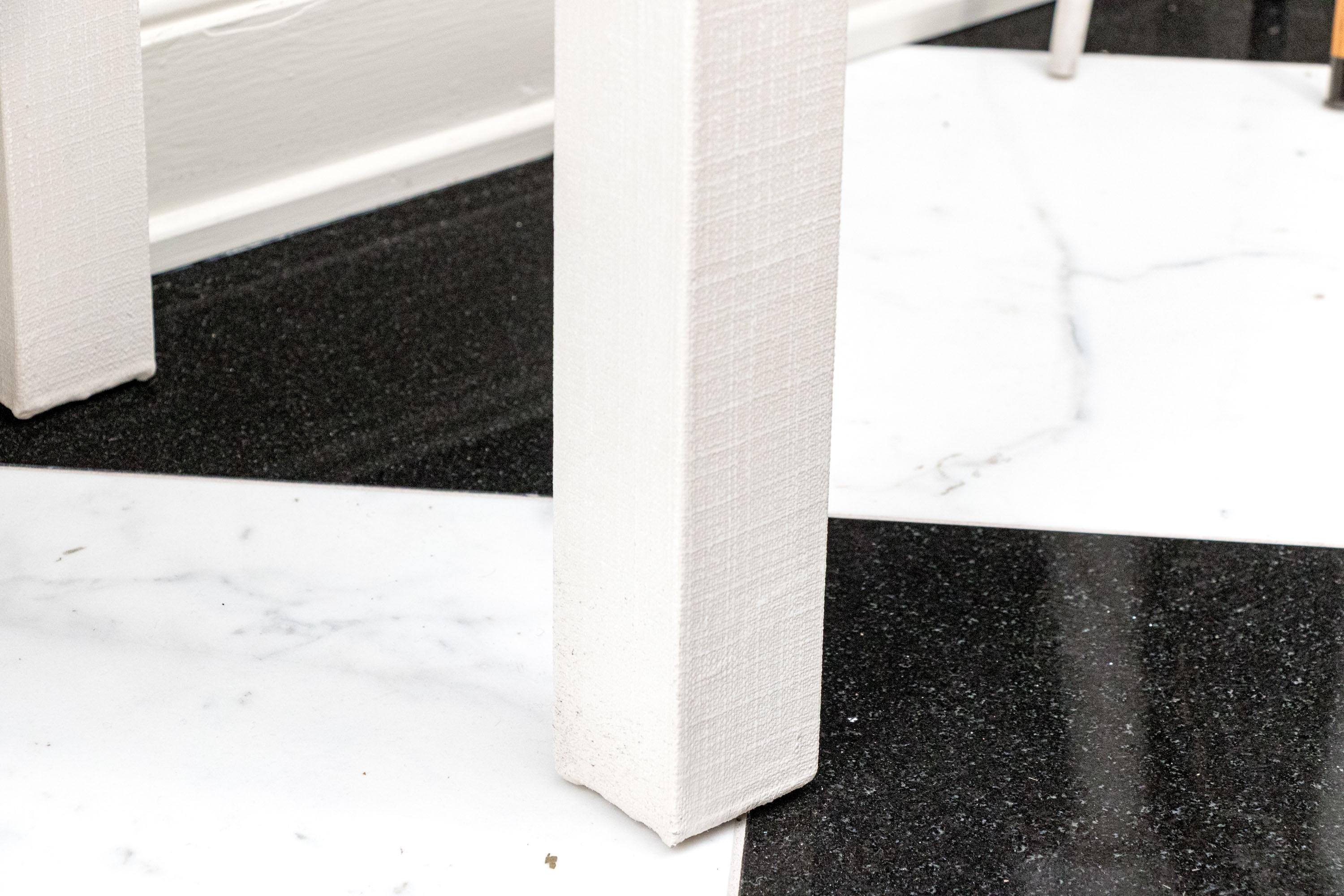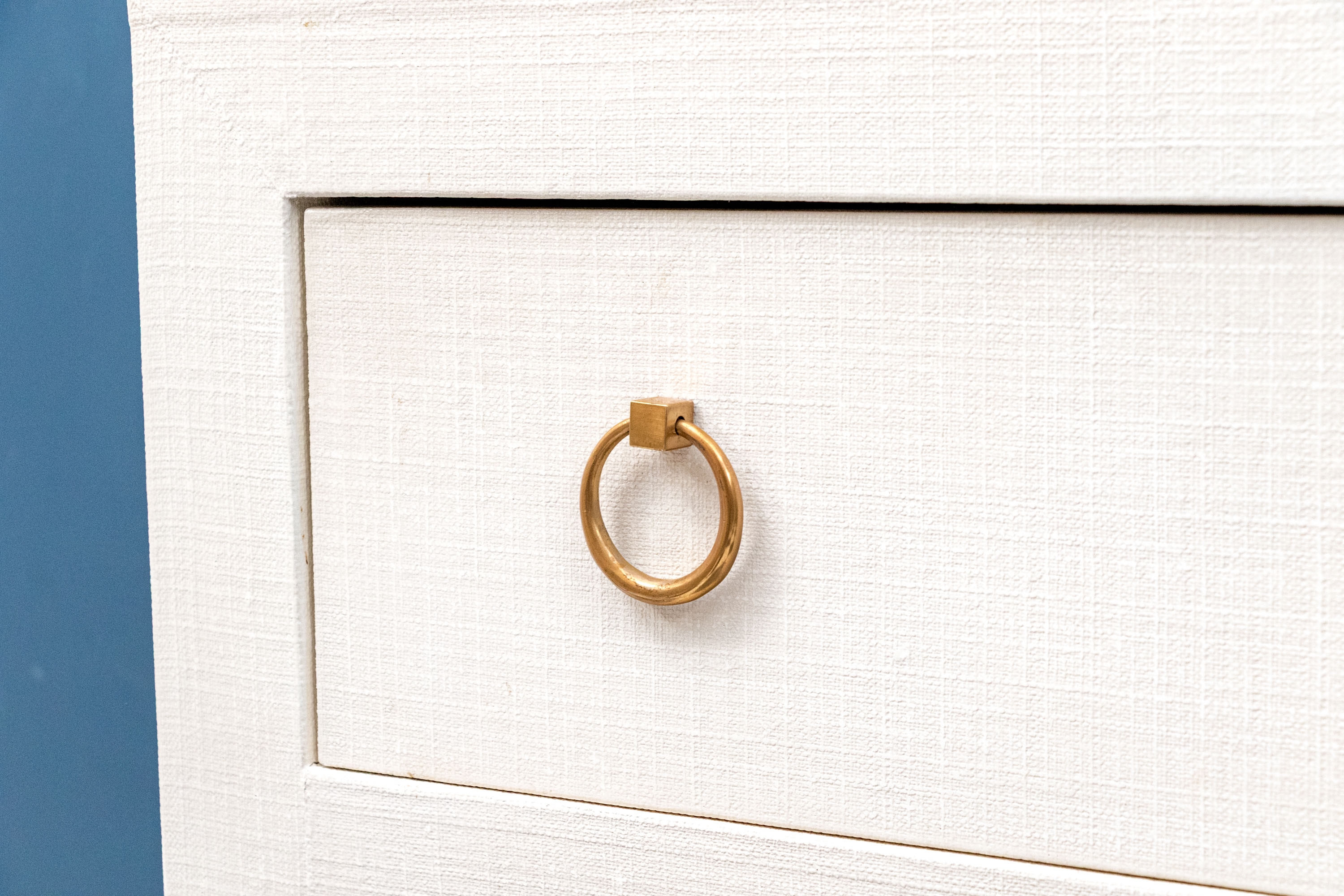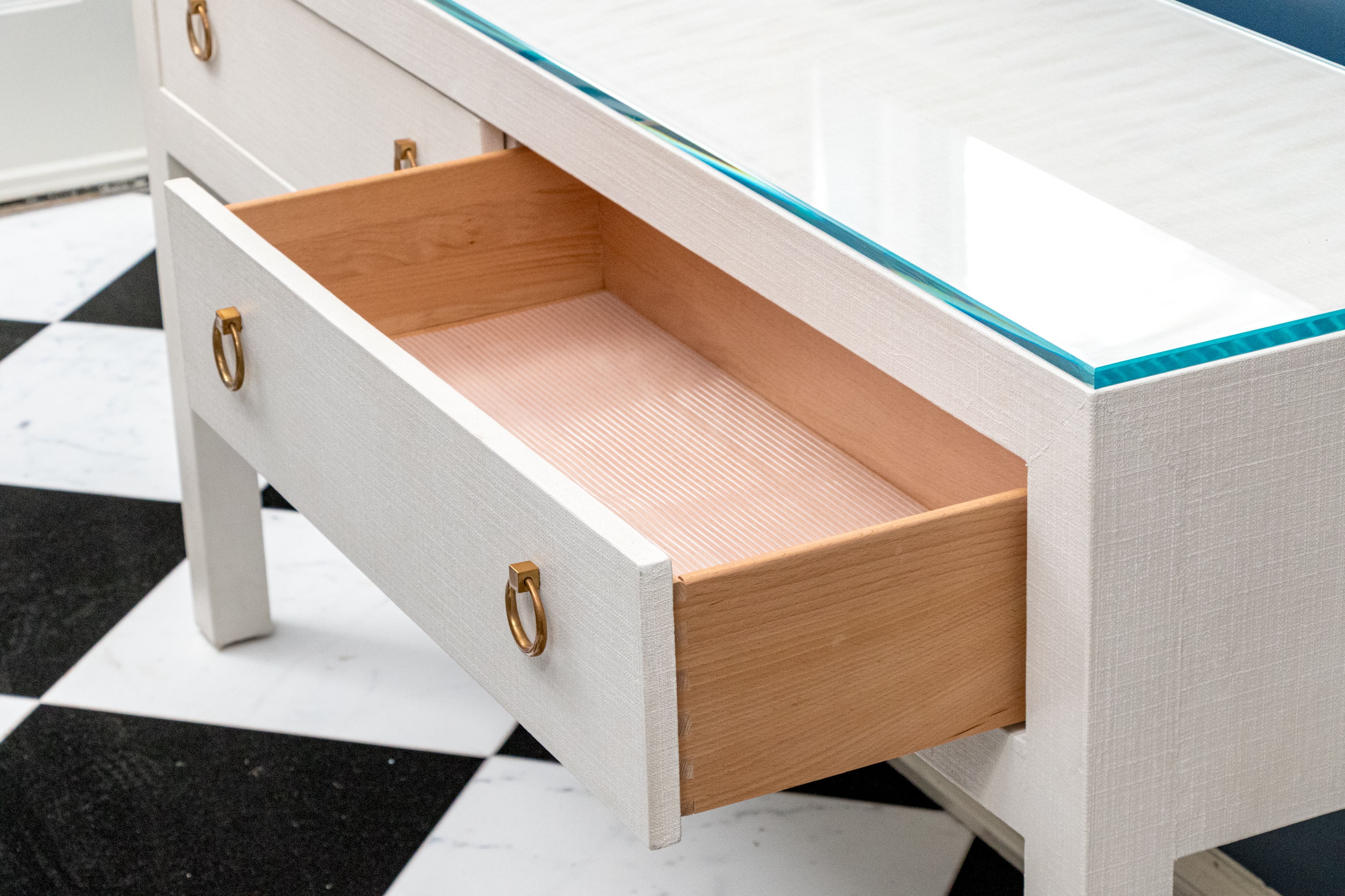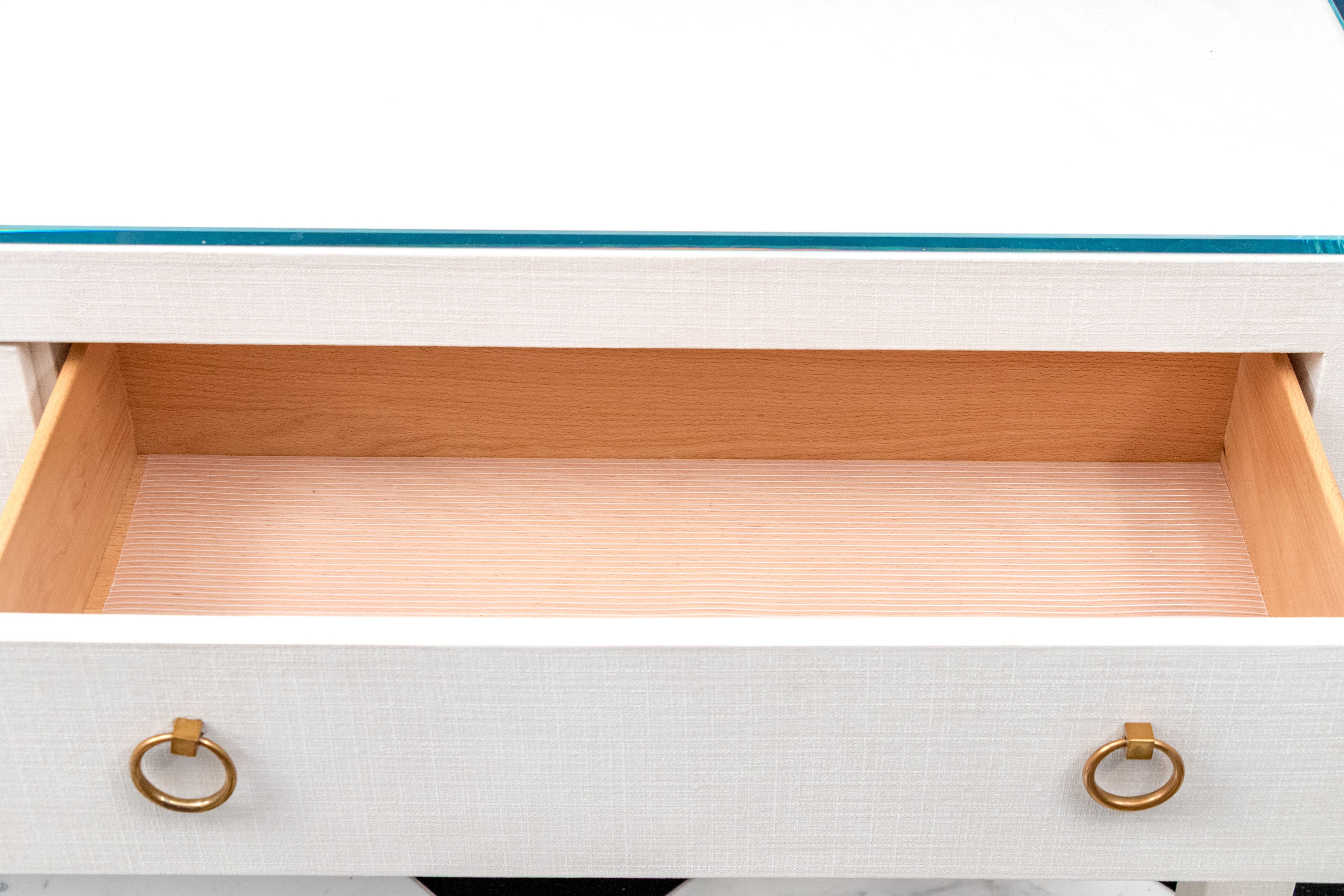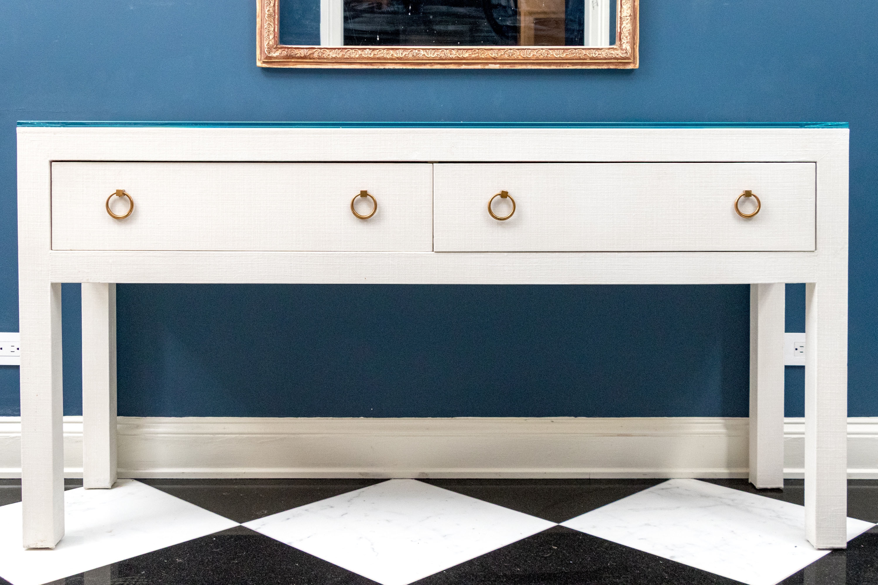 A chic Serena & Lily "Driftway" console with a sleek, minimalist rectangular profile wrapped in chalk white painted linen. The console sports a thick glass top over a case fitted with two spacious drawers adorned with stylish, tapering gilt rings. Raised over rectangular legs.