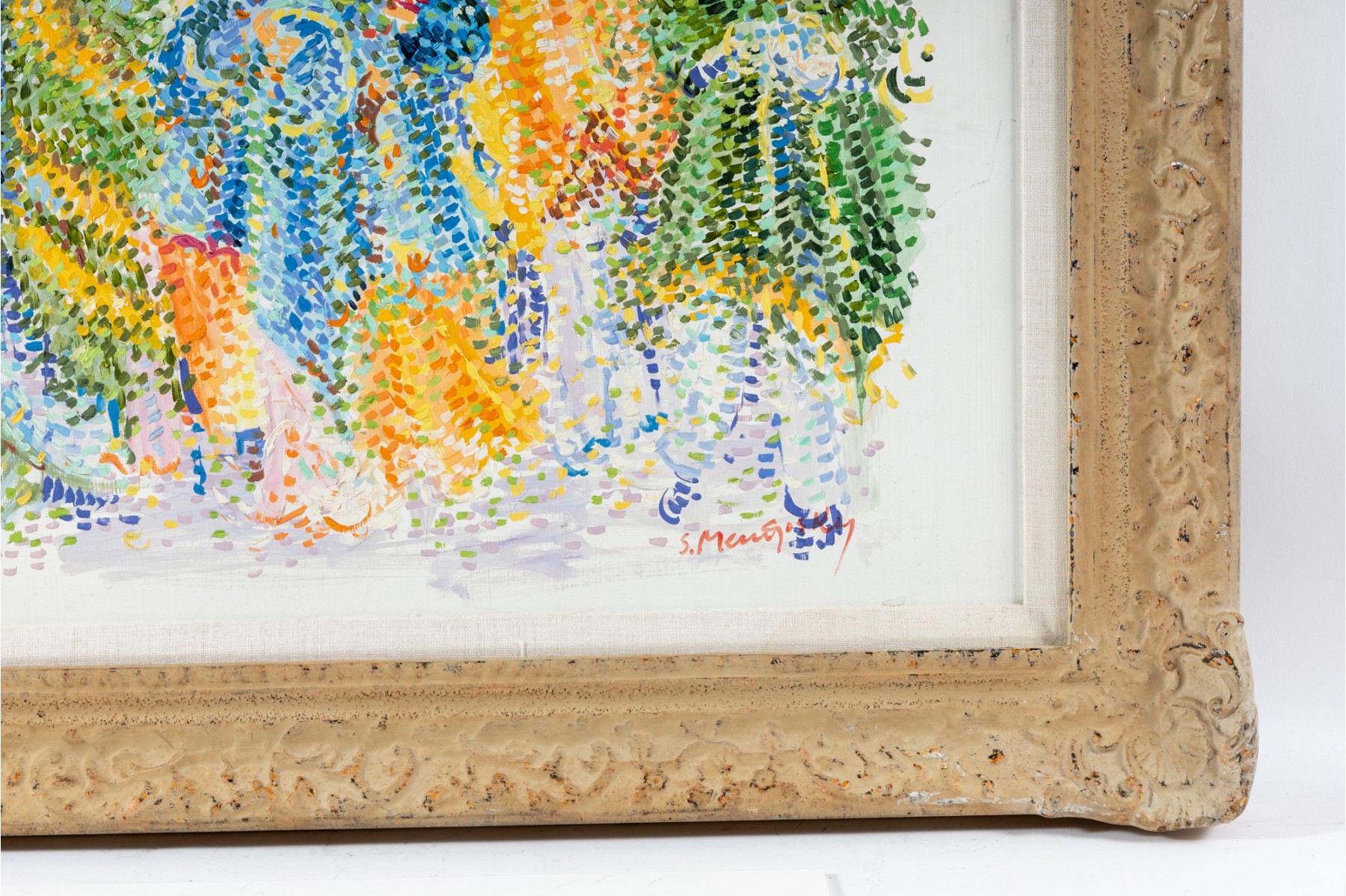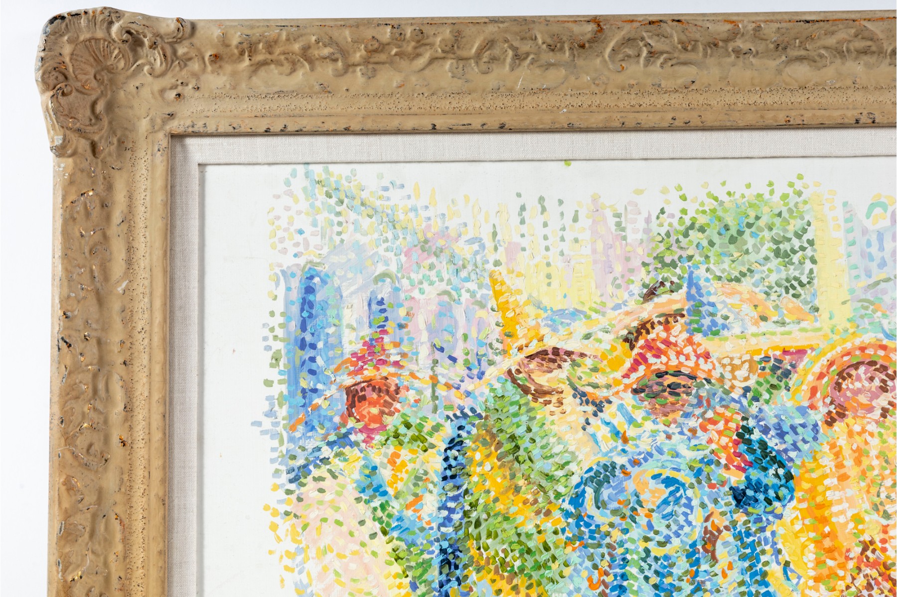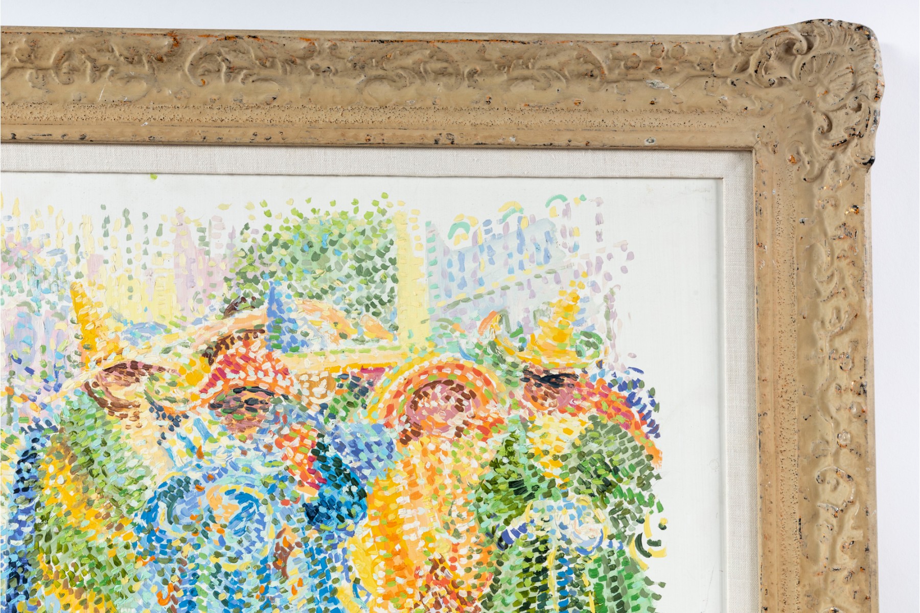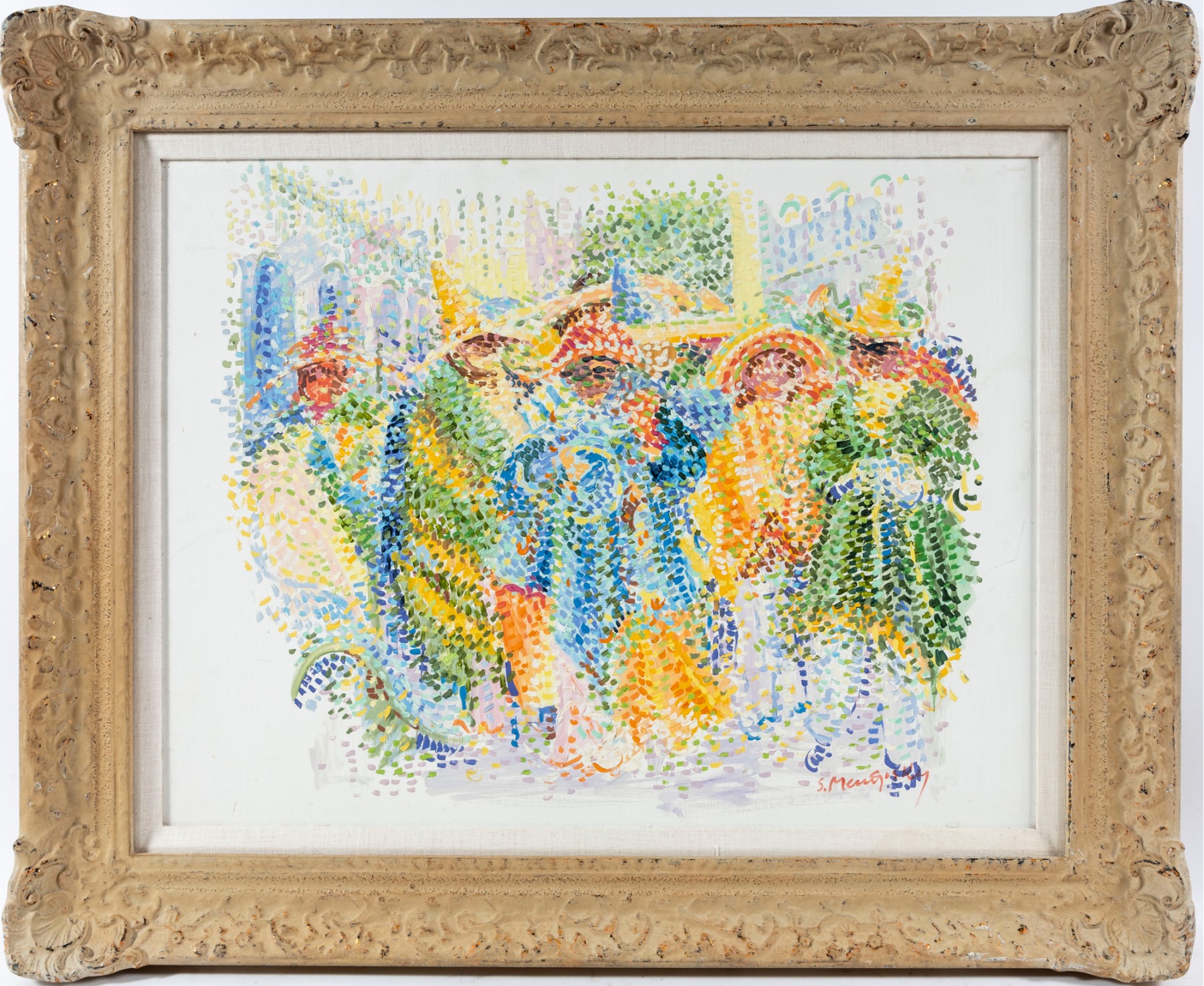 A beautiful example of the pointillism art style by French painter Serge Mendjisky, Untitled, this oil on board painting loosely depicts a group of five figures -- signed and presented openly within a grand, distressed frame rich with foliate designs.