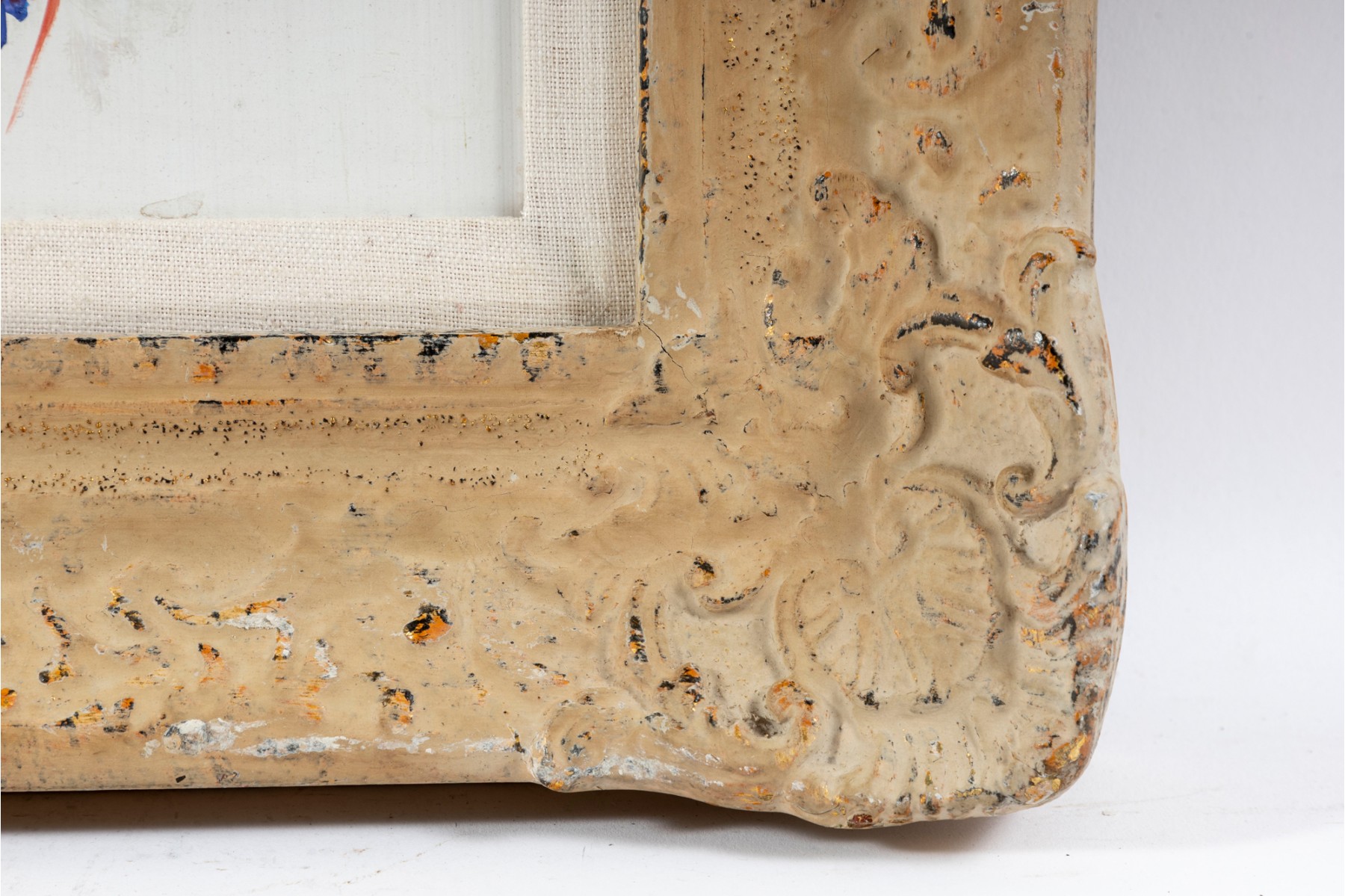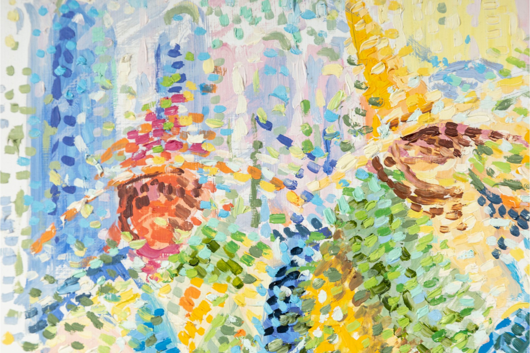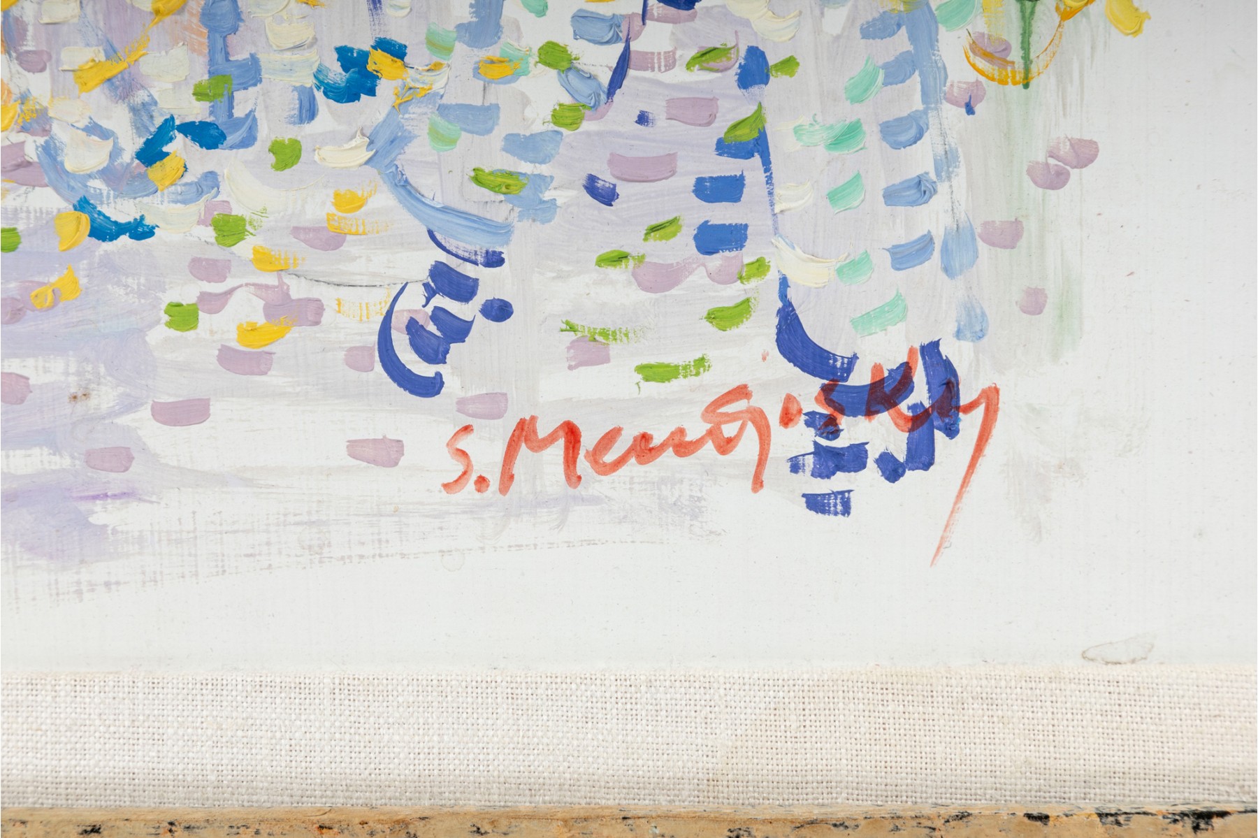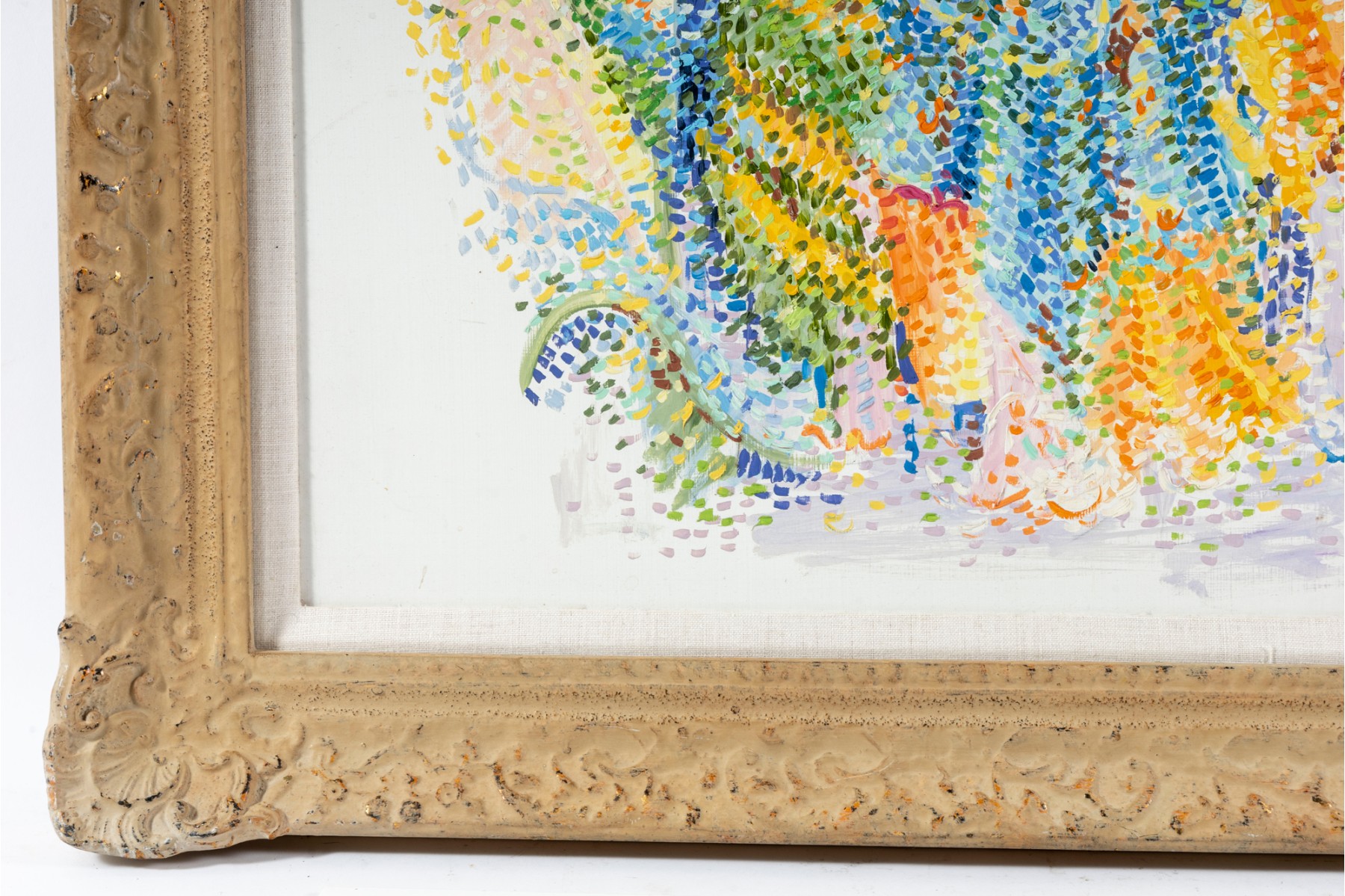 A beautiful example of the pointillism art style by French painter Serge Mendjisky, Untitled, this oil on board painting loosely depicts a group of five figures -- signed and presented openly within a grand, distressed frame rich with foliate designs.