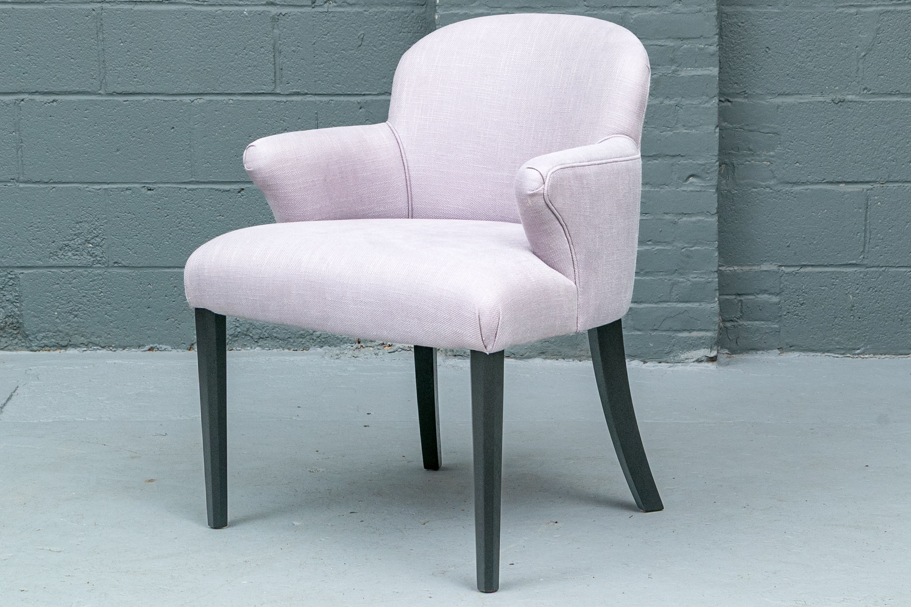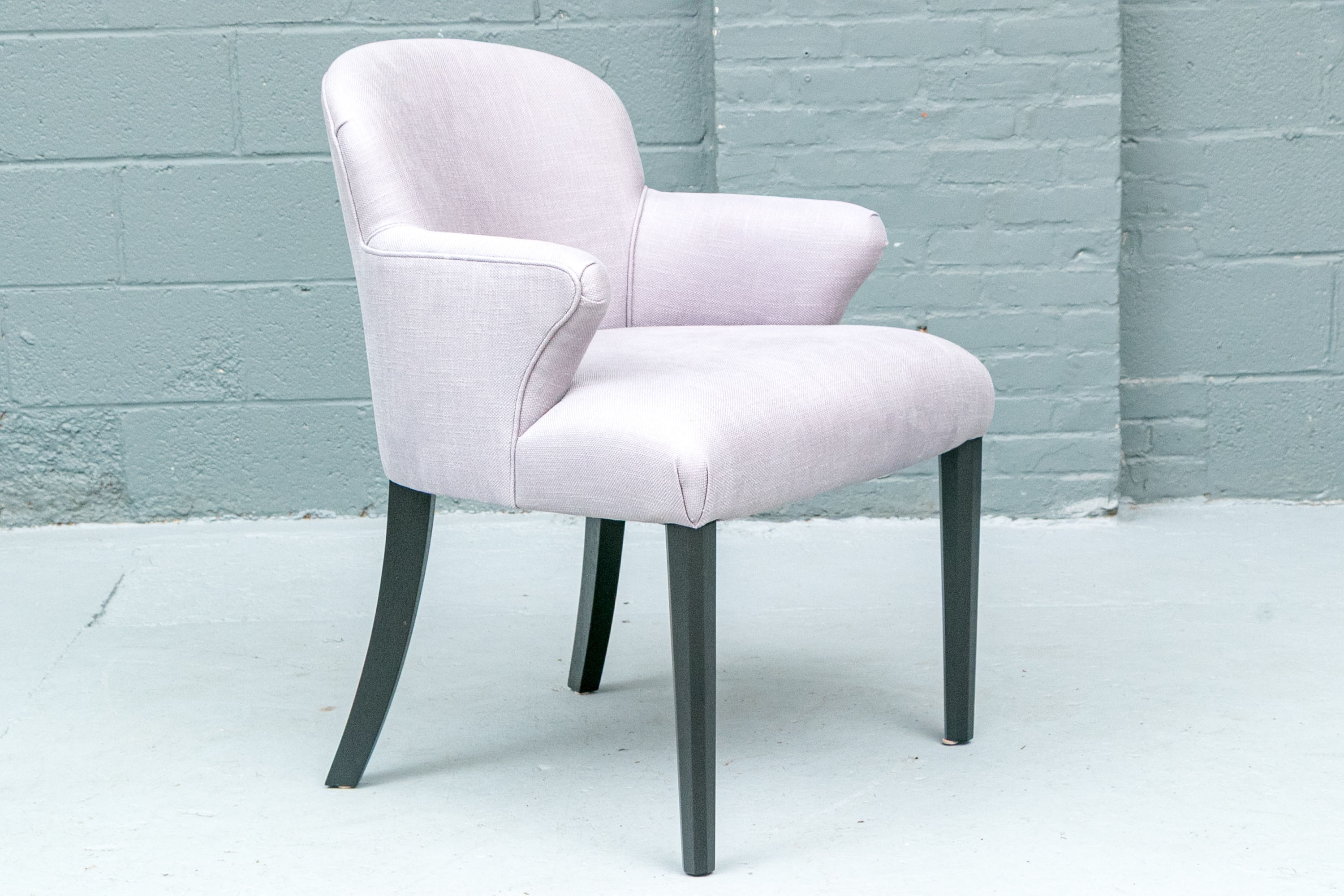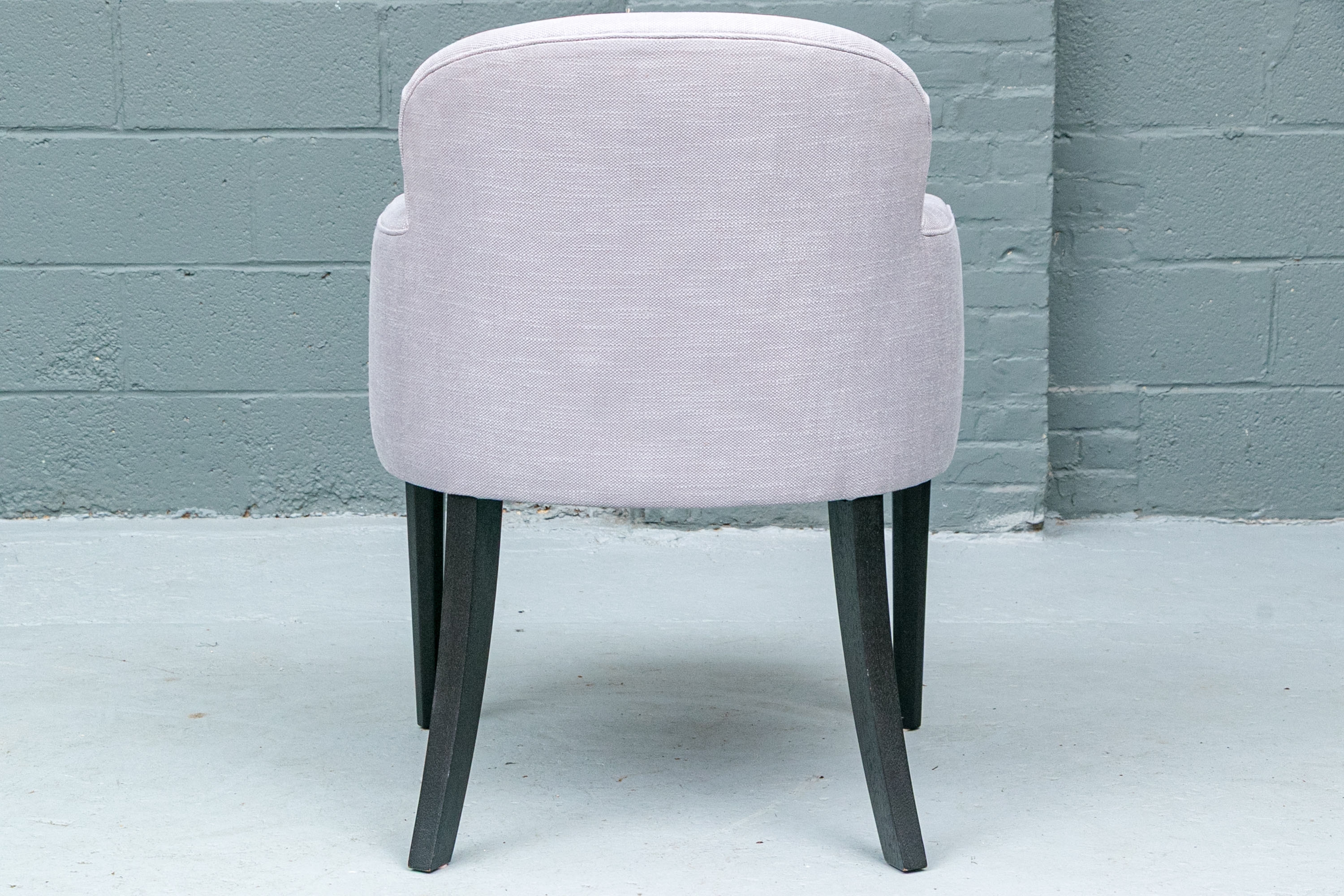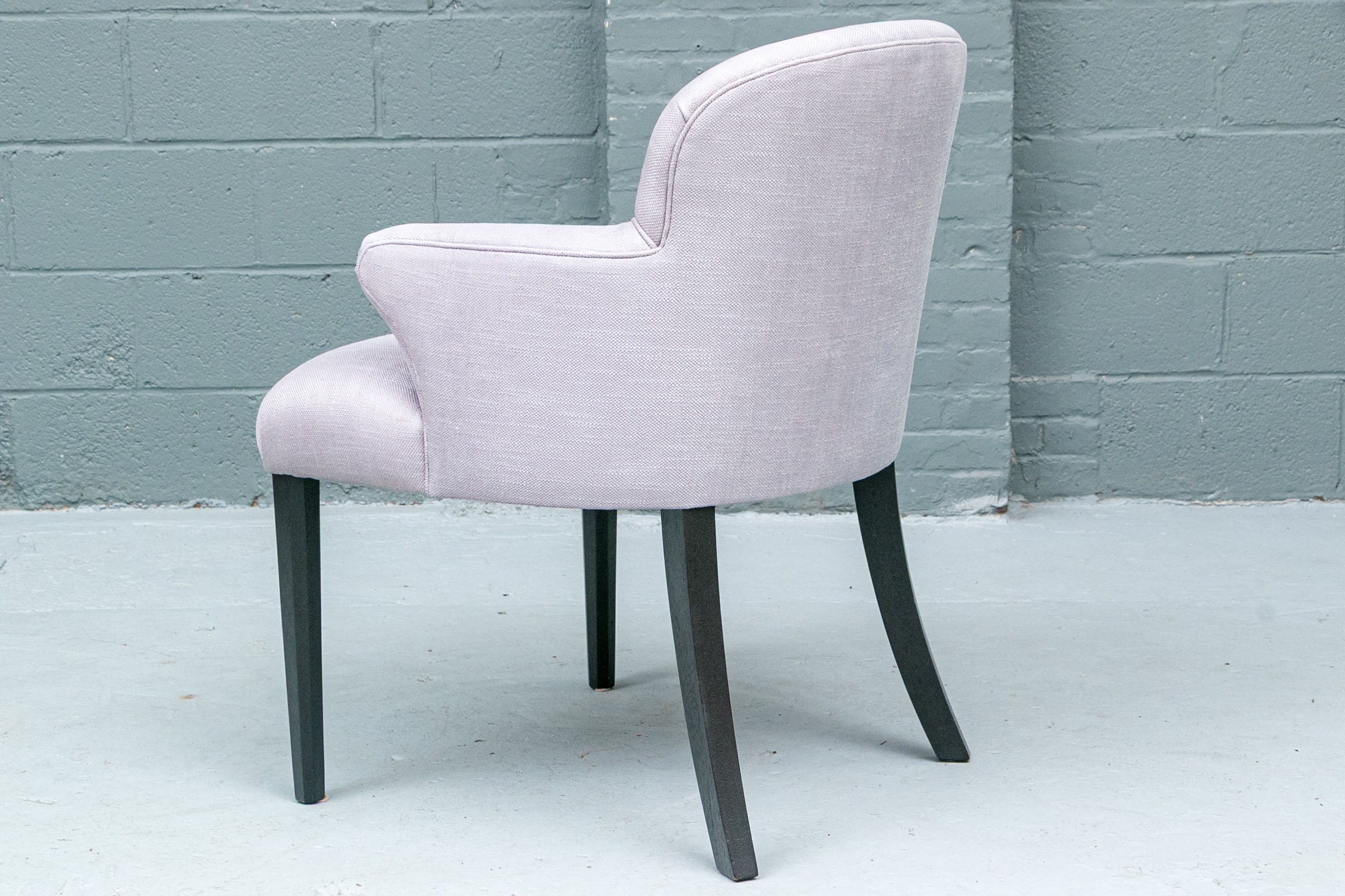 The chair is resting upon faceted and tapering front legs and saber back legs. The chairs bearing the Michael Berman Ltd. tag.