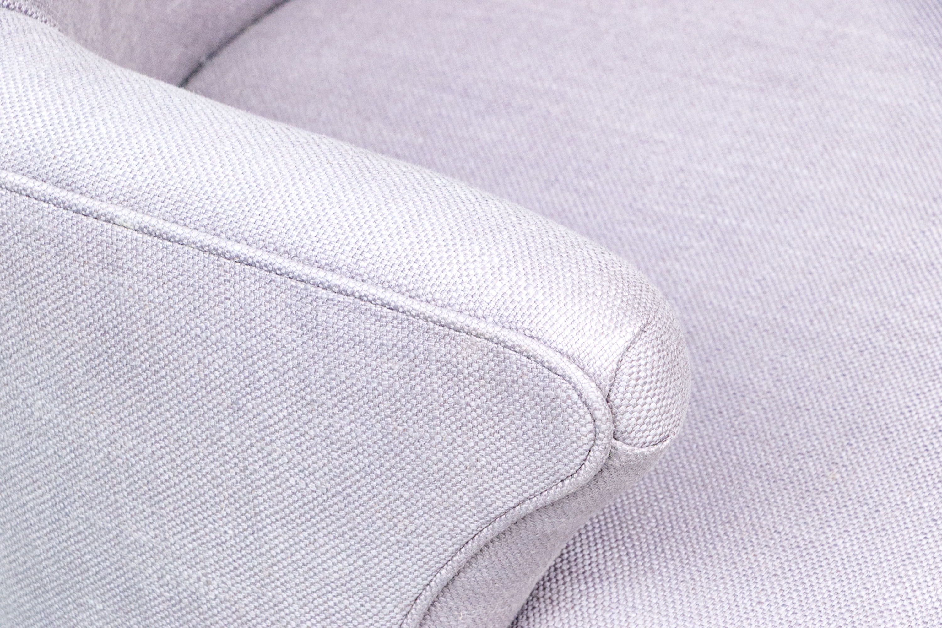 Set of 10 upholstered dining room chairs by Michael Berman Ltd. in a woven fabric with a tub back, smooth armrests with exterior welting and a few slight pleats to the front.