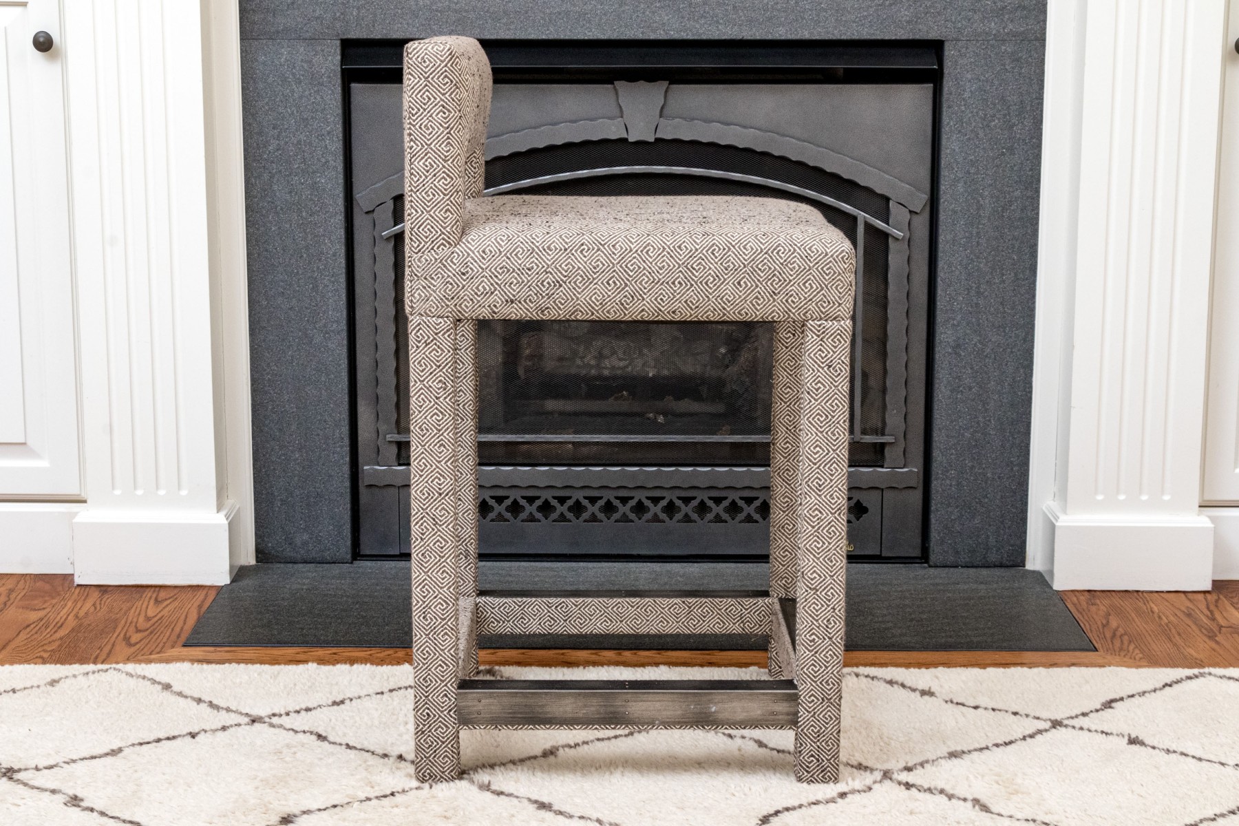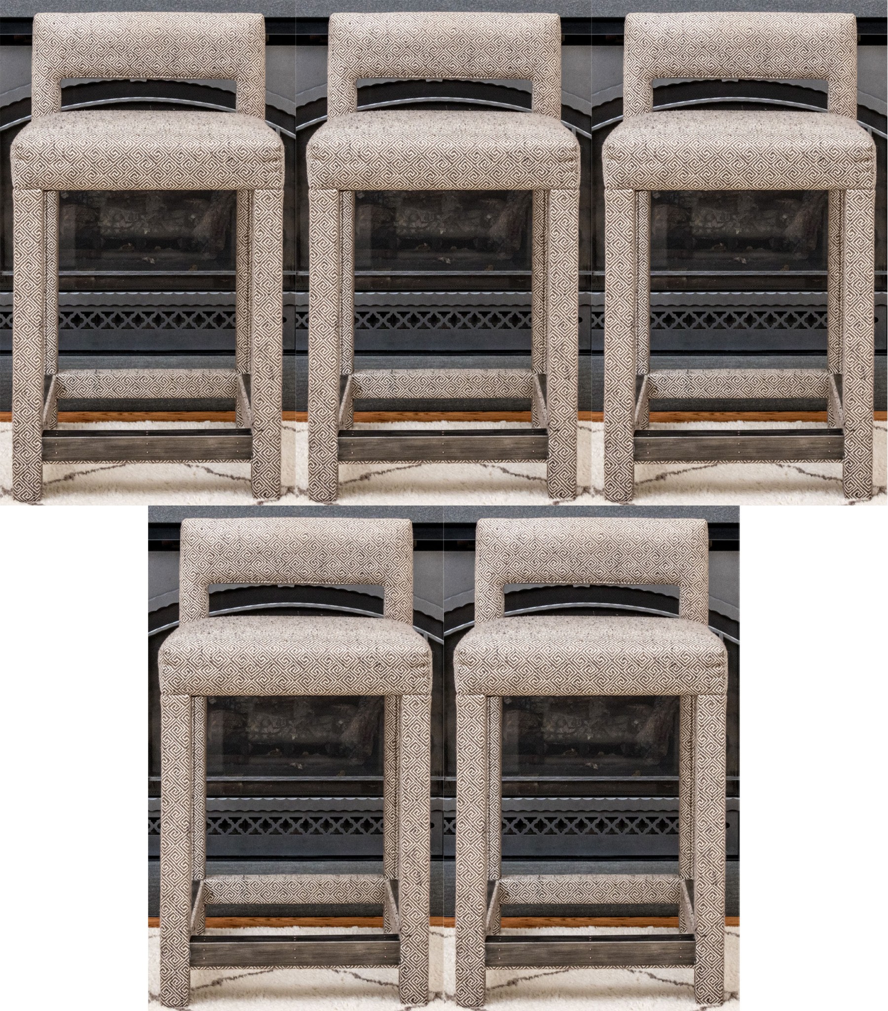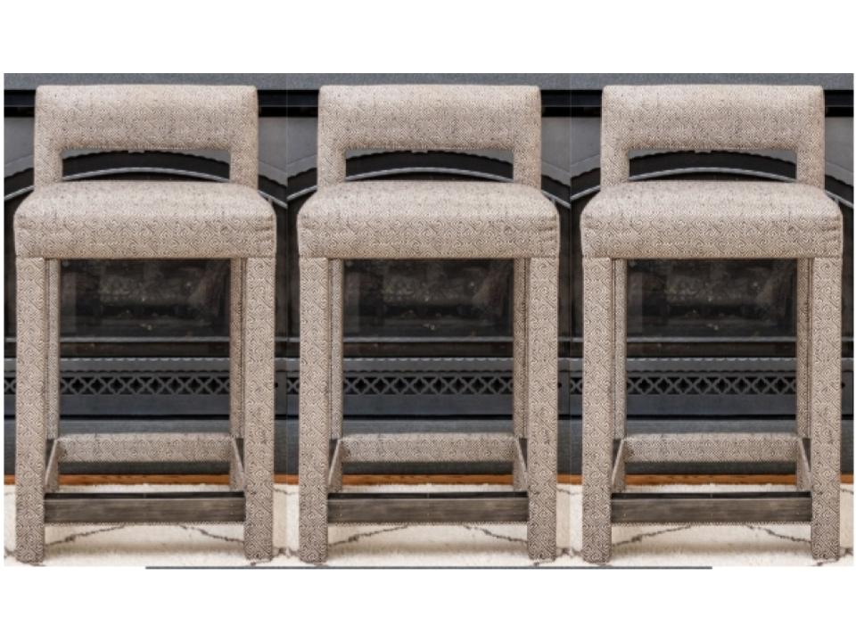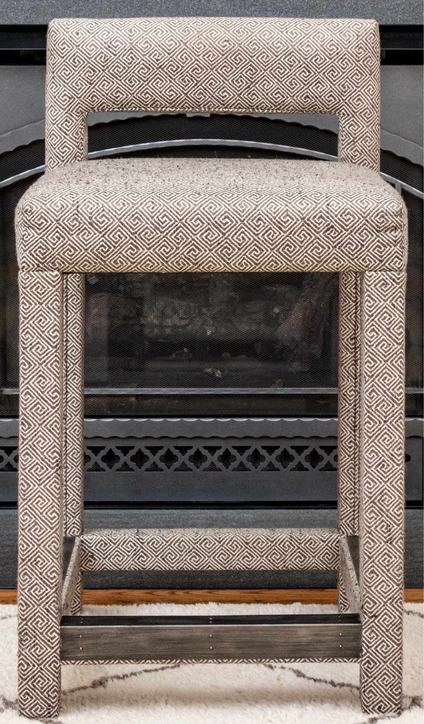 Fabricated in a charcoal geometric design. Three sided metal wrapped foot rails. Two additional stools in another lot.