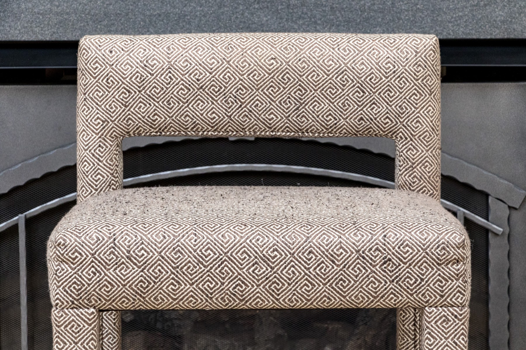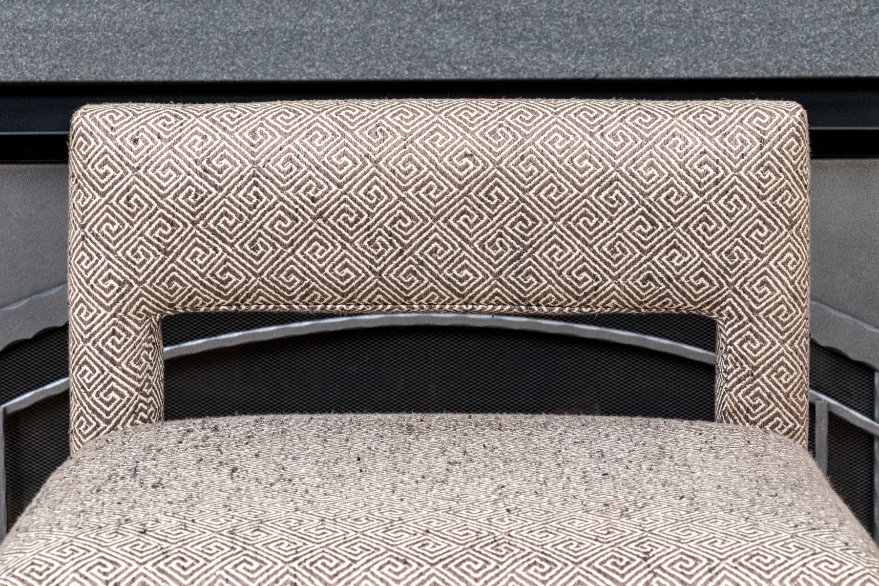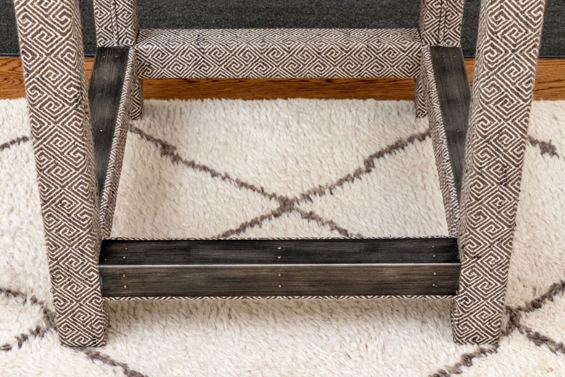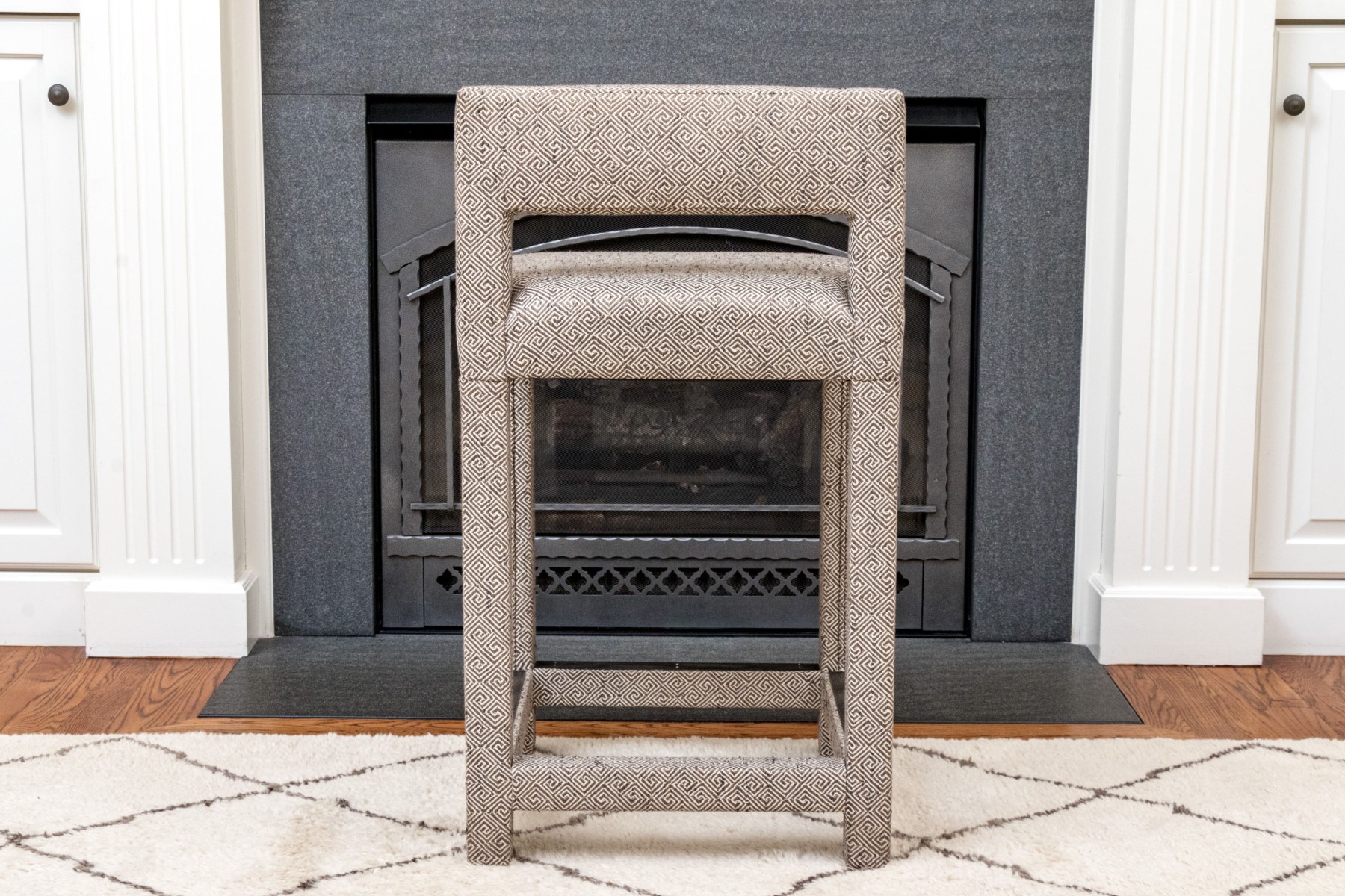 Fabricated in a charcoal geometric design. Three sided metal wrapped foot rails. Two additional stools in another lot.