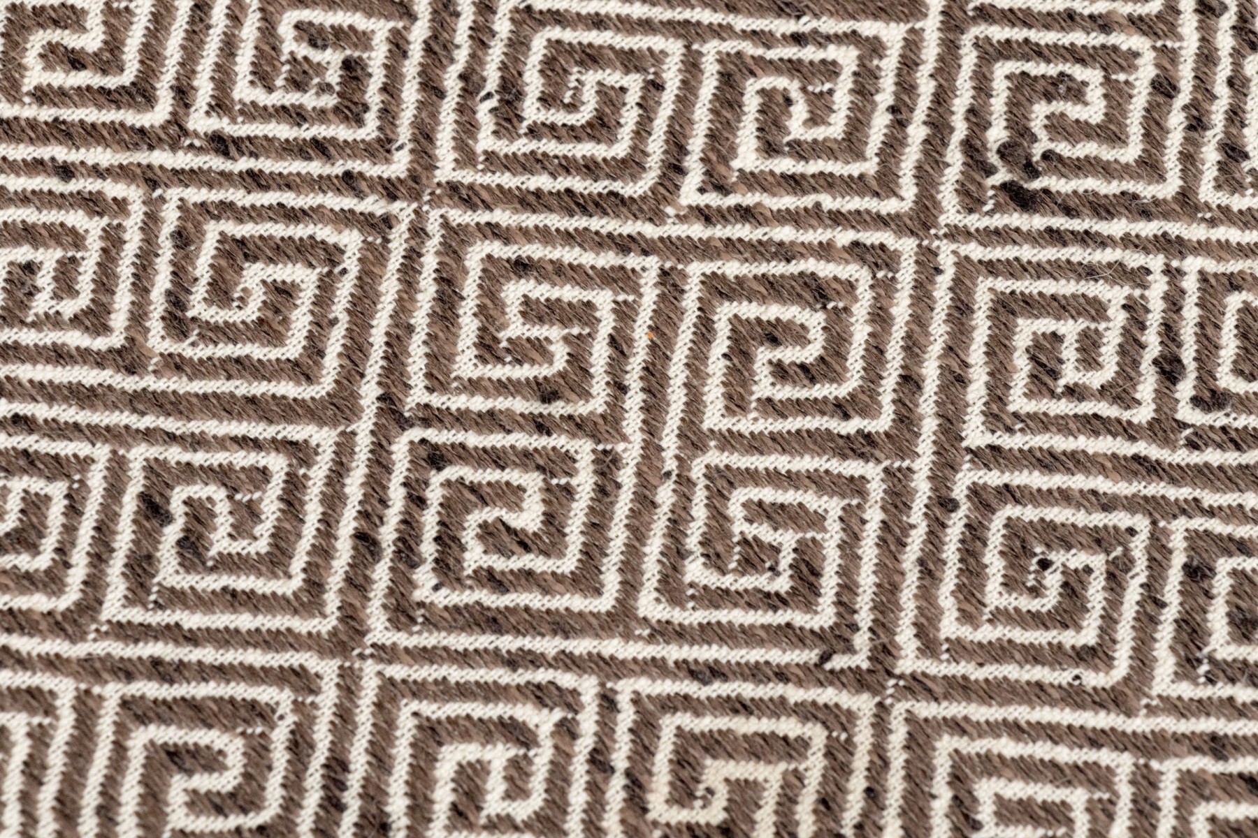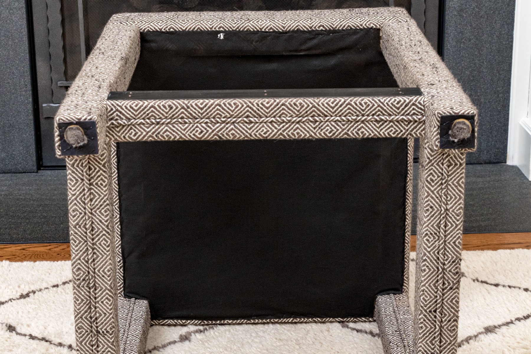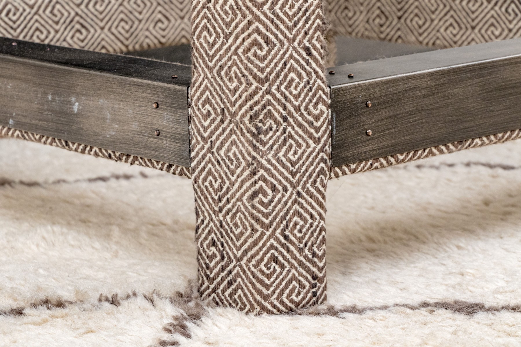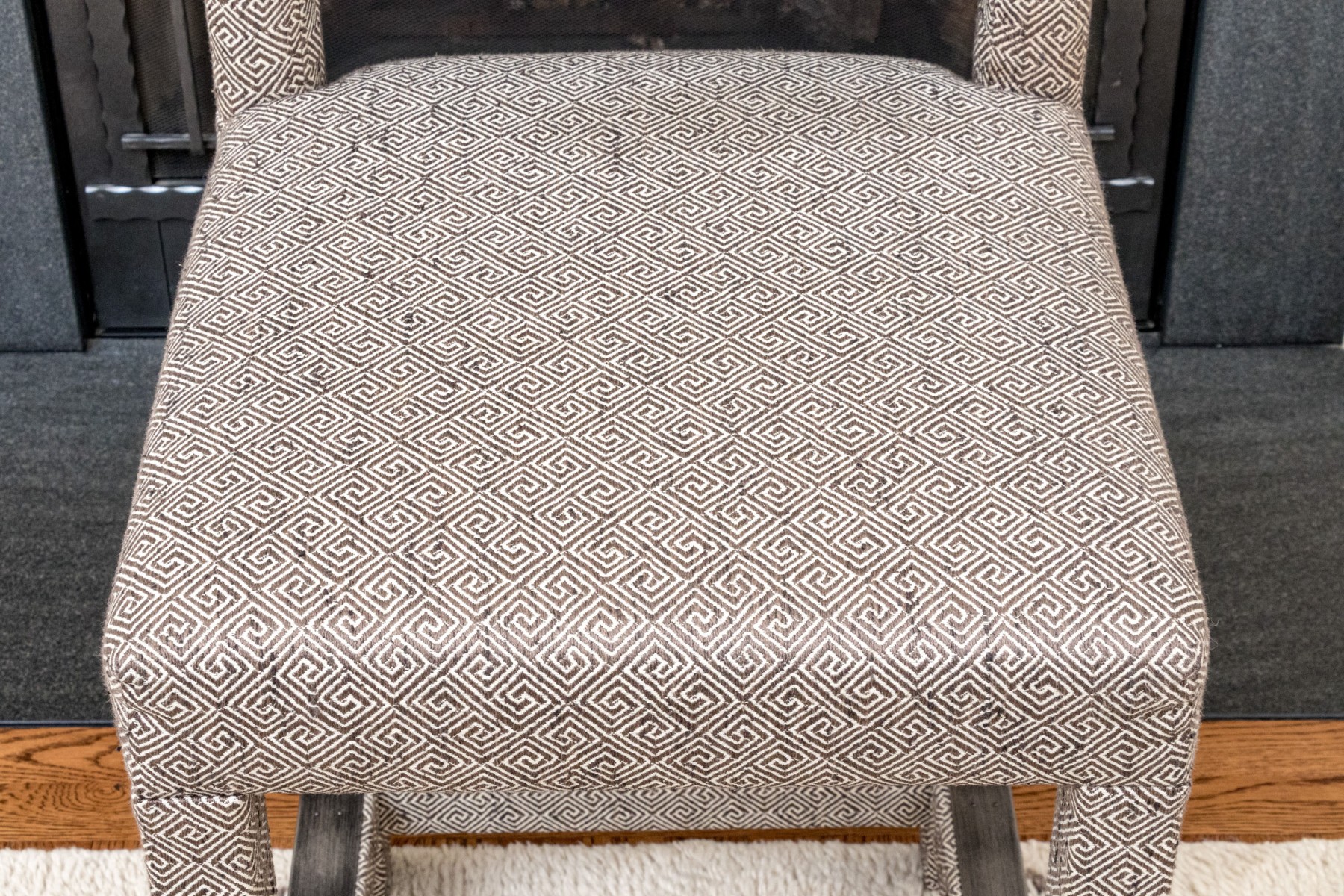 Fabricated in a charcoal geometric design. Three sided metal wrapped foot rails. Two additional stools in another lot.