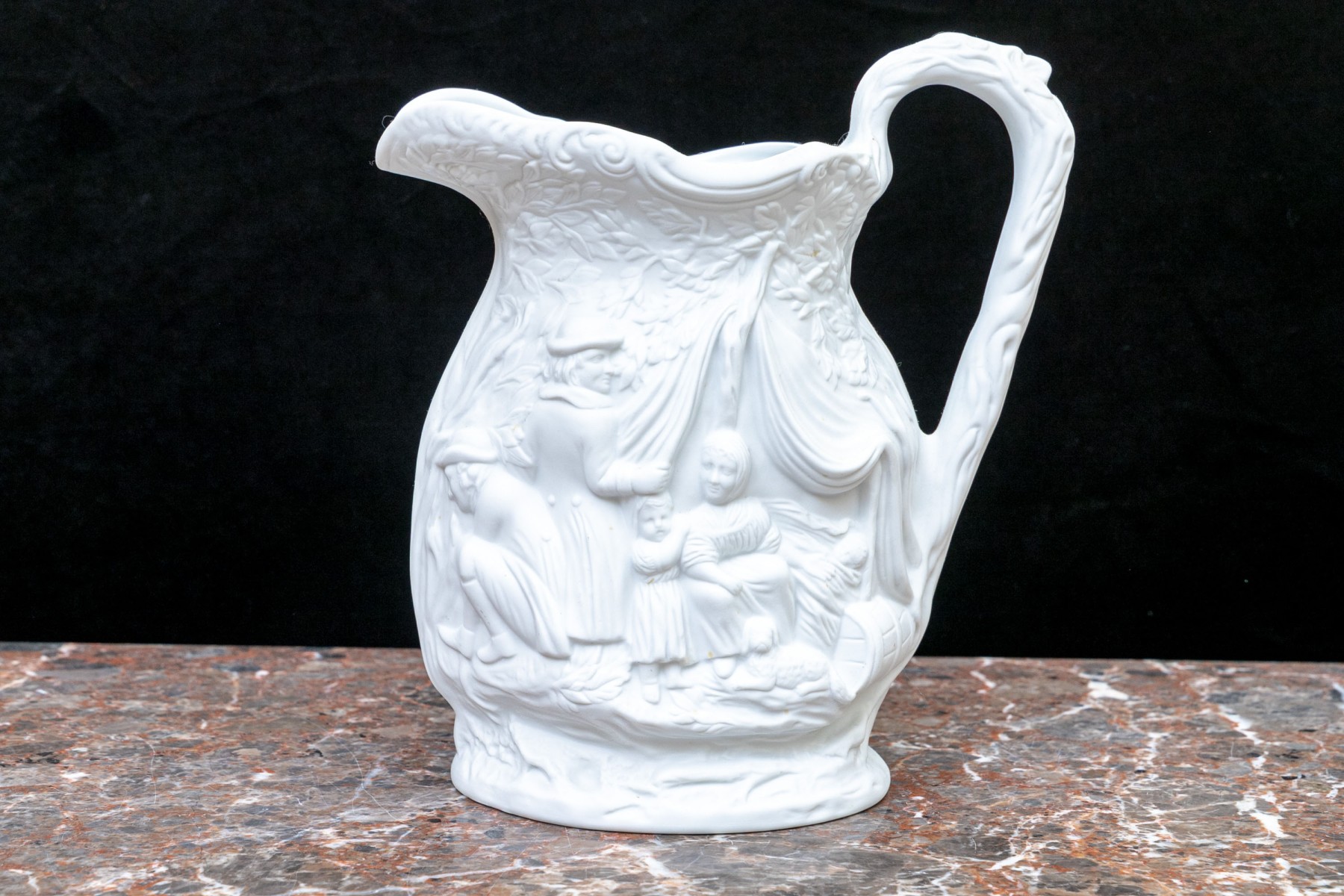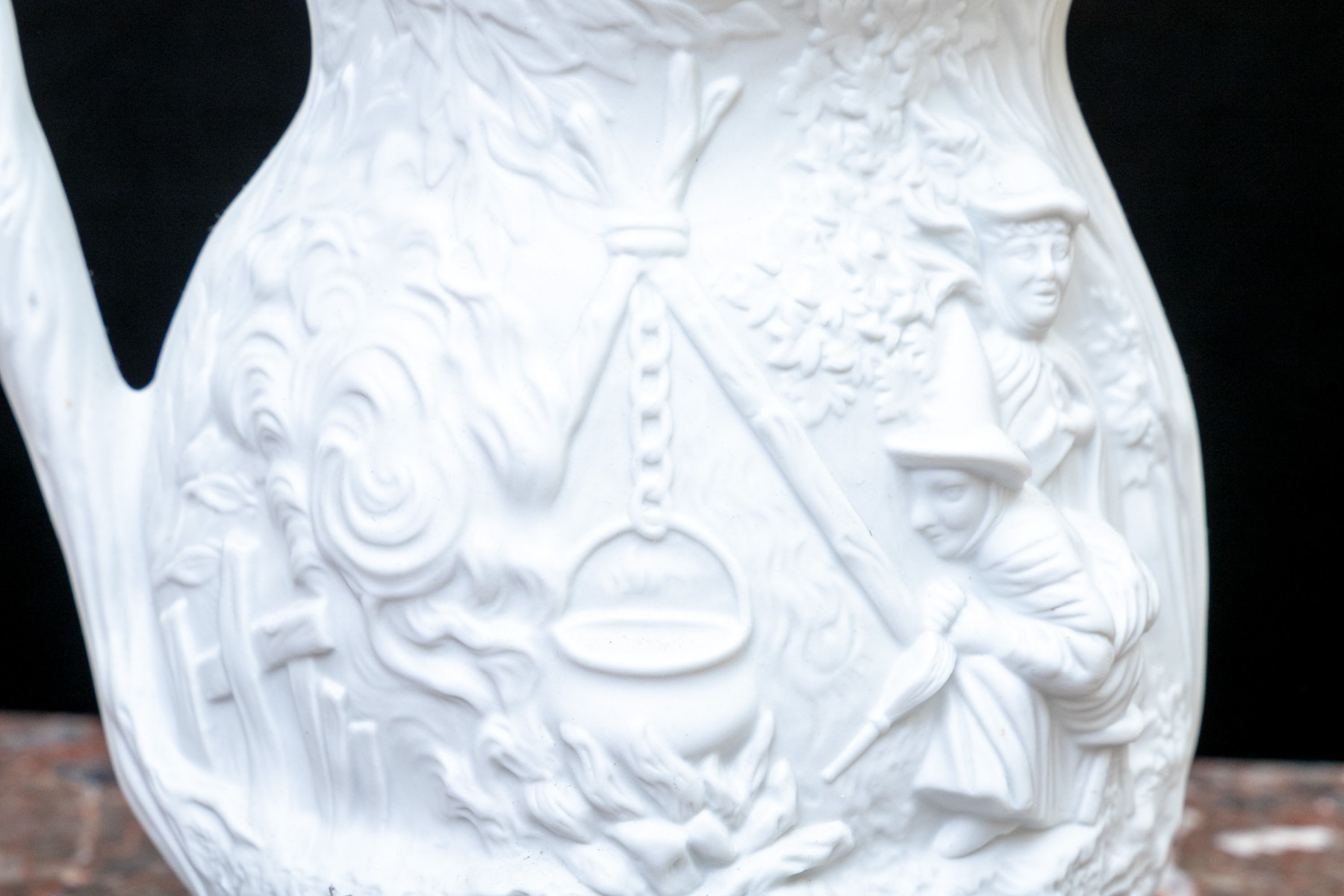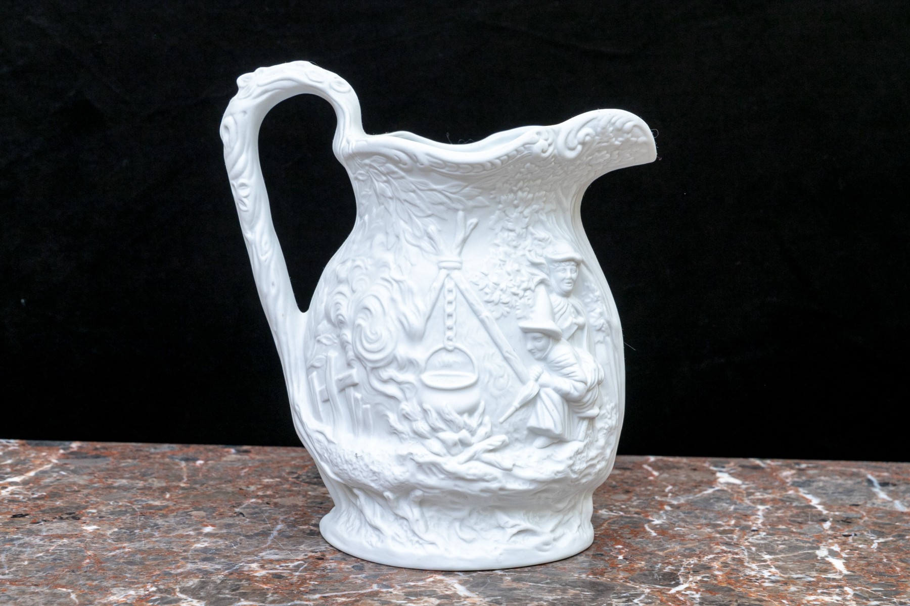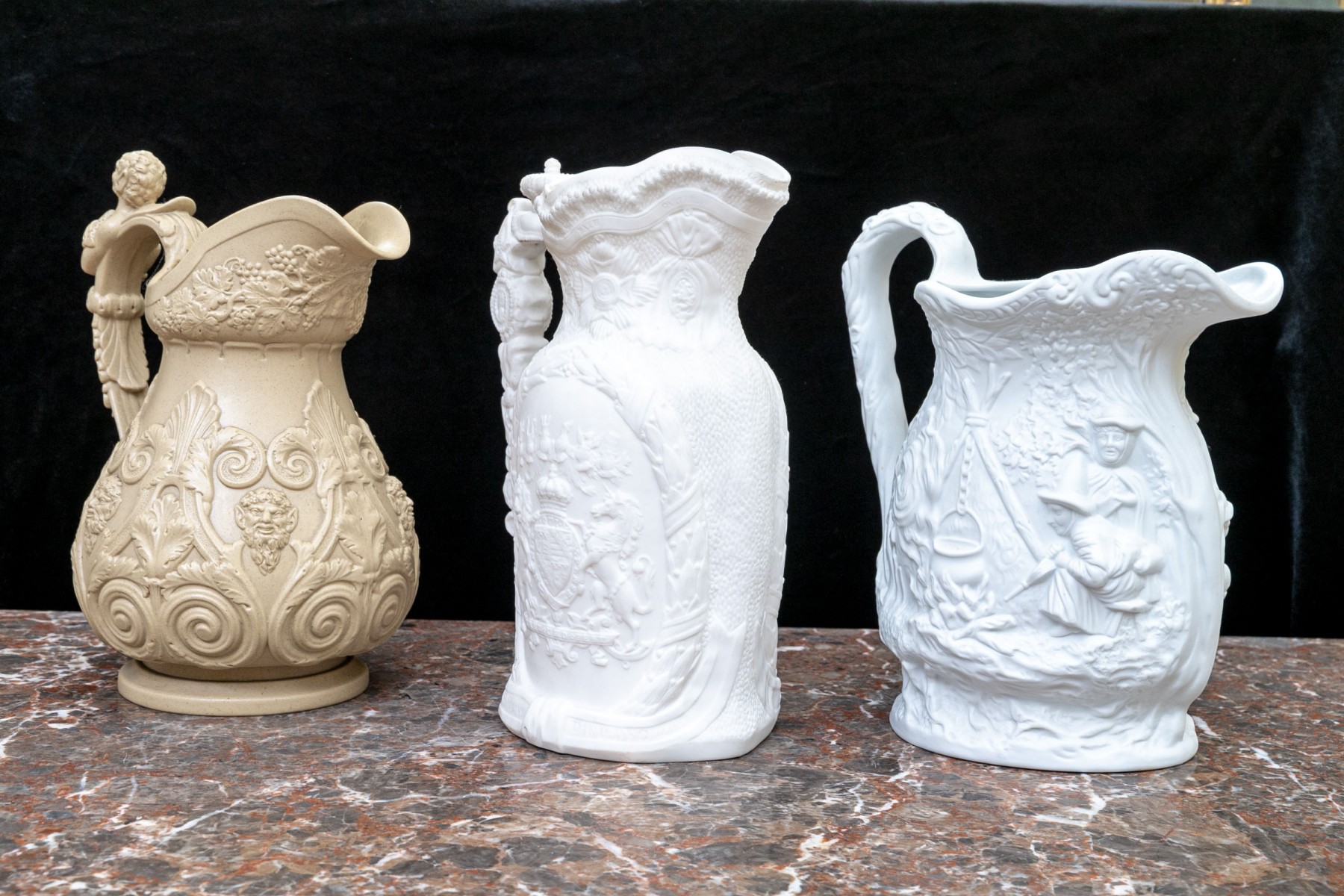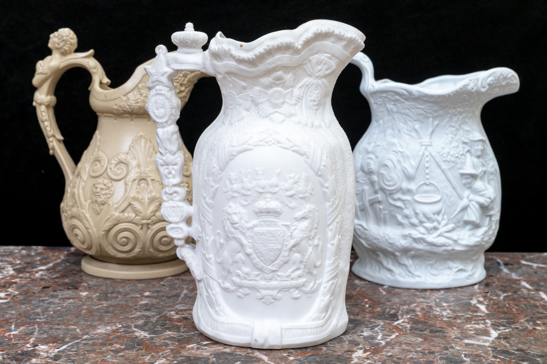 3 ceramic water pitchers, one with a prince consort, one with figures tending to a fire, and the third with a figural handle.