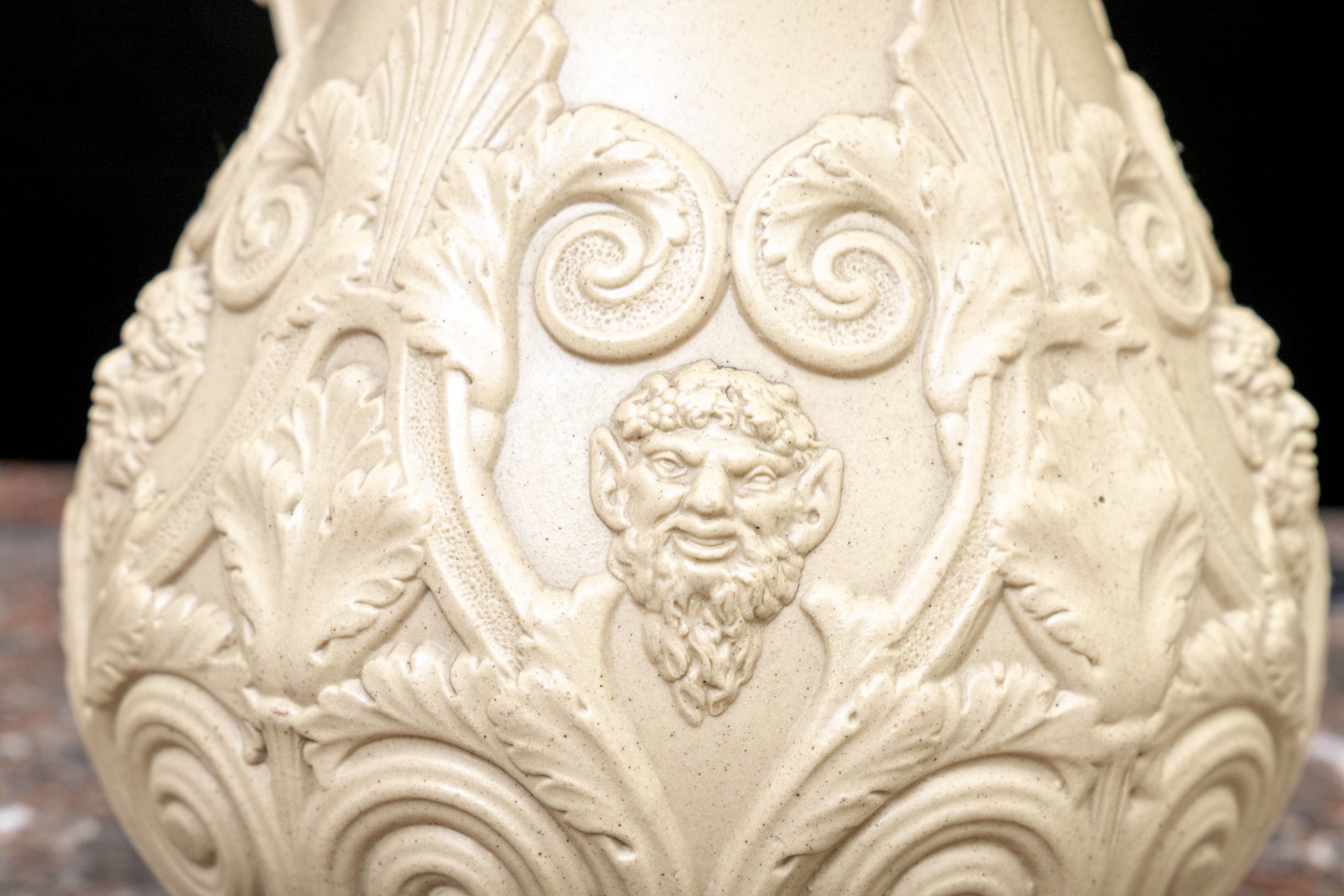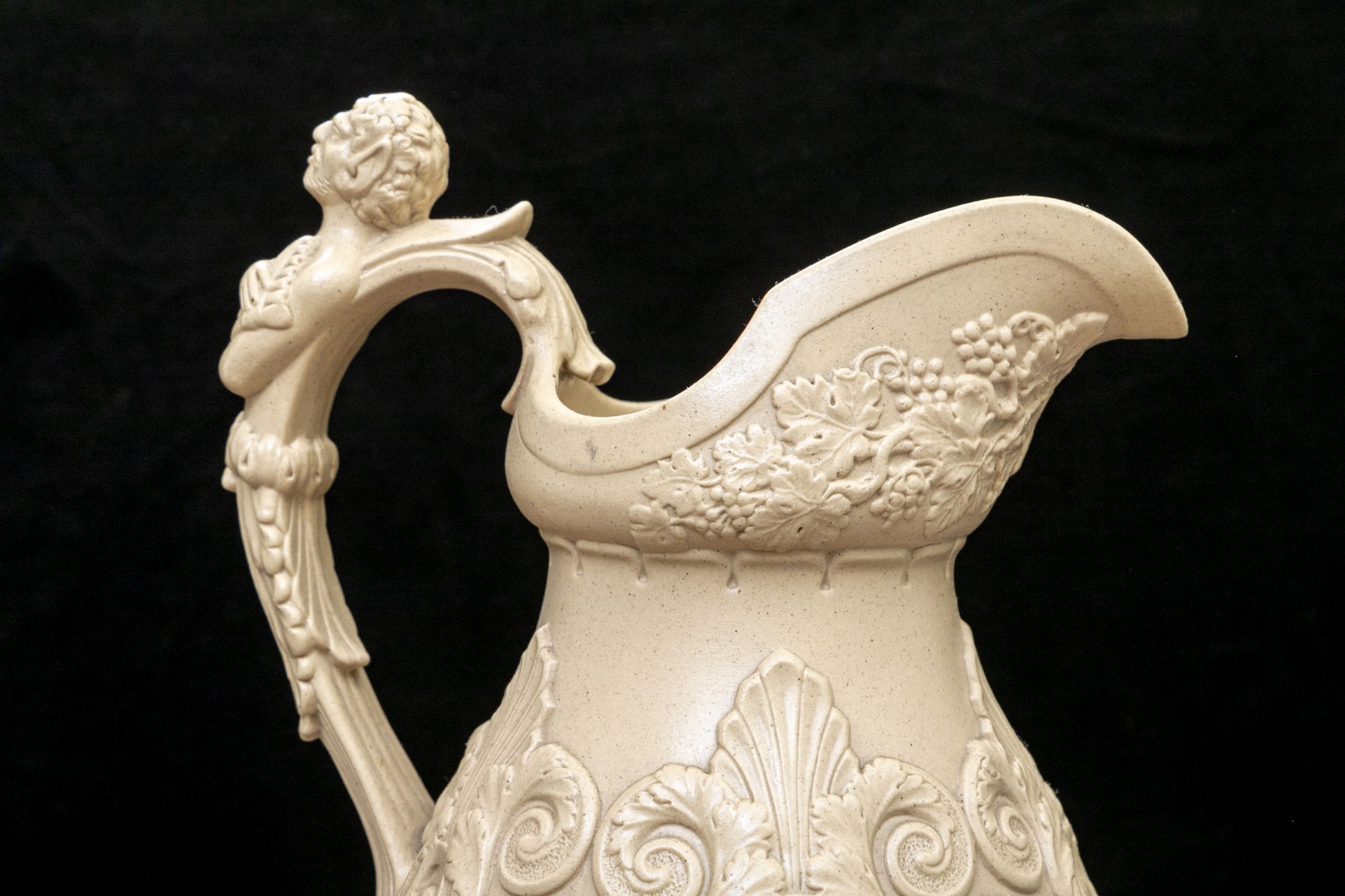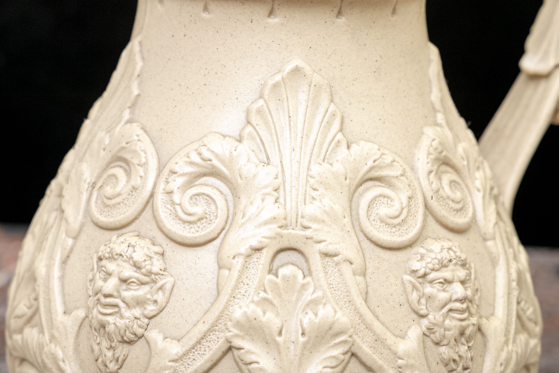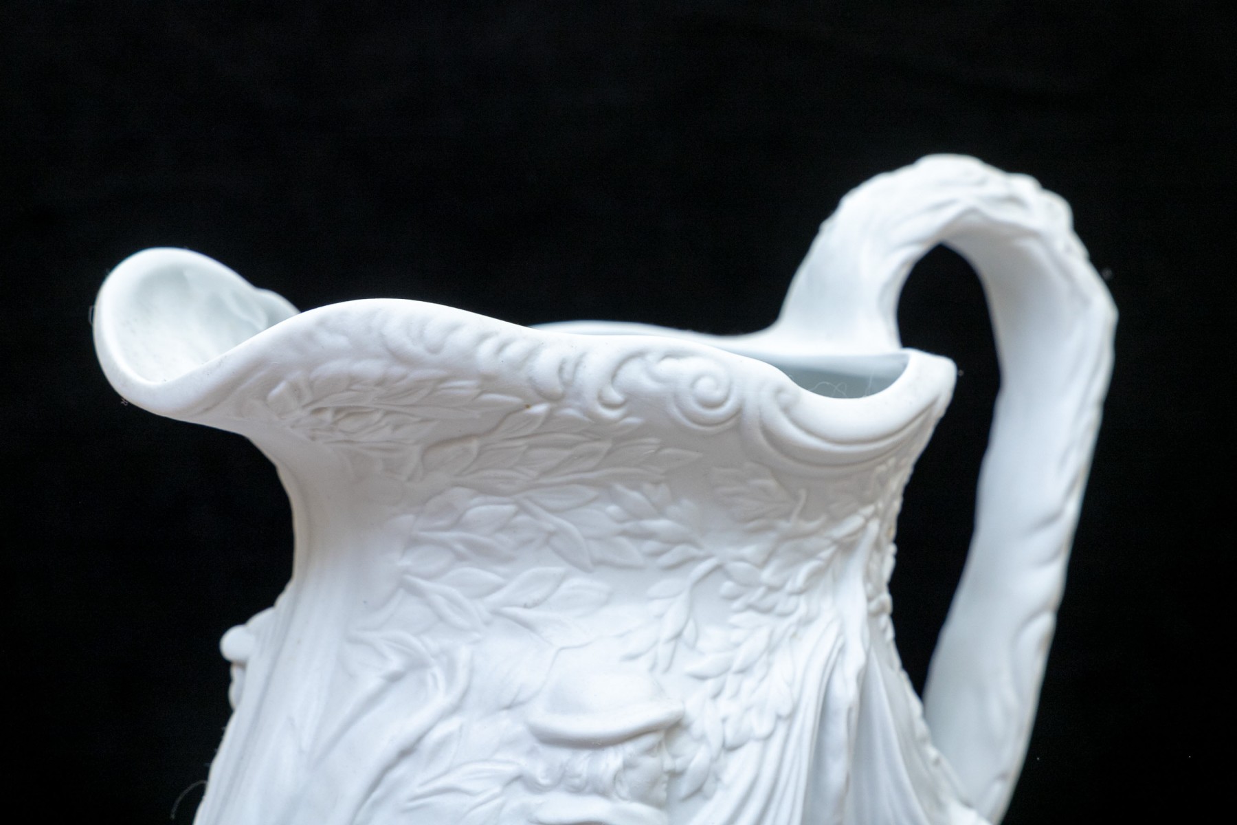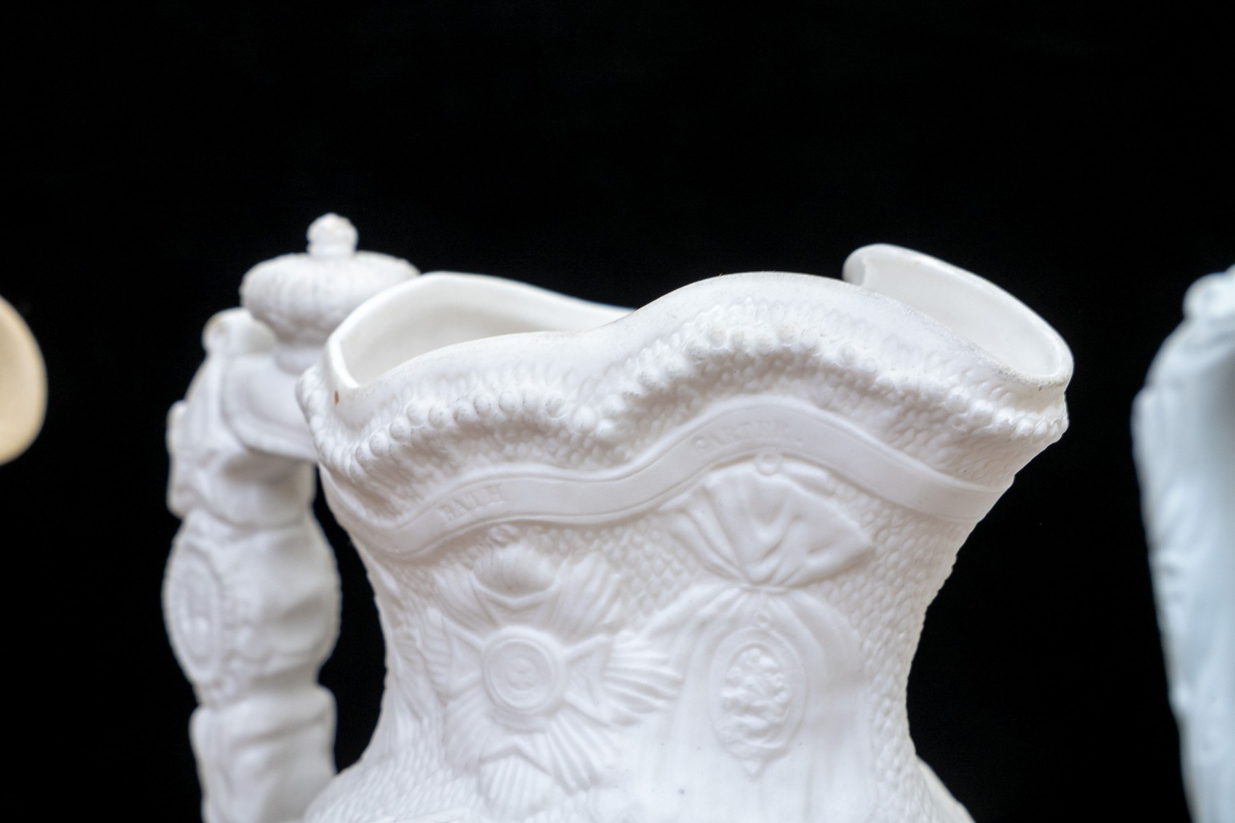 3 ceramic water pitchers, one with a prince consort, one with figures tending to a fire, and the third with a figural handle.