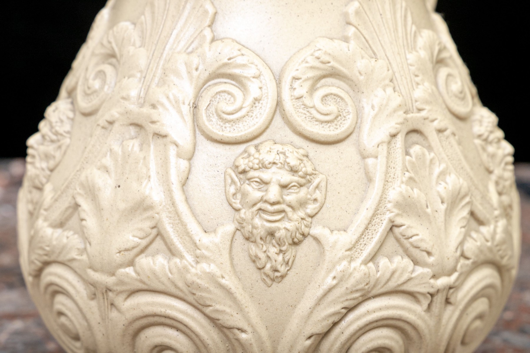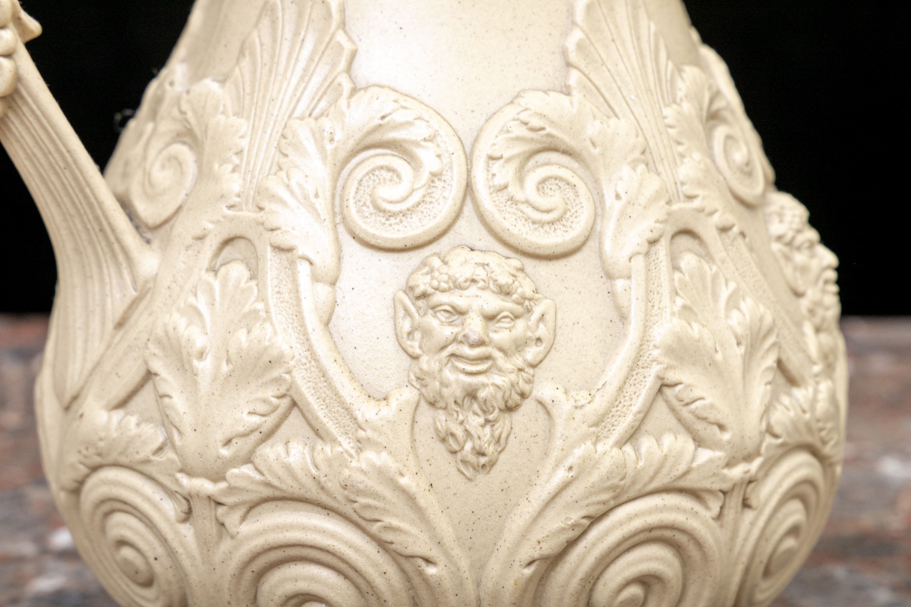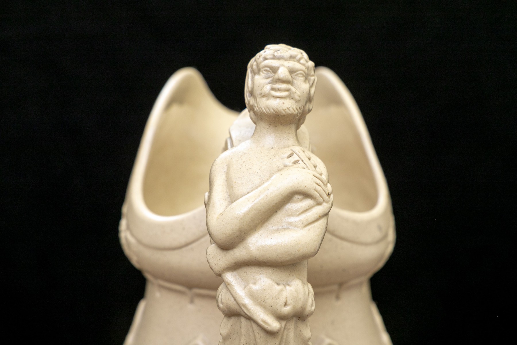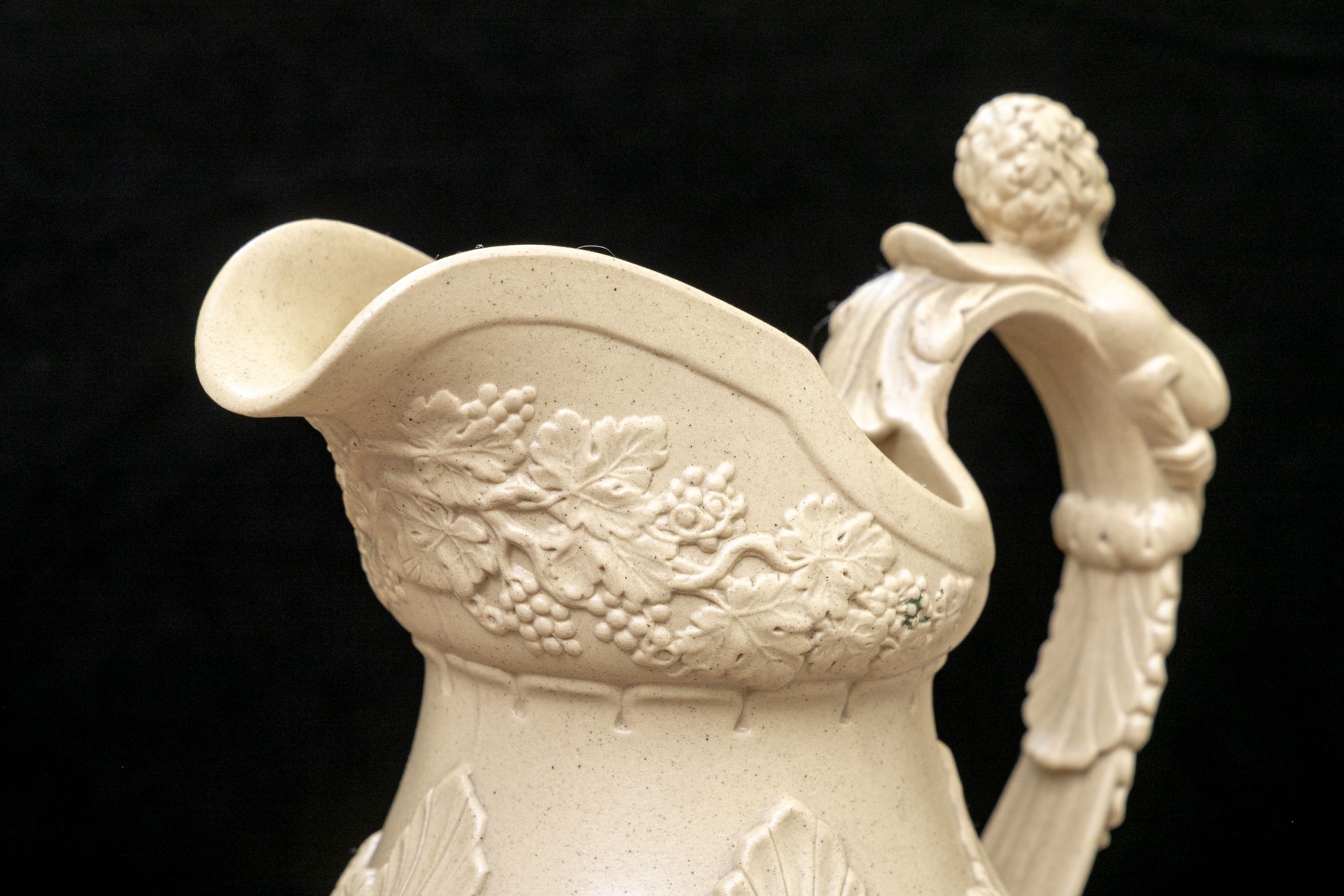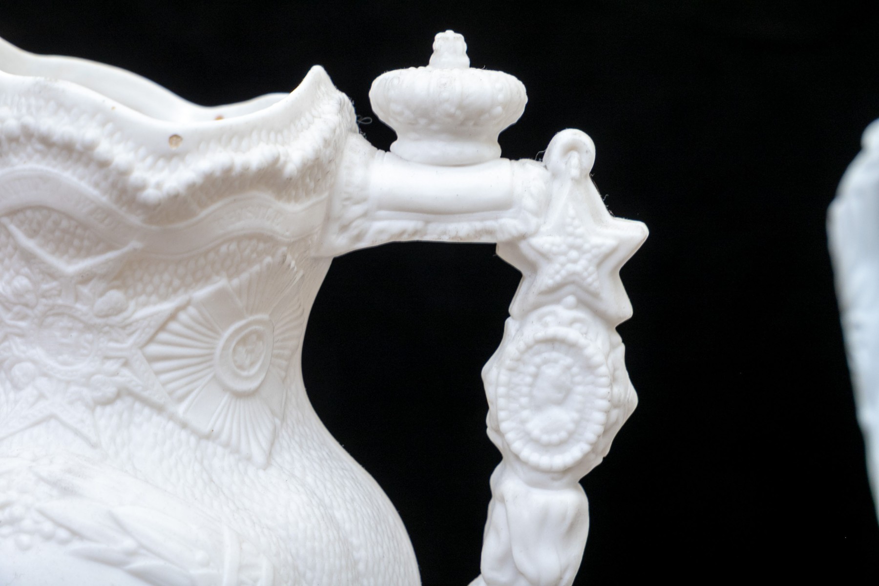 3 ceramic water pitchers, one with a prince consort, one with figures tending to a fire, and the third with a figural handle.