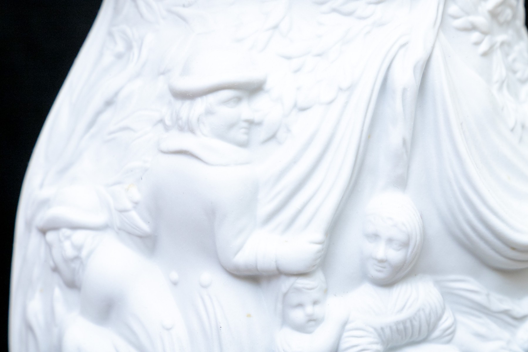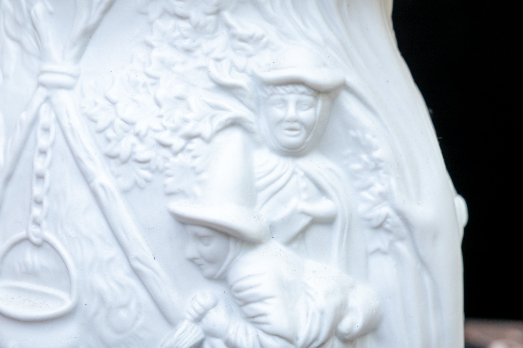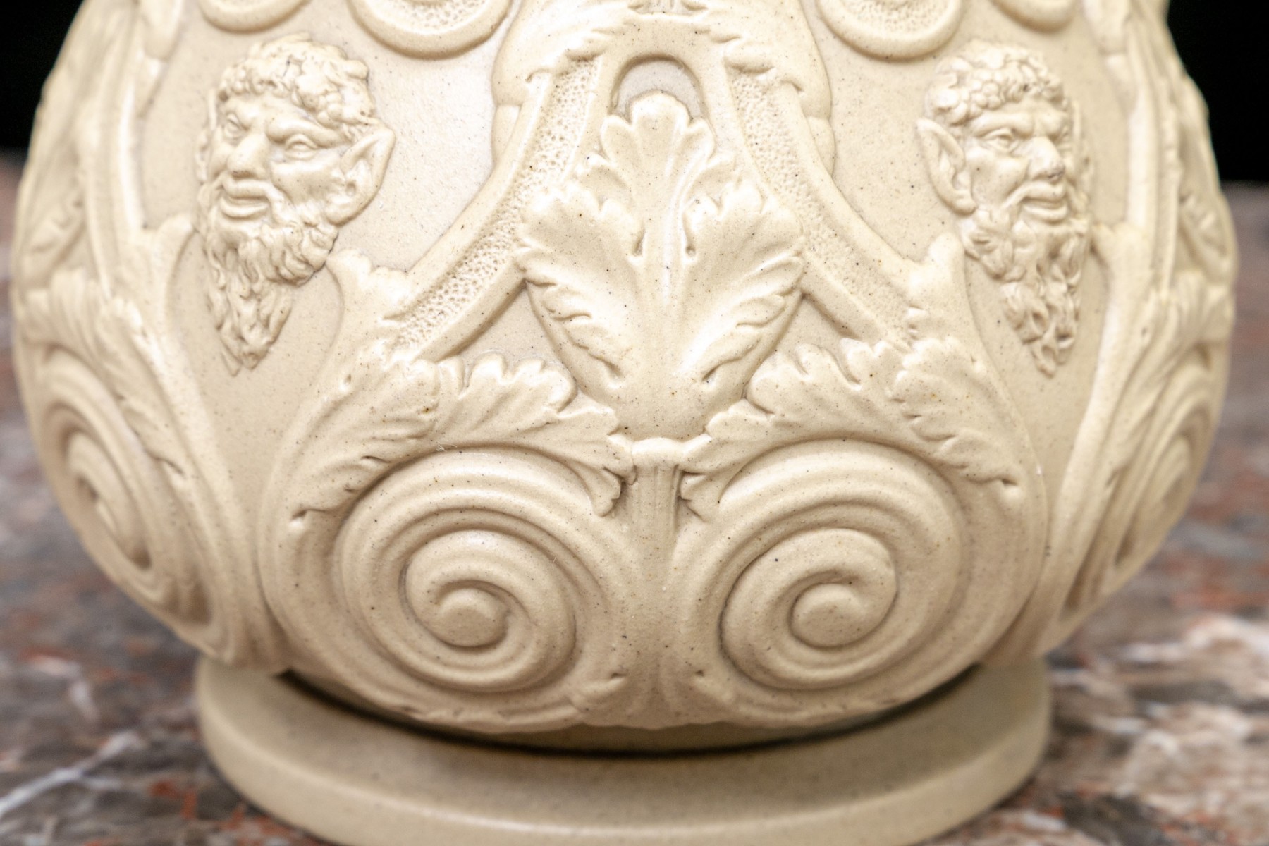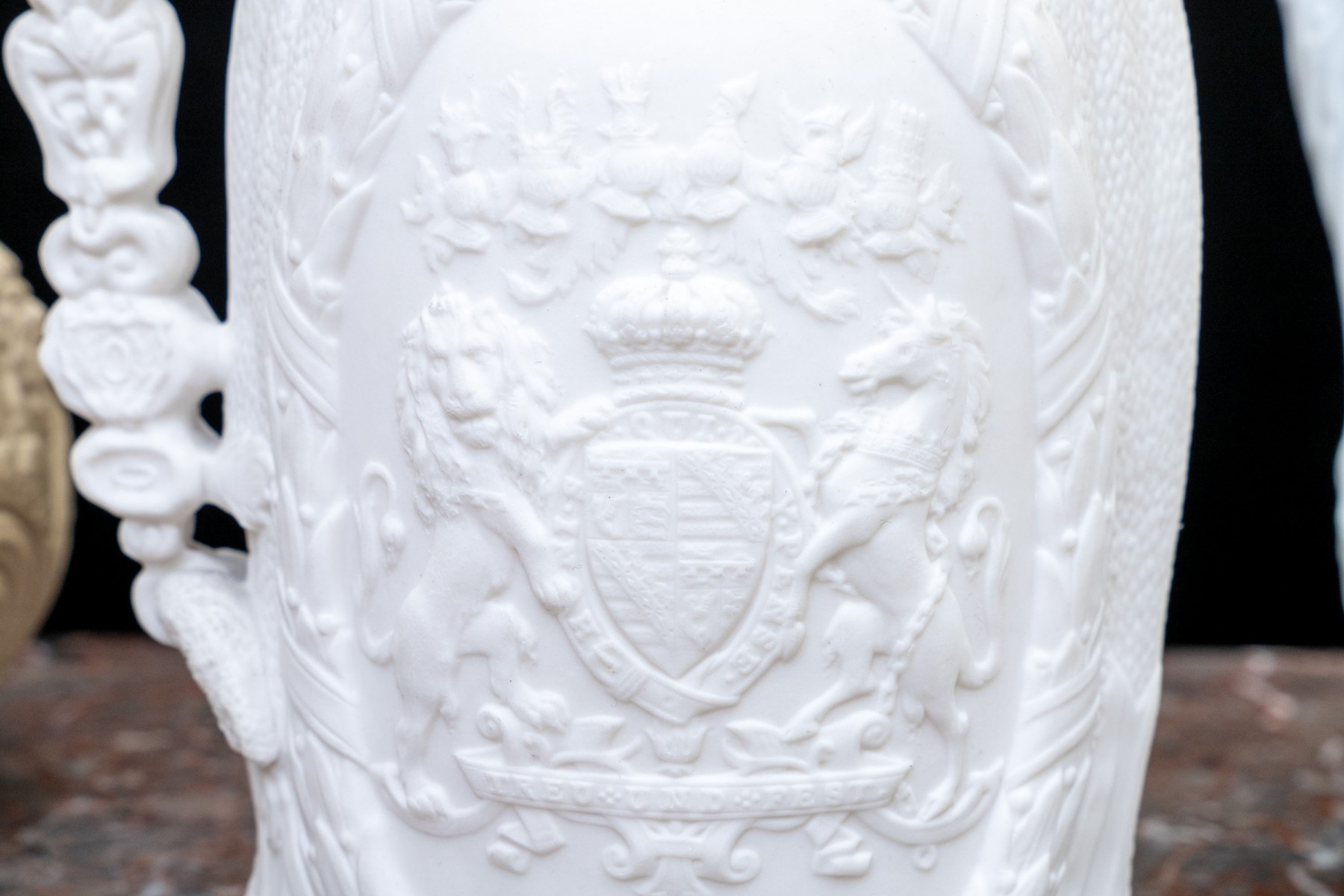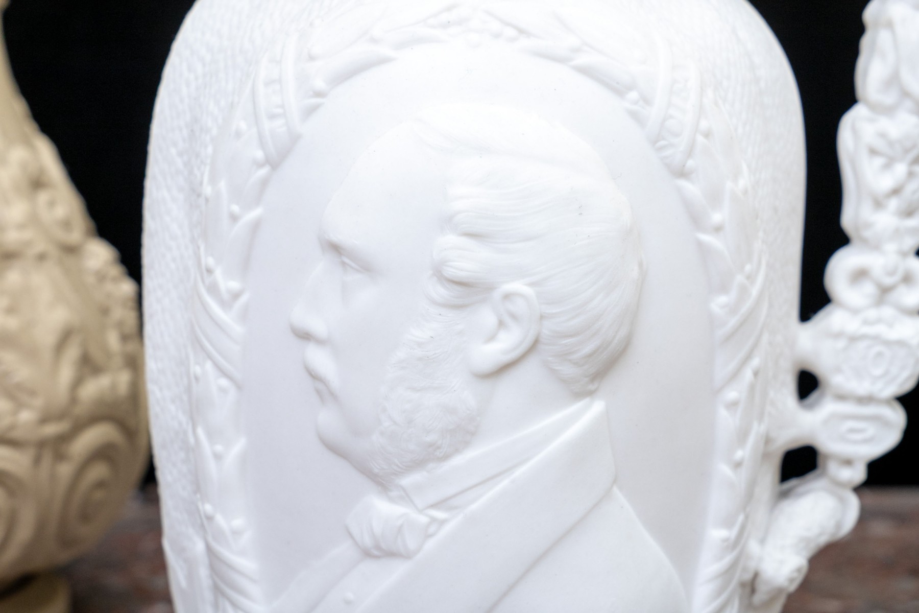 3 ceramic water pitchers, one with a prince consort, one with figures tending to a fire, and the third with a figural handle.