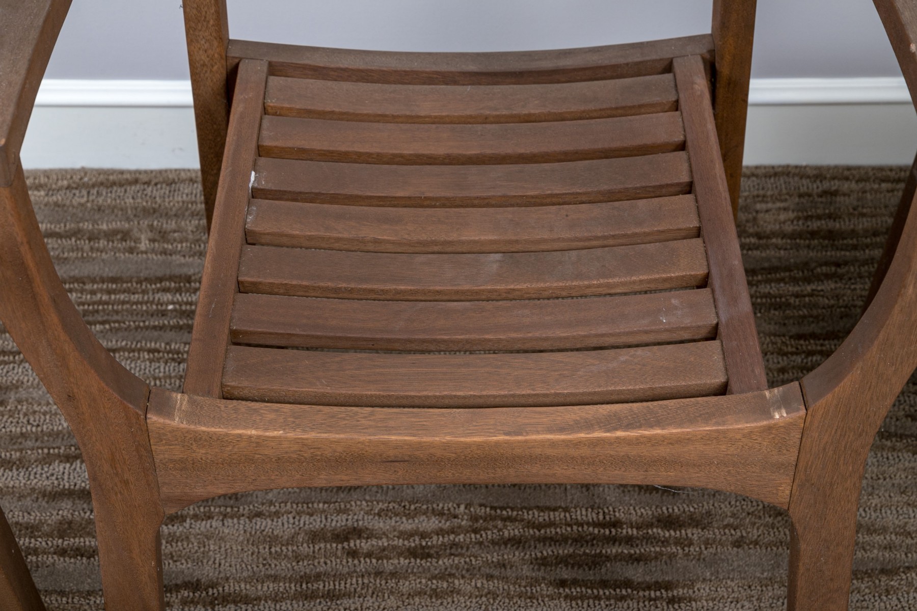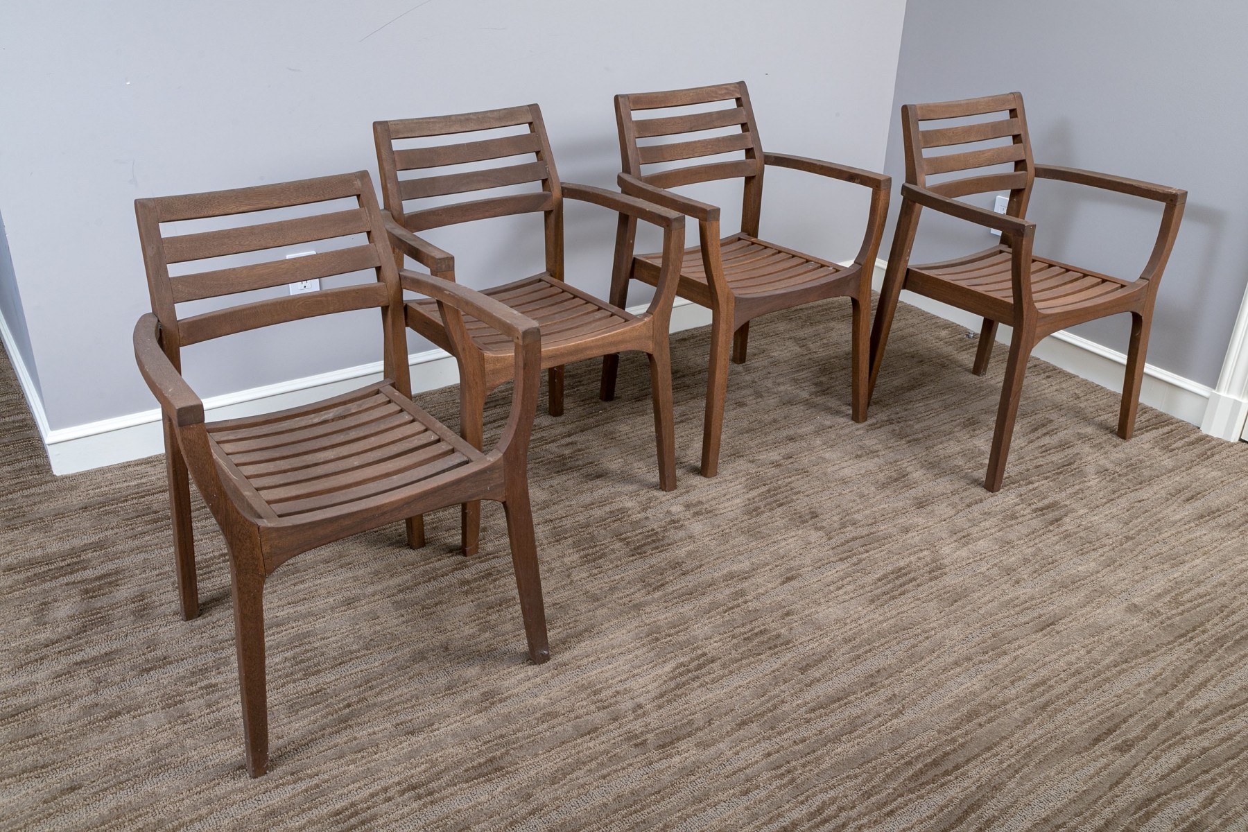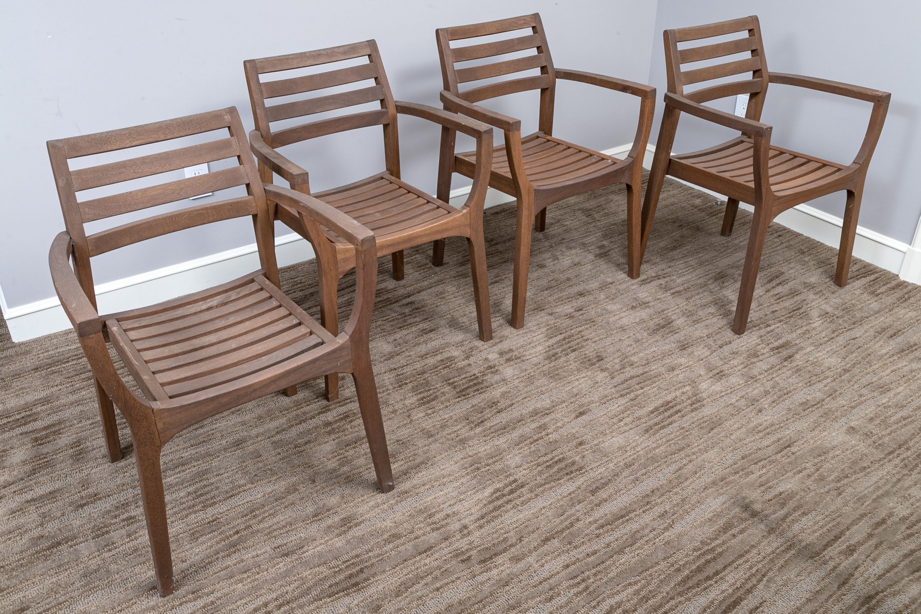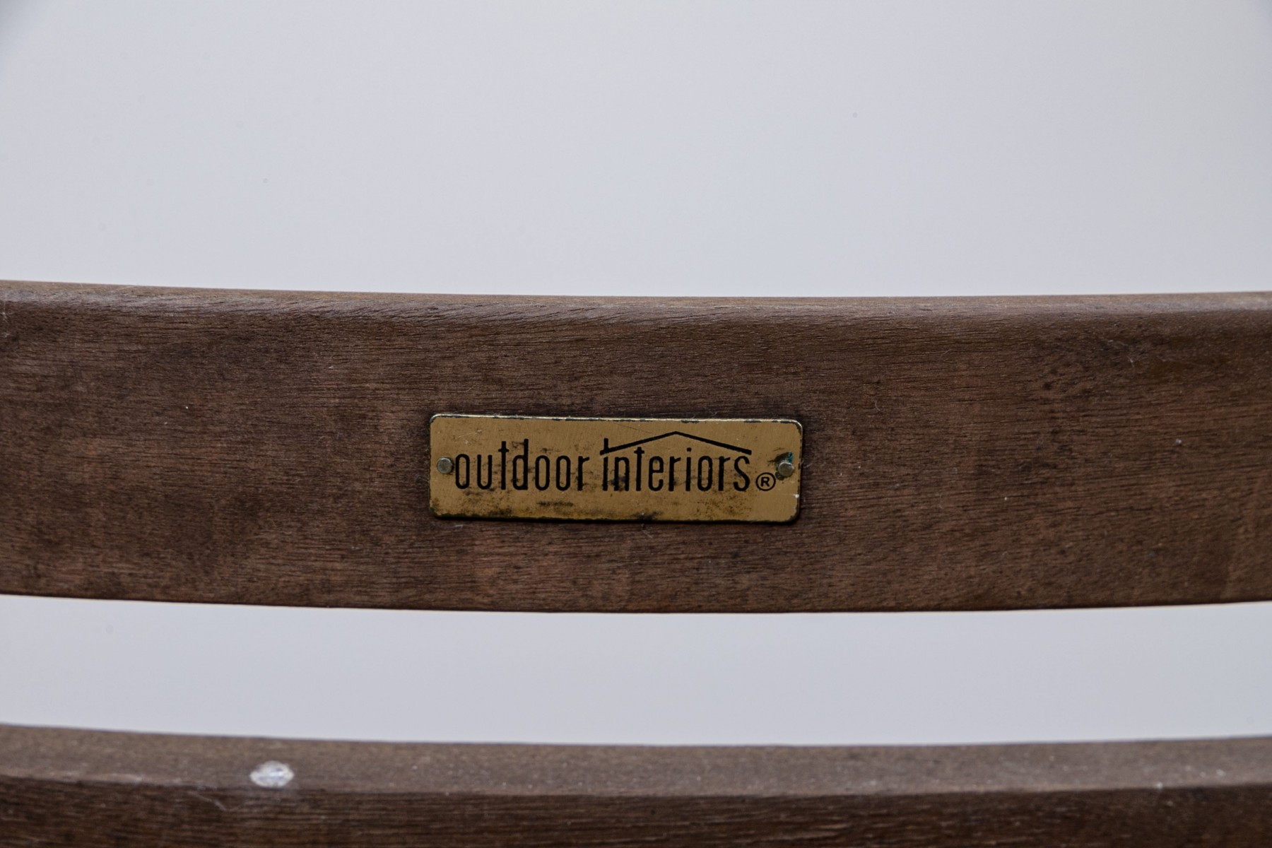 Set of four Outdoor Interiors teakwood armchairs with slatted backs and seats. Bears the Outdoor Interiors label.