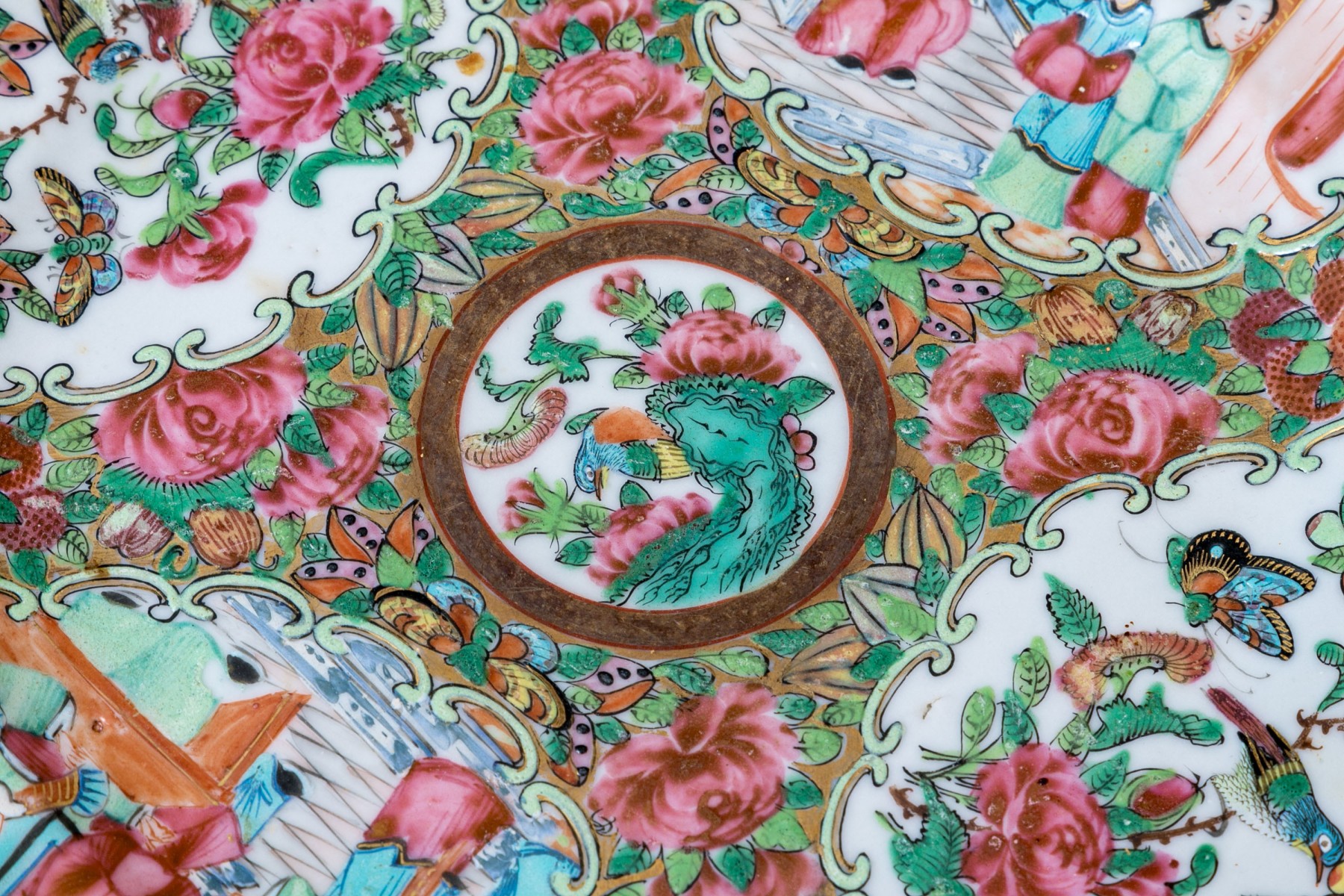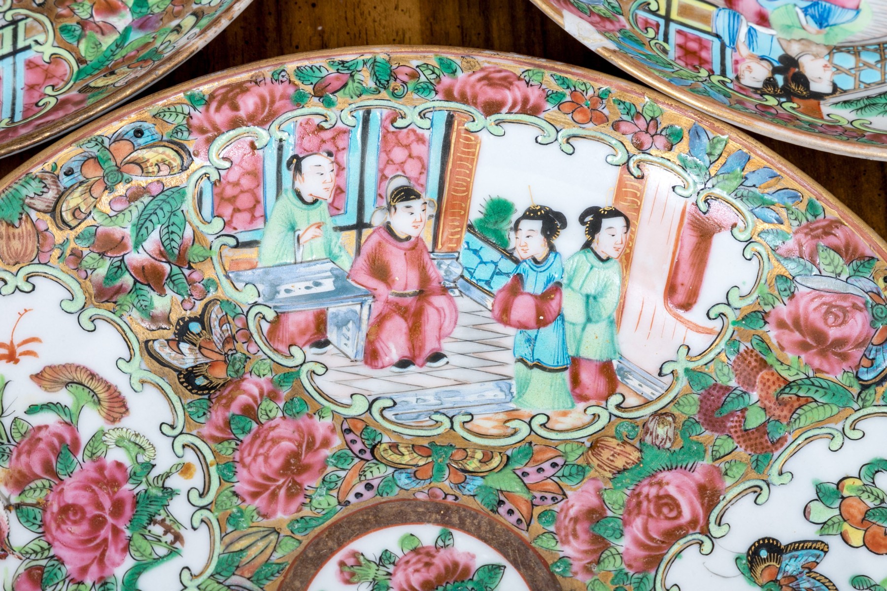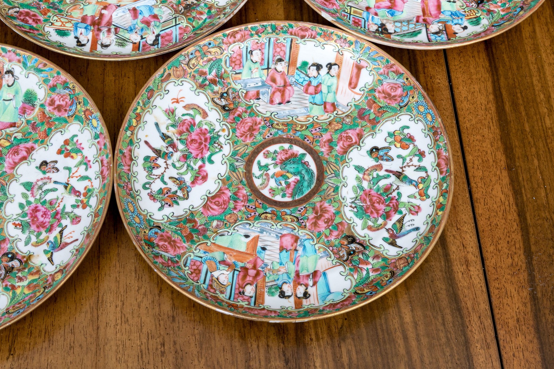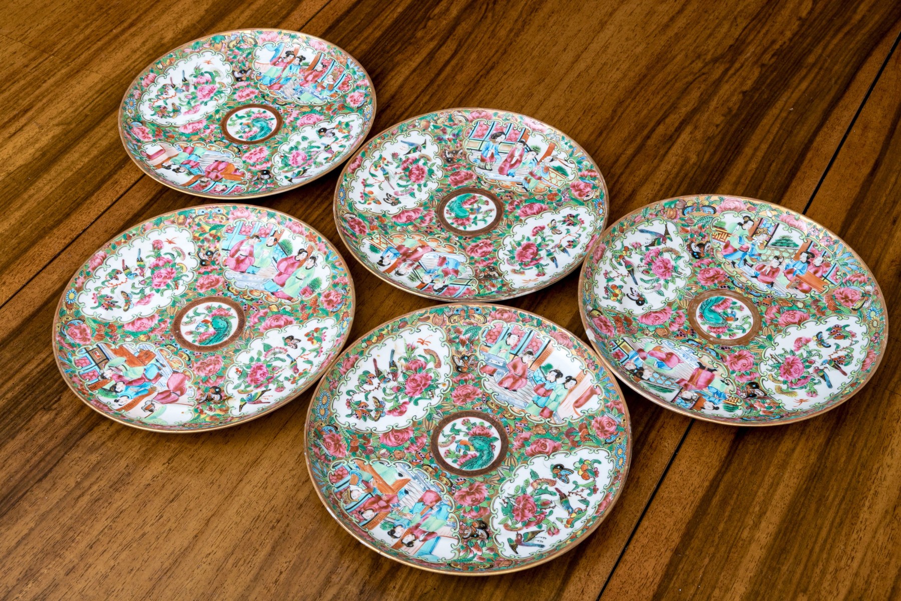 A lovely collection of 5 antique Chinese export rose medallion porcelain dishes with alternating reserves depicting figural landscapes with floral, birds and butterfly reserves and gilt finished rims.
