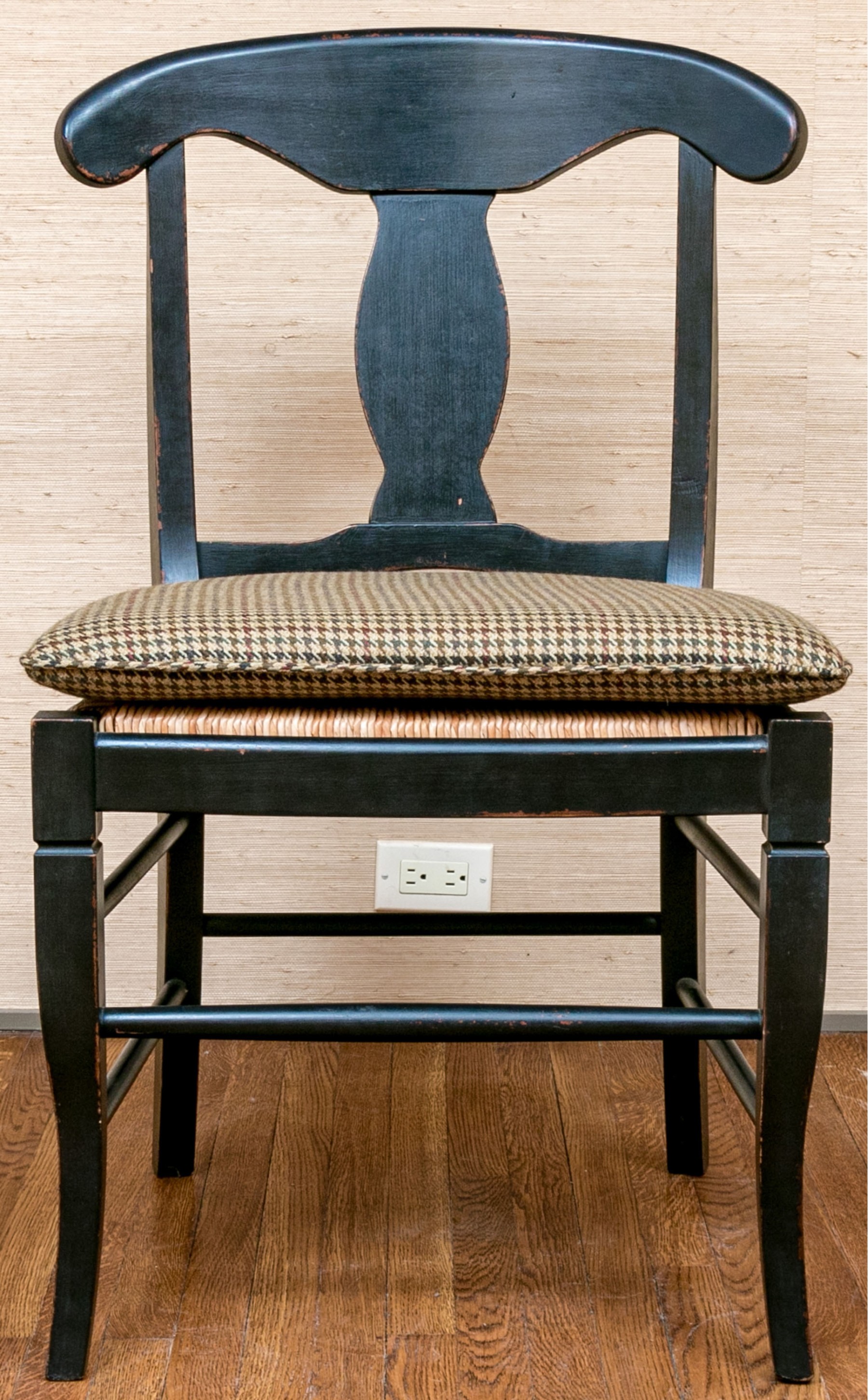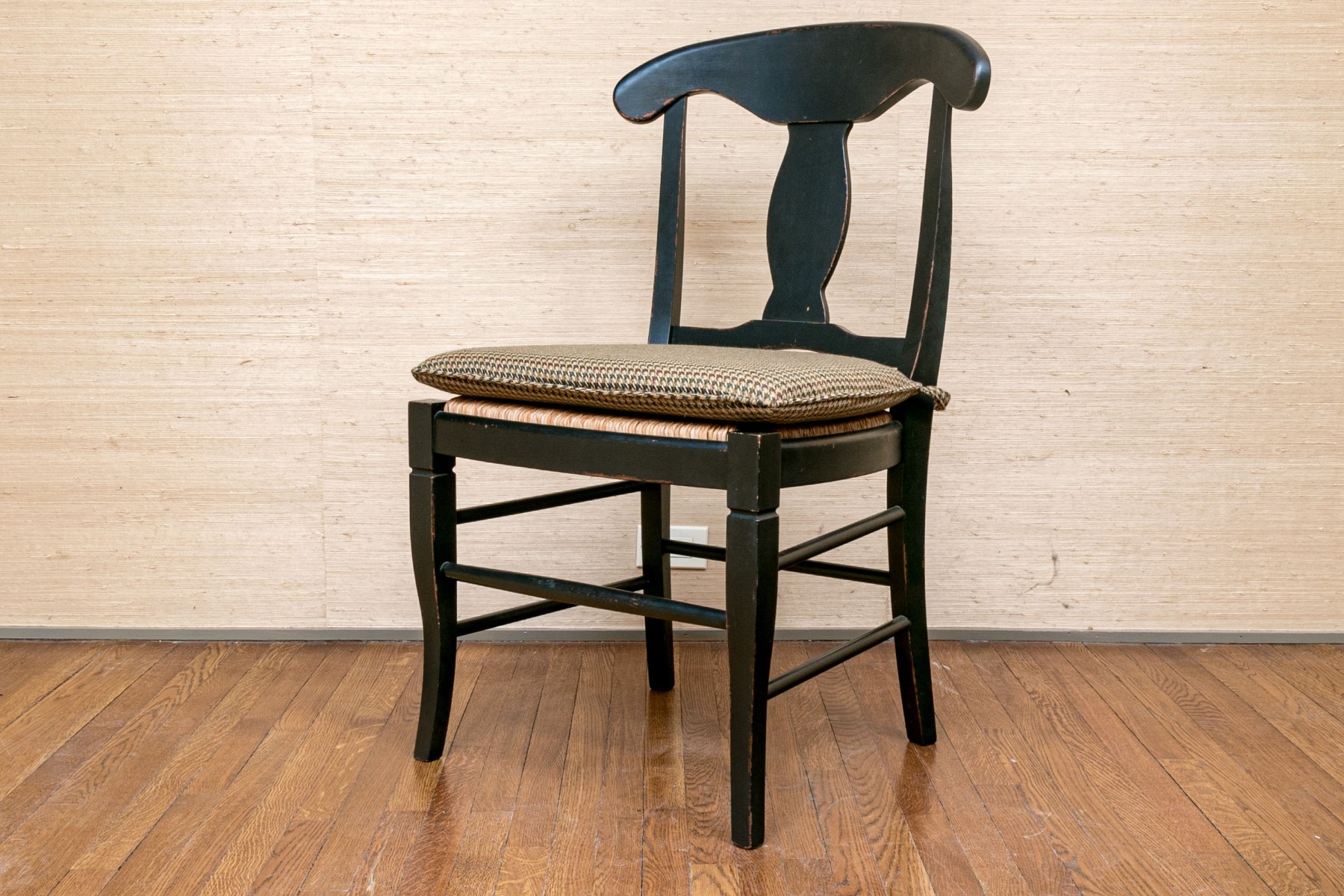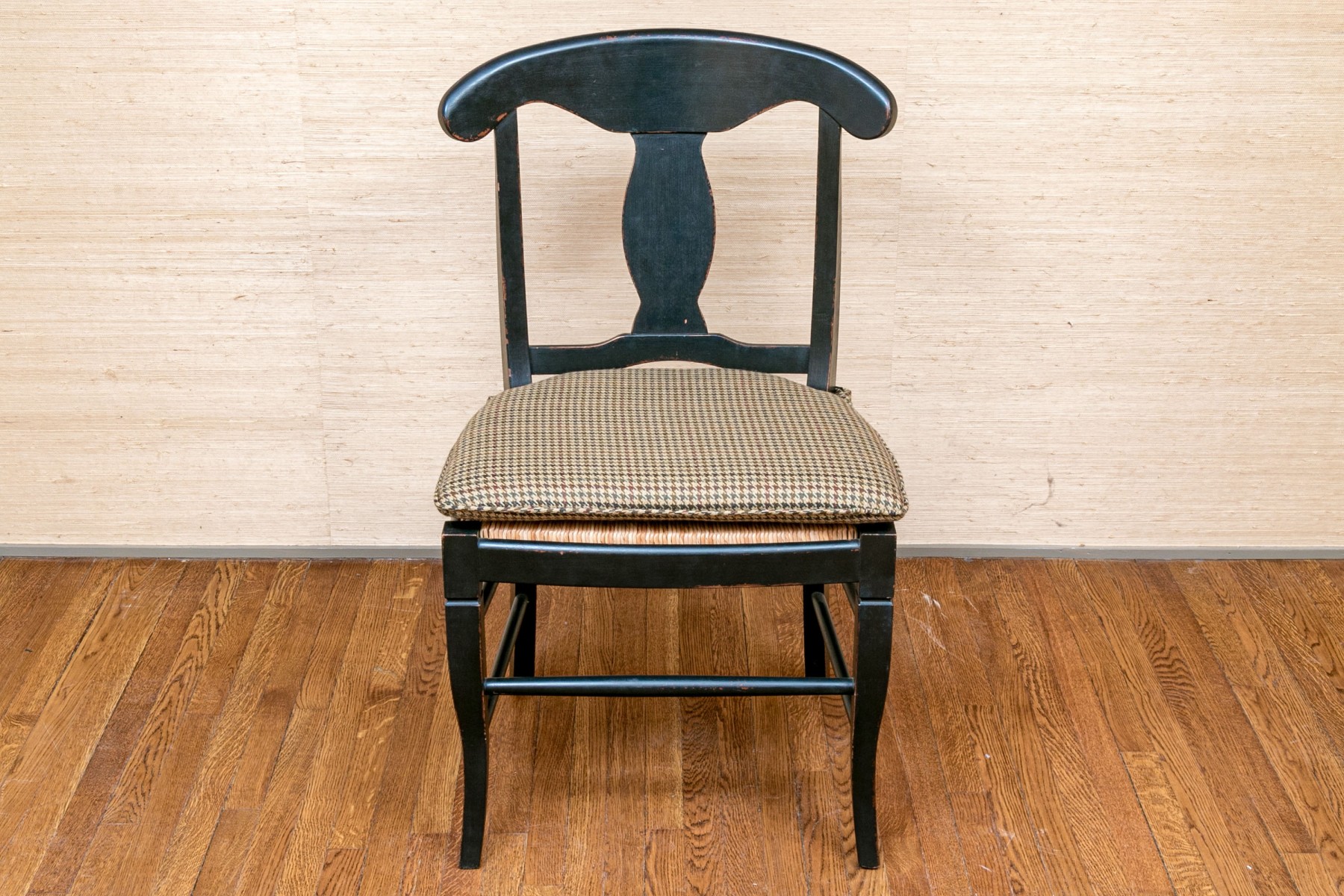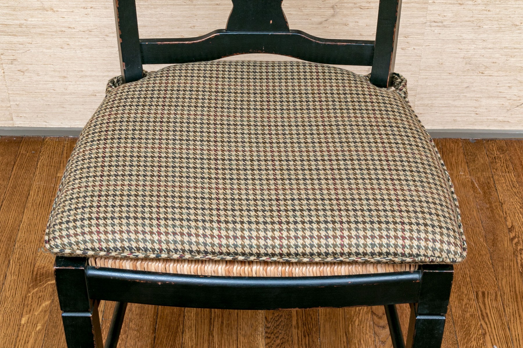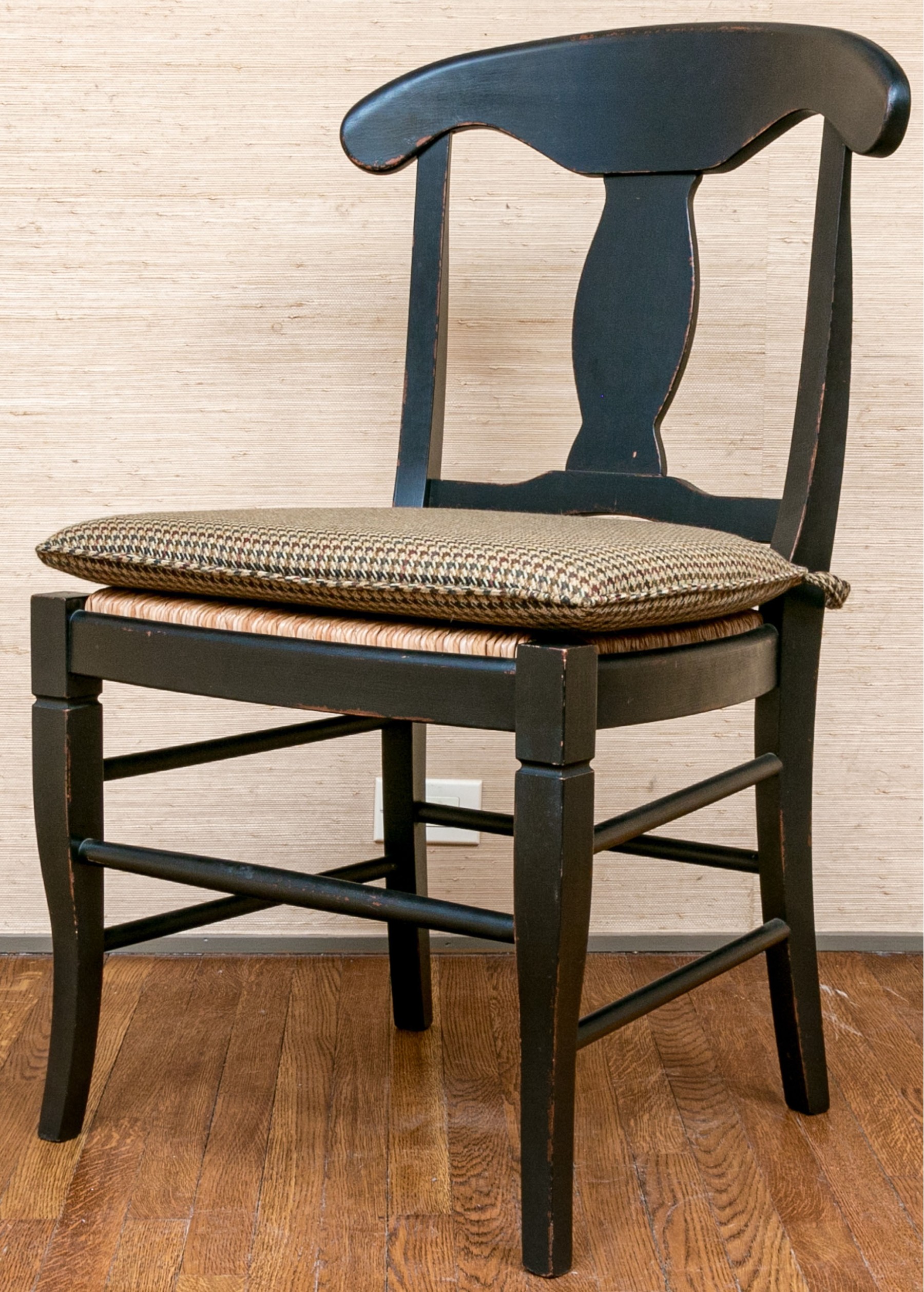 The provincial style dining chairs are handsomely presented with a black finish, rush seats with upholstered Ralph Lauren seat cushions. The chairs have a carved back vaseform splat with rounded top rail.