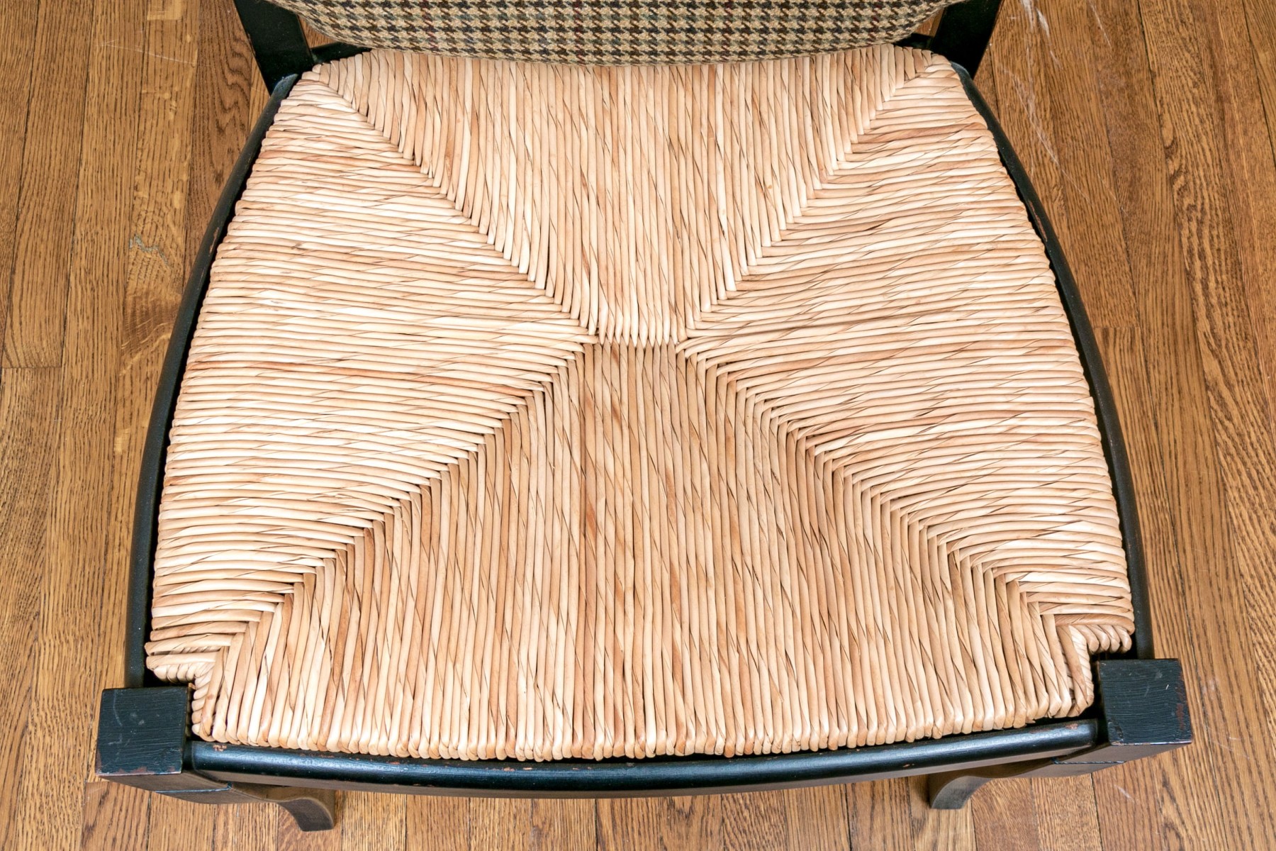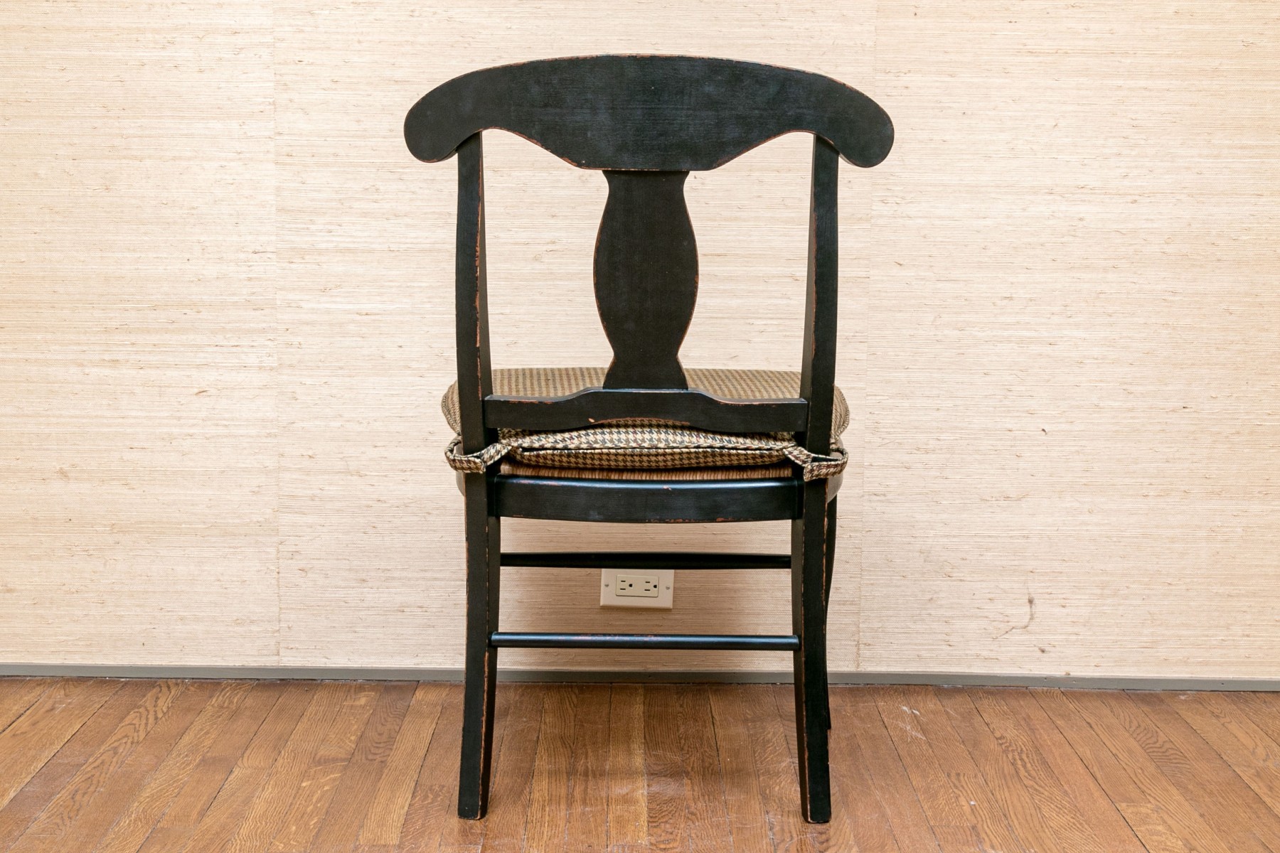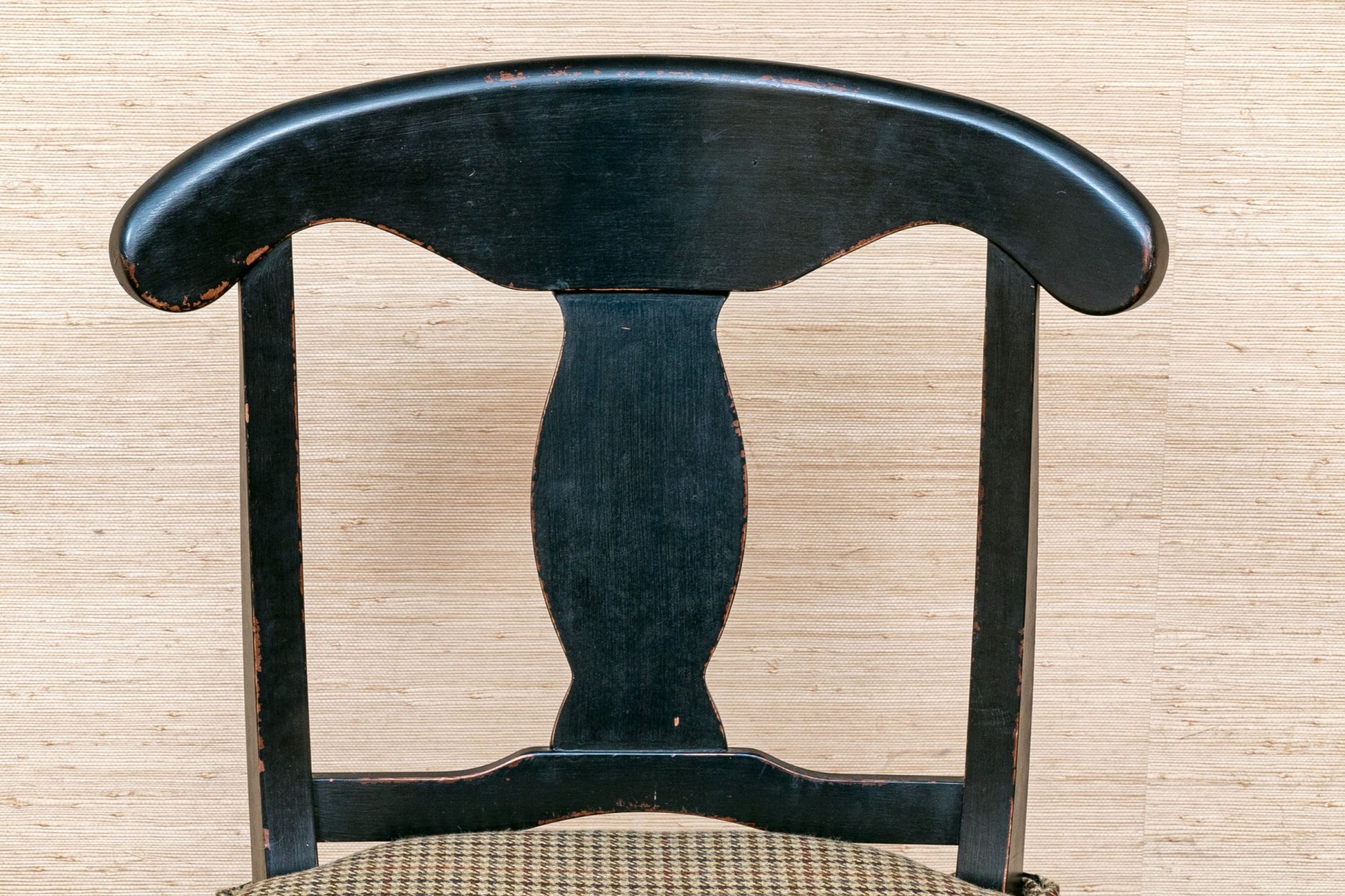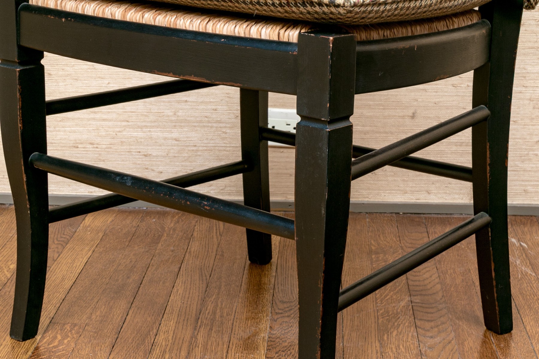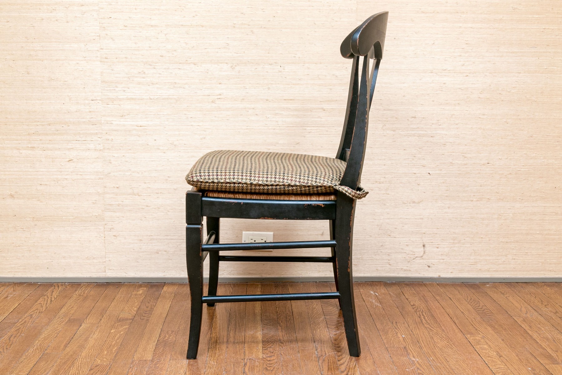 The provincial style dining chairs are handsomely presented with a black finish, rush seats with upholstered Ralph Lauren seat cushions. The chairs have a carved back vaseform splat with rounded top rail.