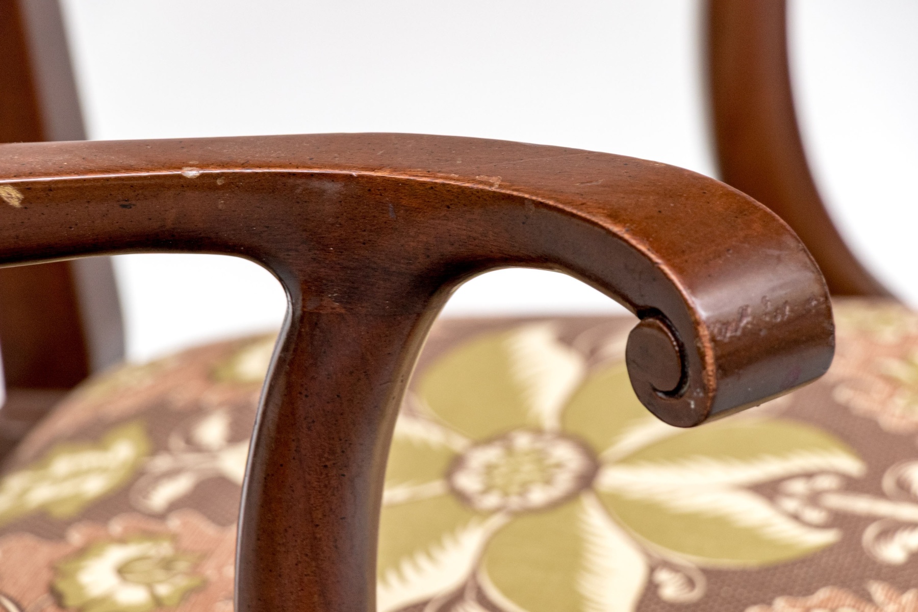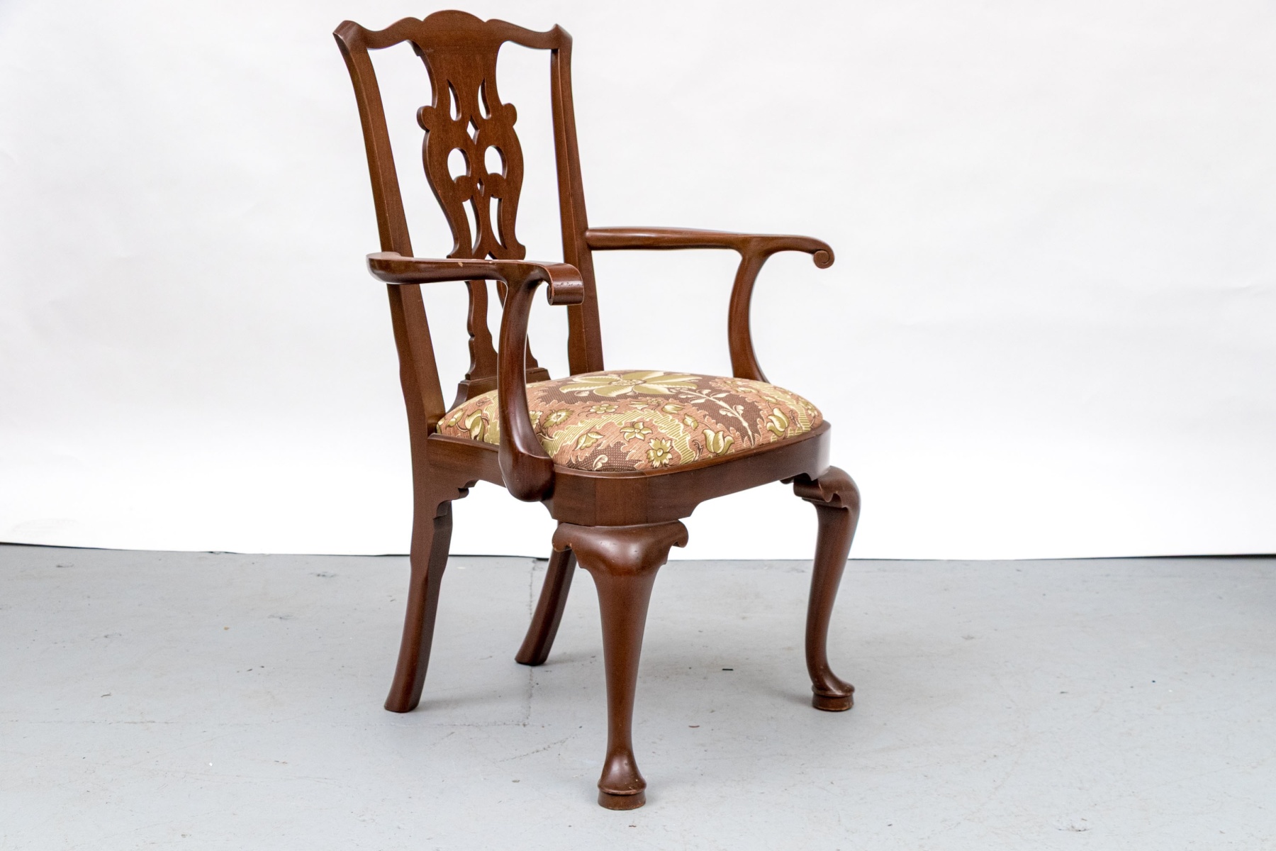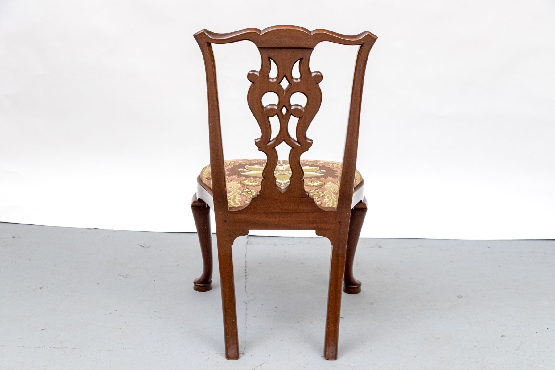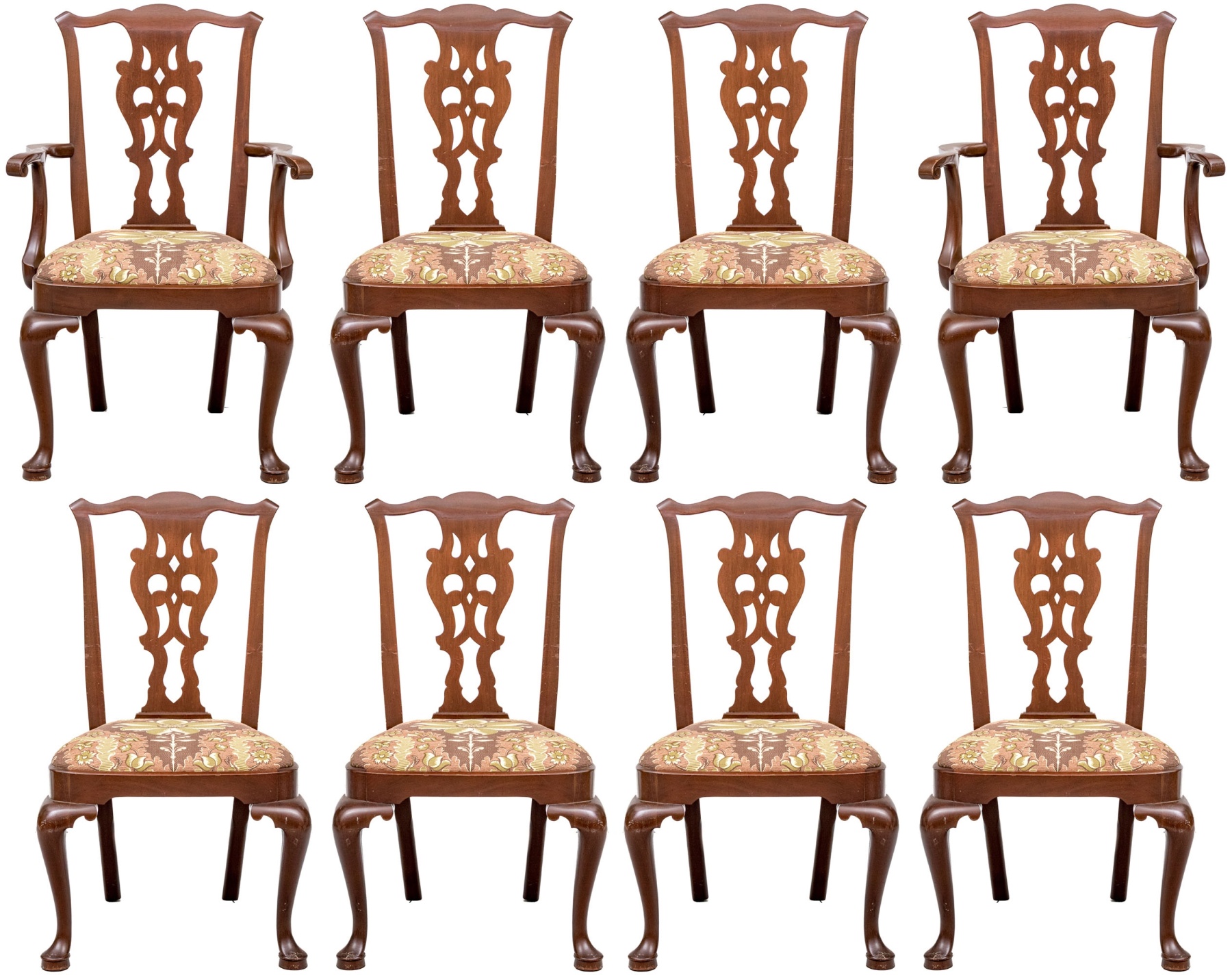 A very well made set with corner-blocking, good weight and fine comfort. Including two arm and six side chairs. Georgian style with classic shaped crest rails and pierced back splats. Raised on front cabriole legs with carved scrolled knees and pad feet, and square splayed curved back legs. The seats upholstered in quality Clarence House fabric in a green and brown floral print.