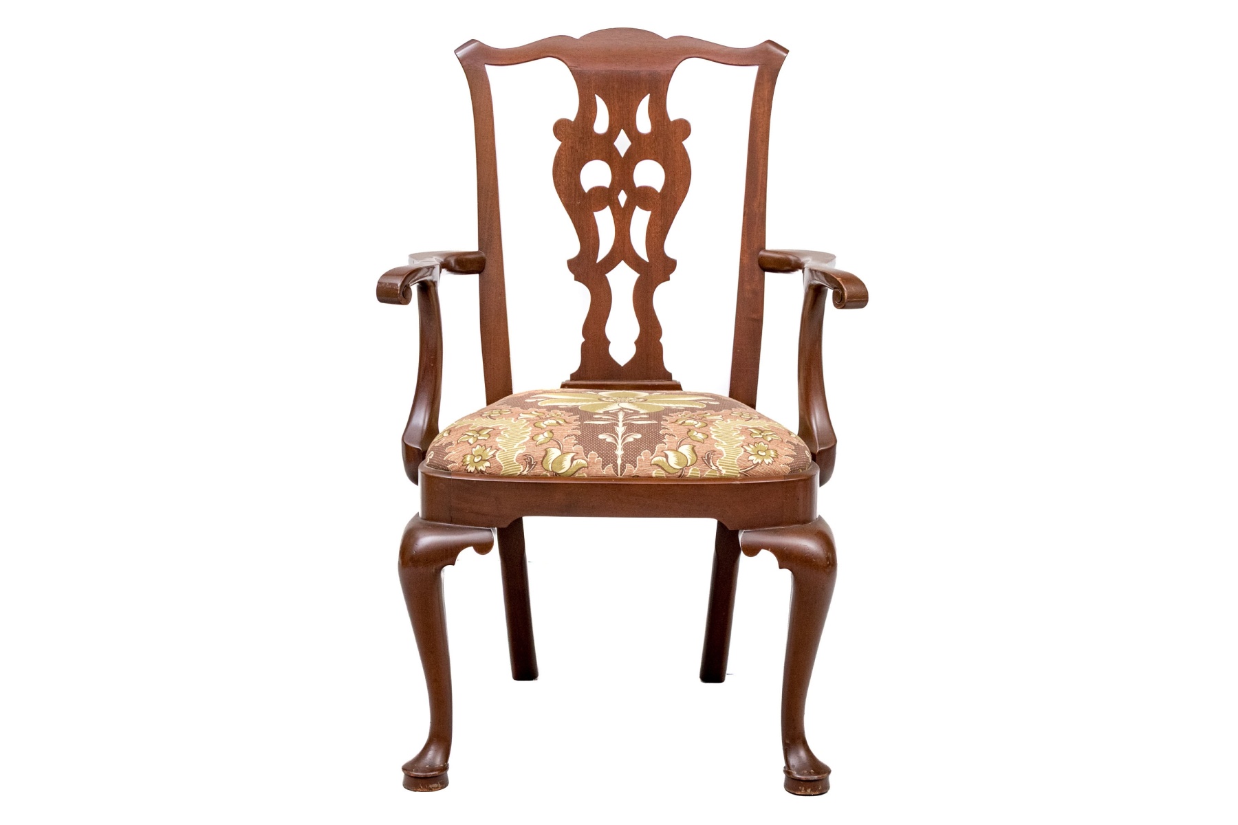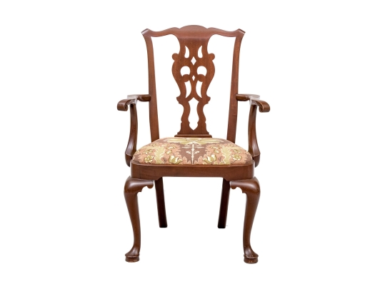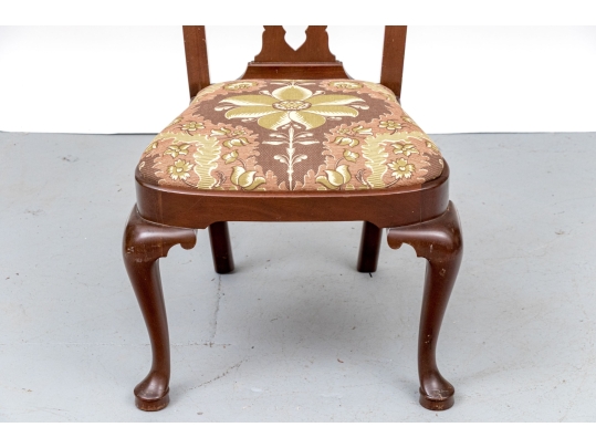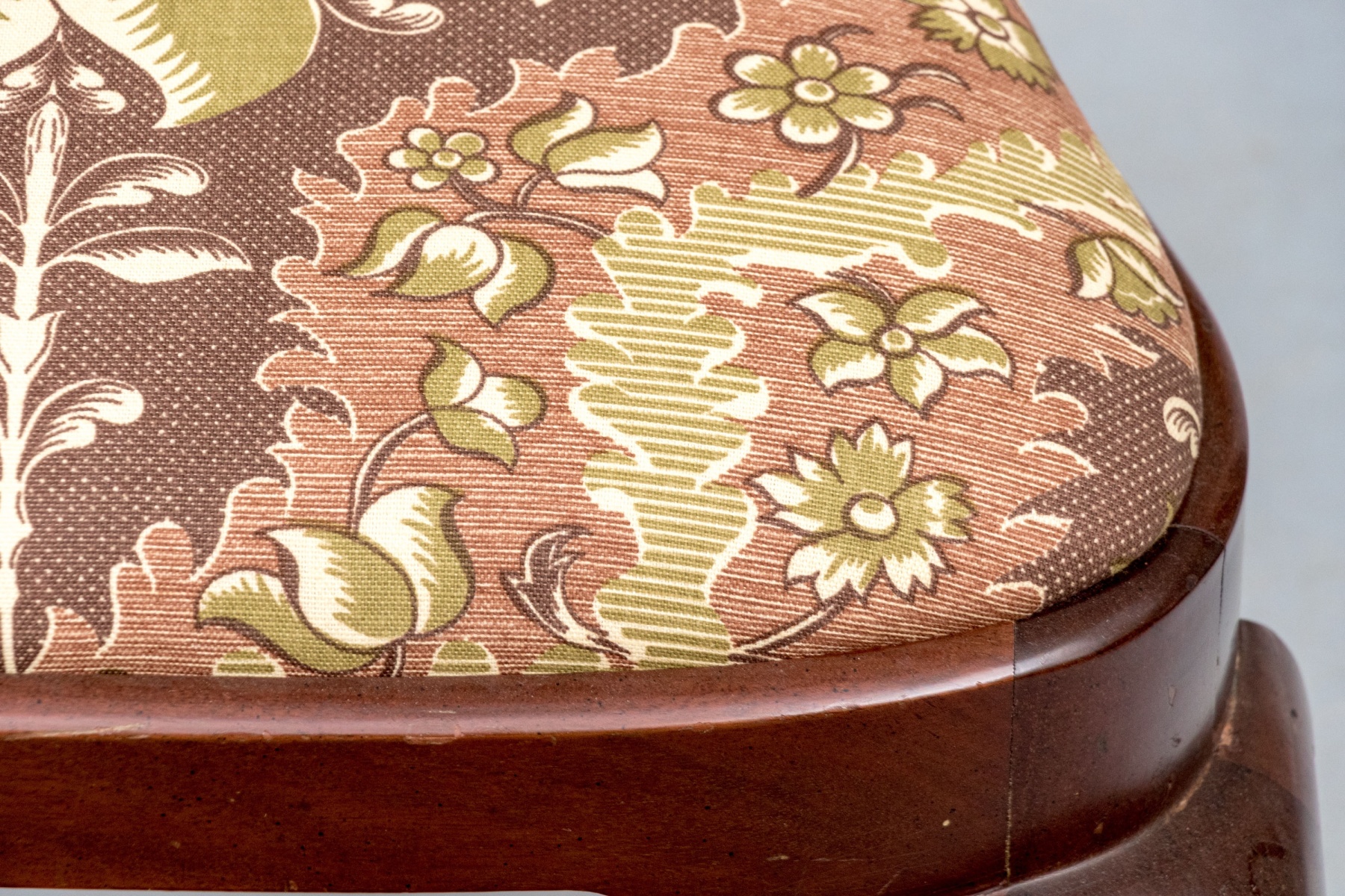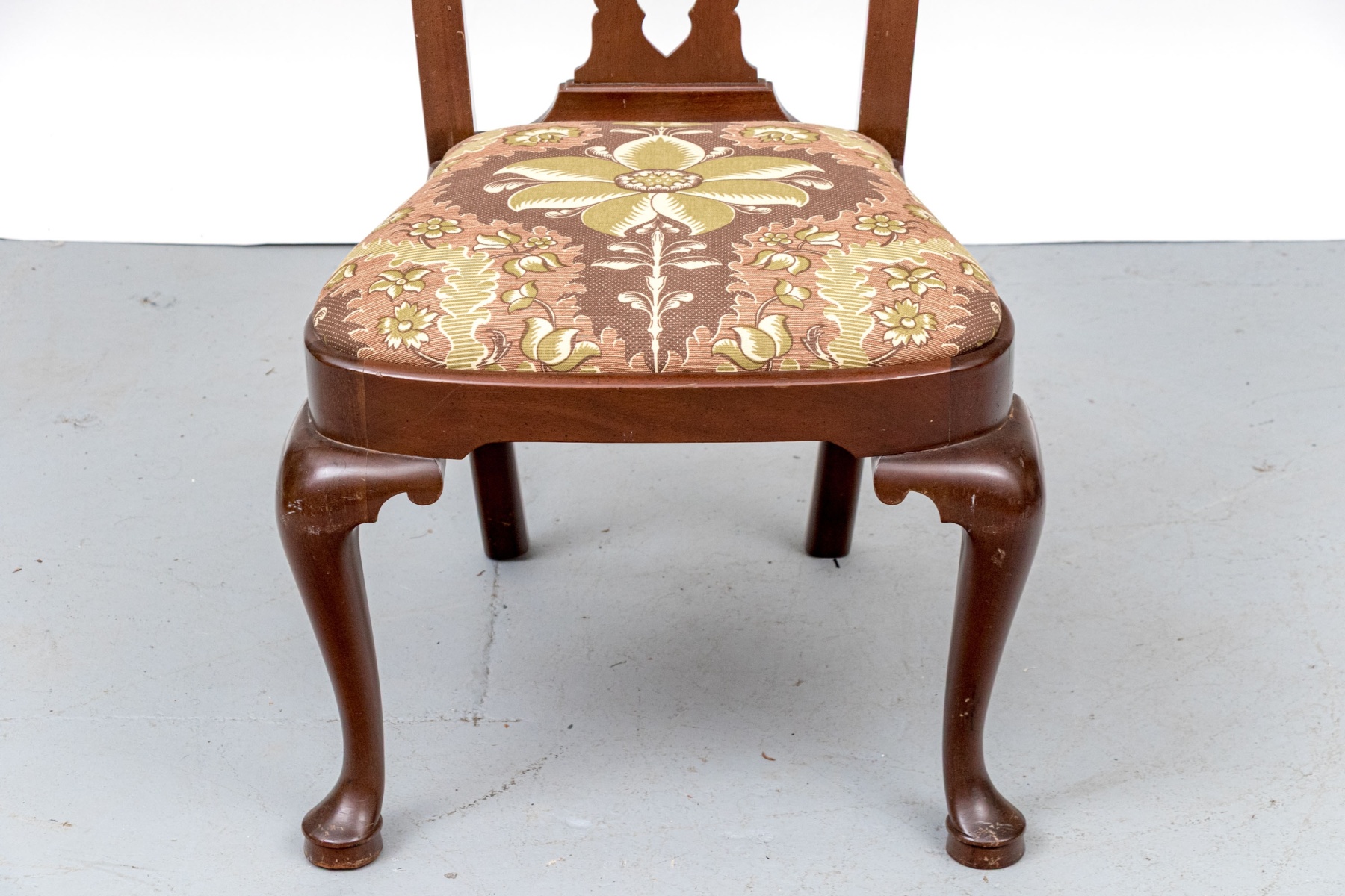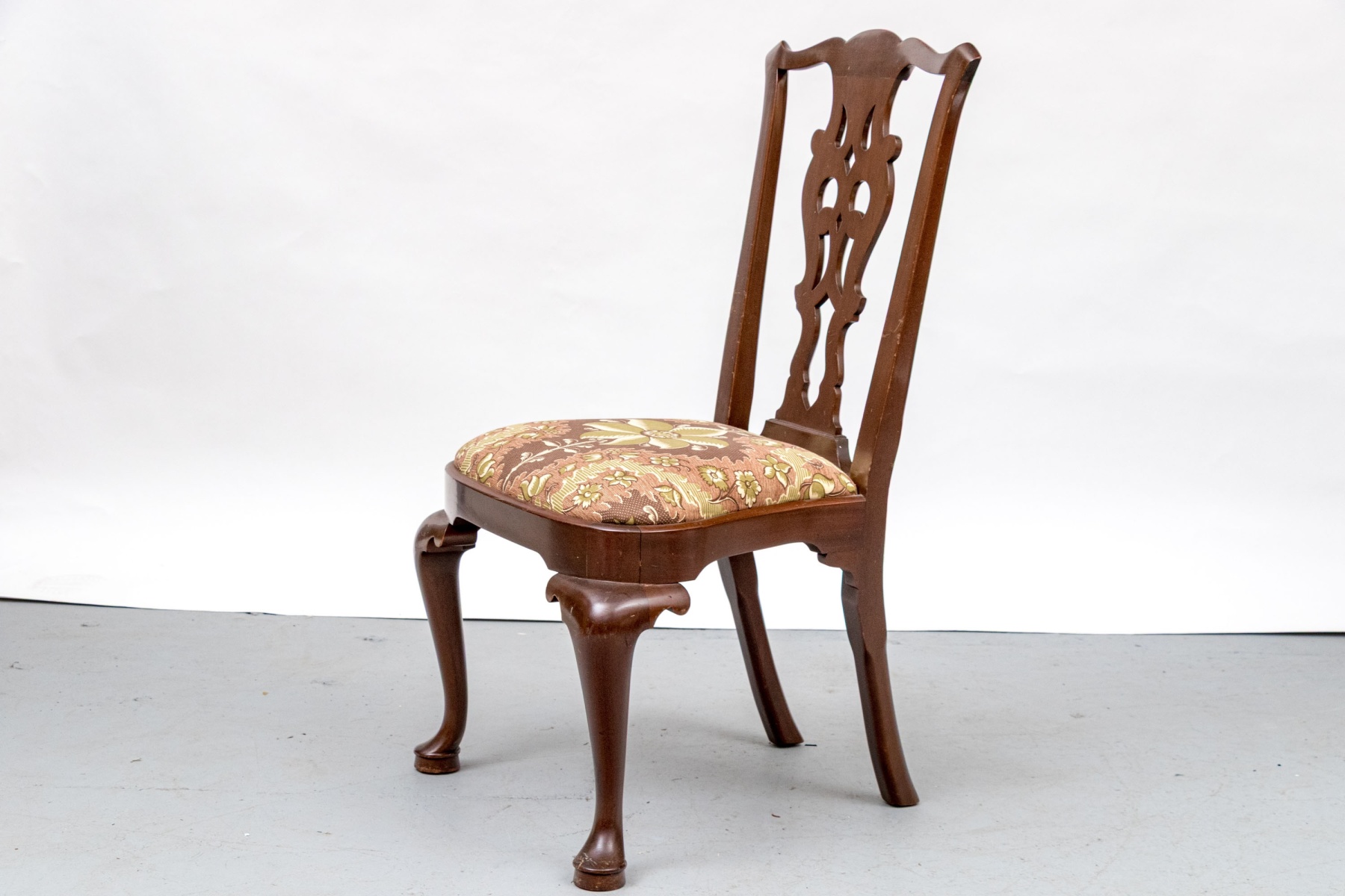 A very well made set with corner-blocking, good weight and fine comfort. Including two arm and six side chairs. Georgian style with classic shaped crest rails and pierced back splats. Raised on front cabriole legs with carved scrolled knees and pad feet, and square splayed curved back legs. The seats upholstered in quality Clarence House fabric in a green and brown floral print.
