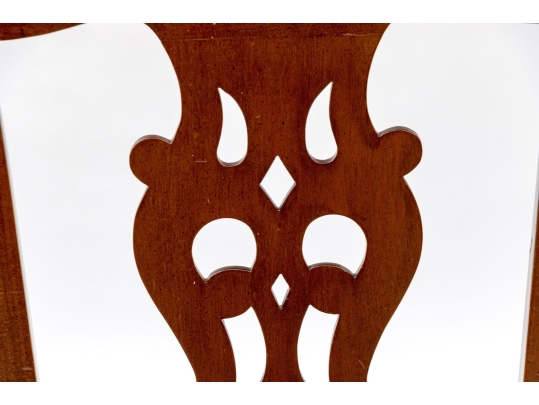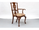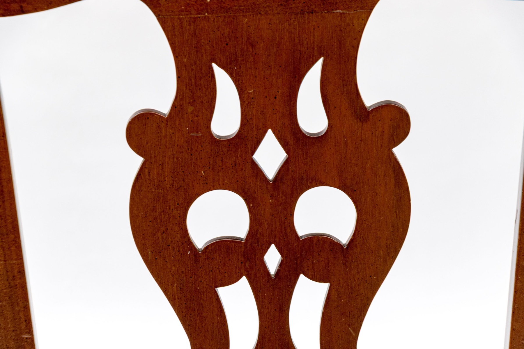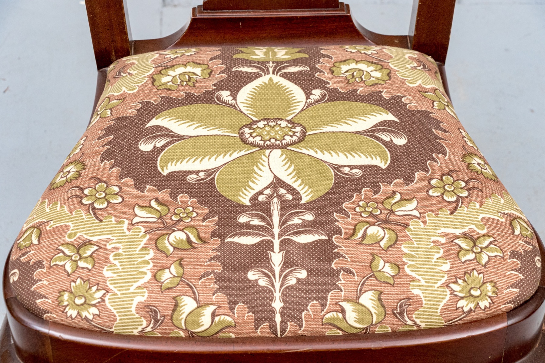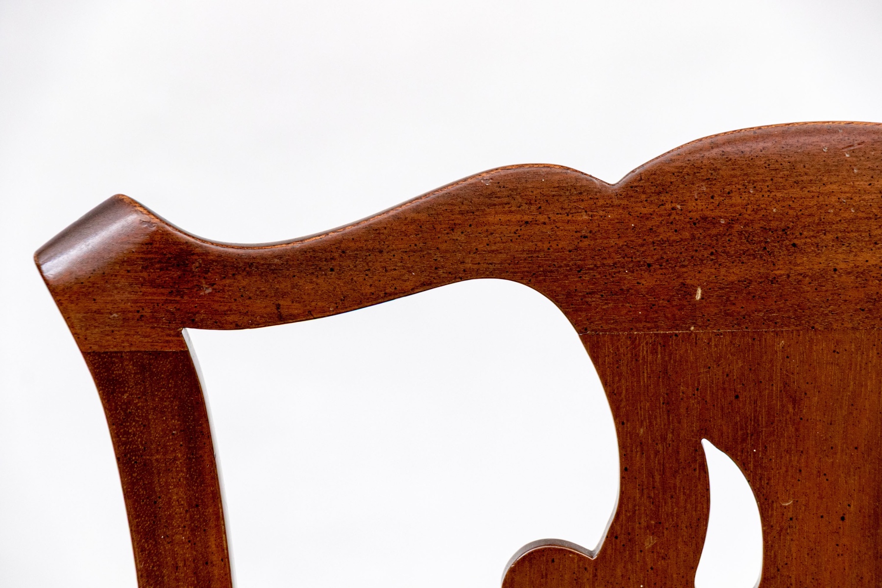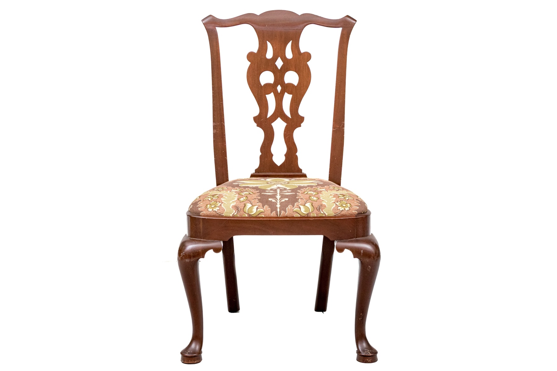 A very well made set with corner-blocking, good weight and fine comfort. Including two arm and six side chairs. Georgian style with classic shaped crest rails and pierced back splats. Raised on front cabriole legs with carved scrolled knees and pad feet, and square splayed curved back legs. The seats upholstered in quality Clarence House fabric in a green and brown floral print.