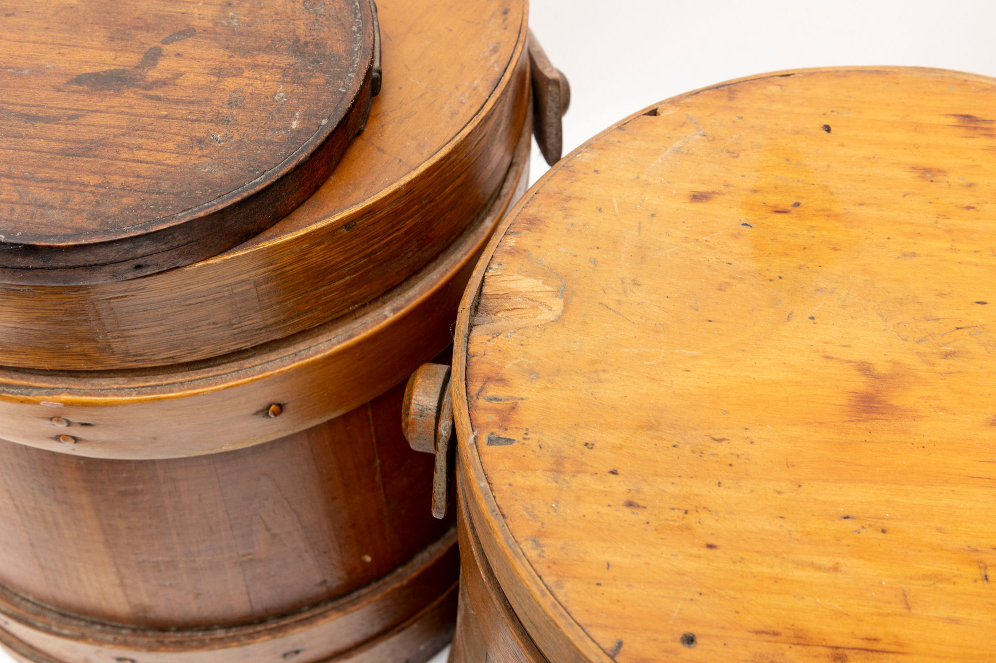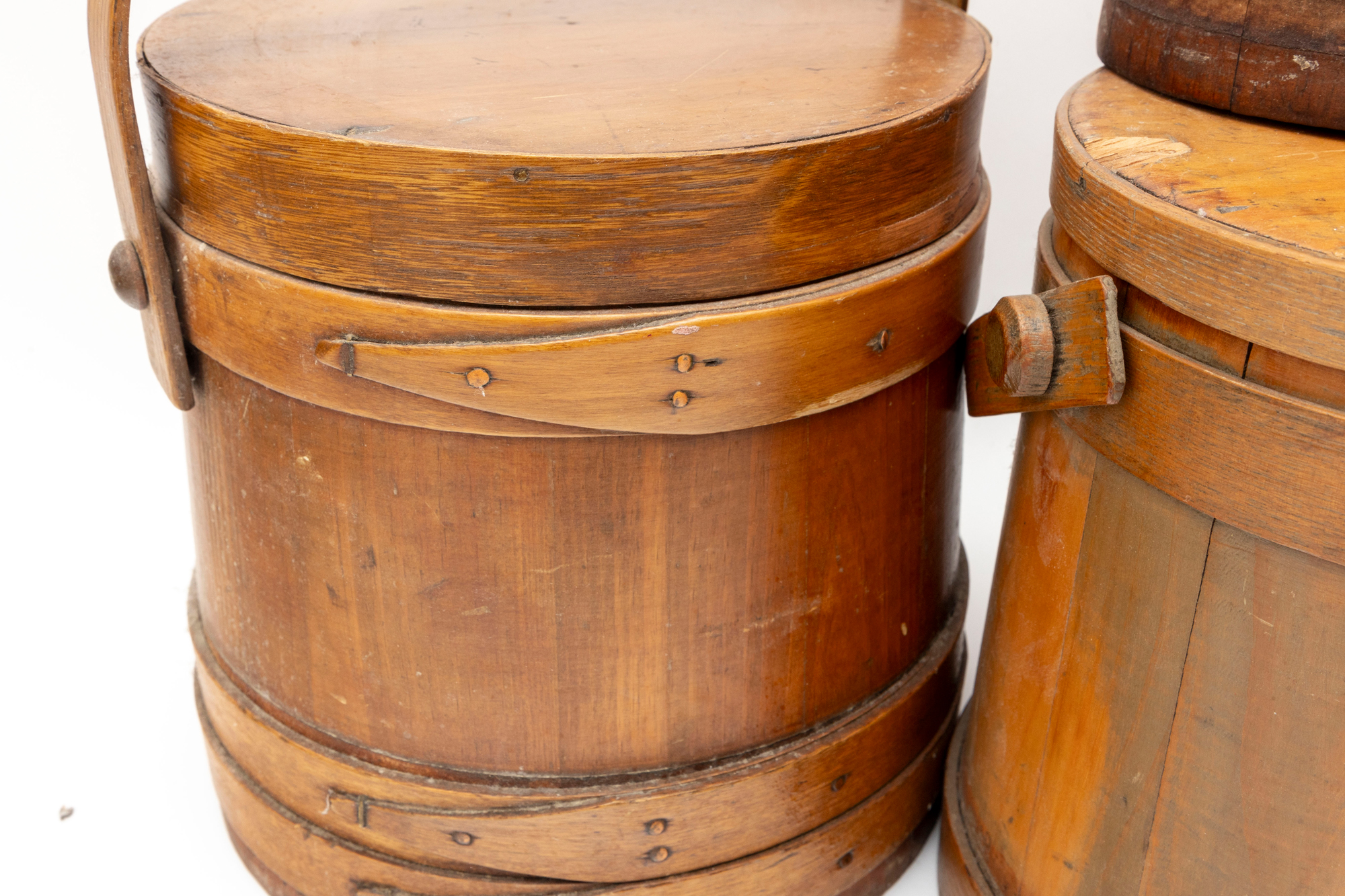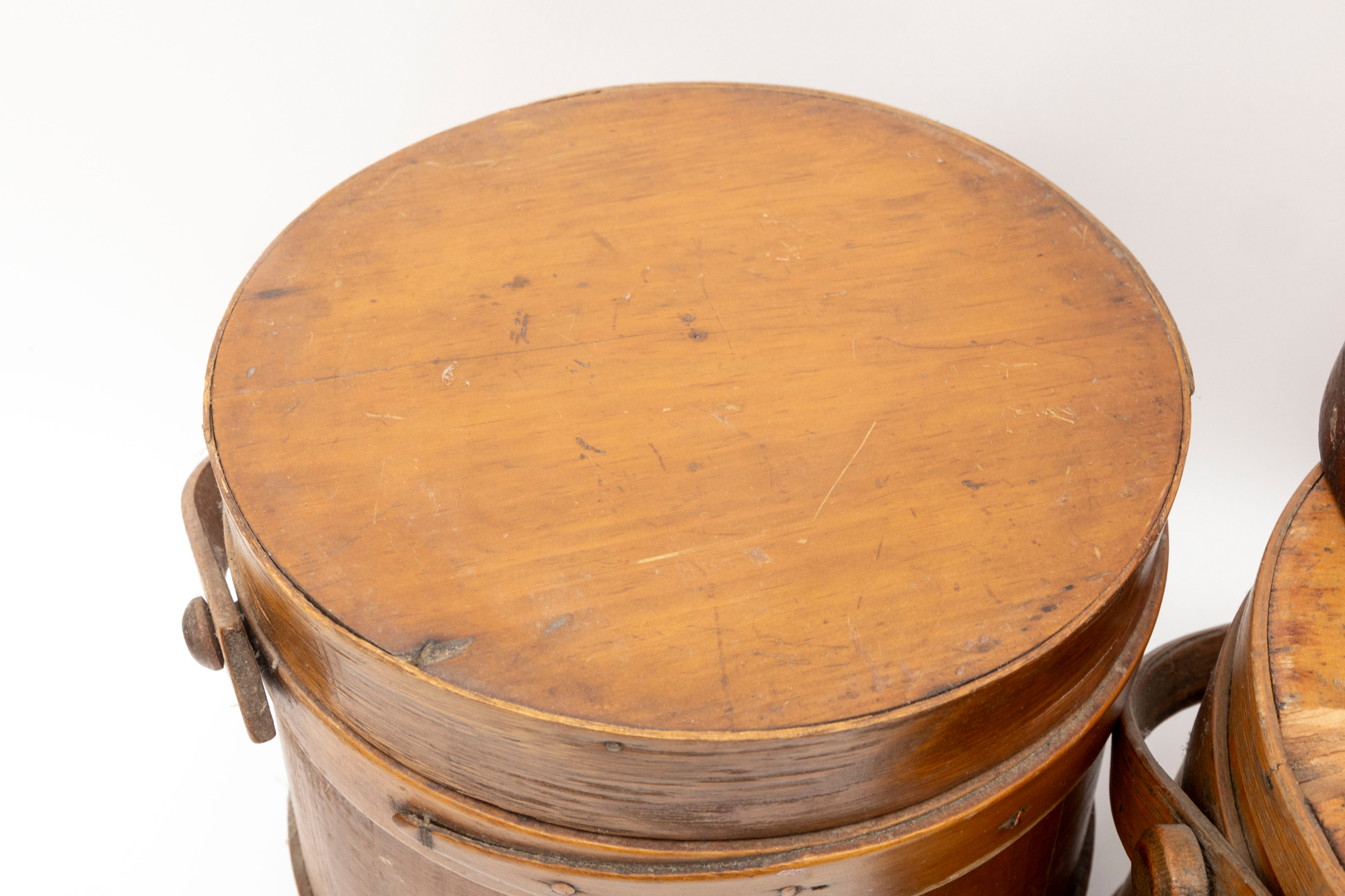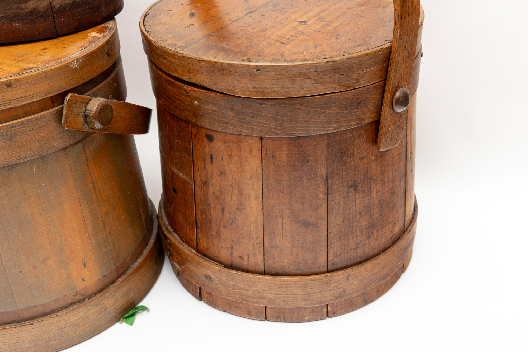 Antique 19th century primitive wooden firkins complete with lids and carry handles.