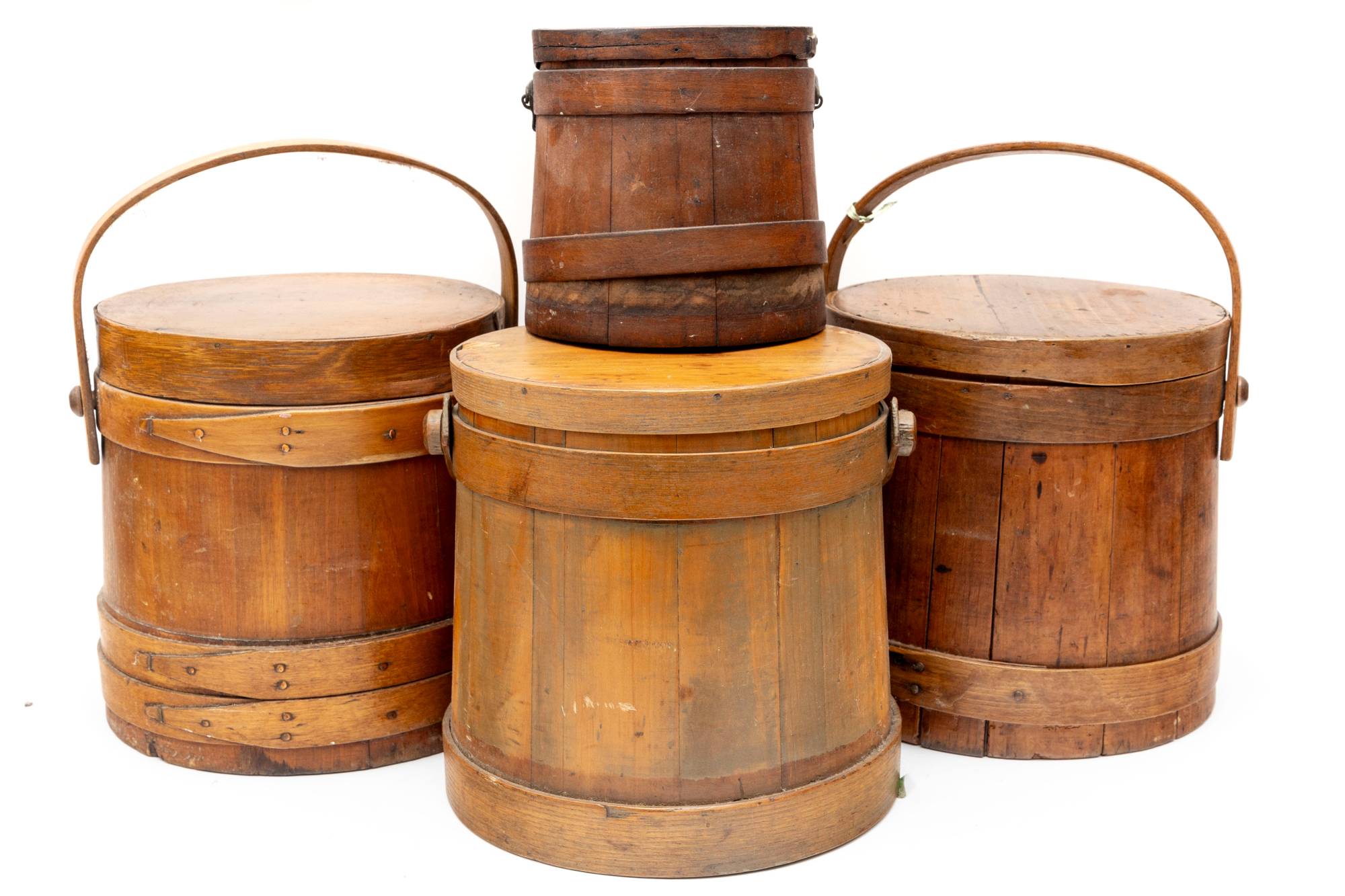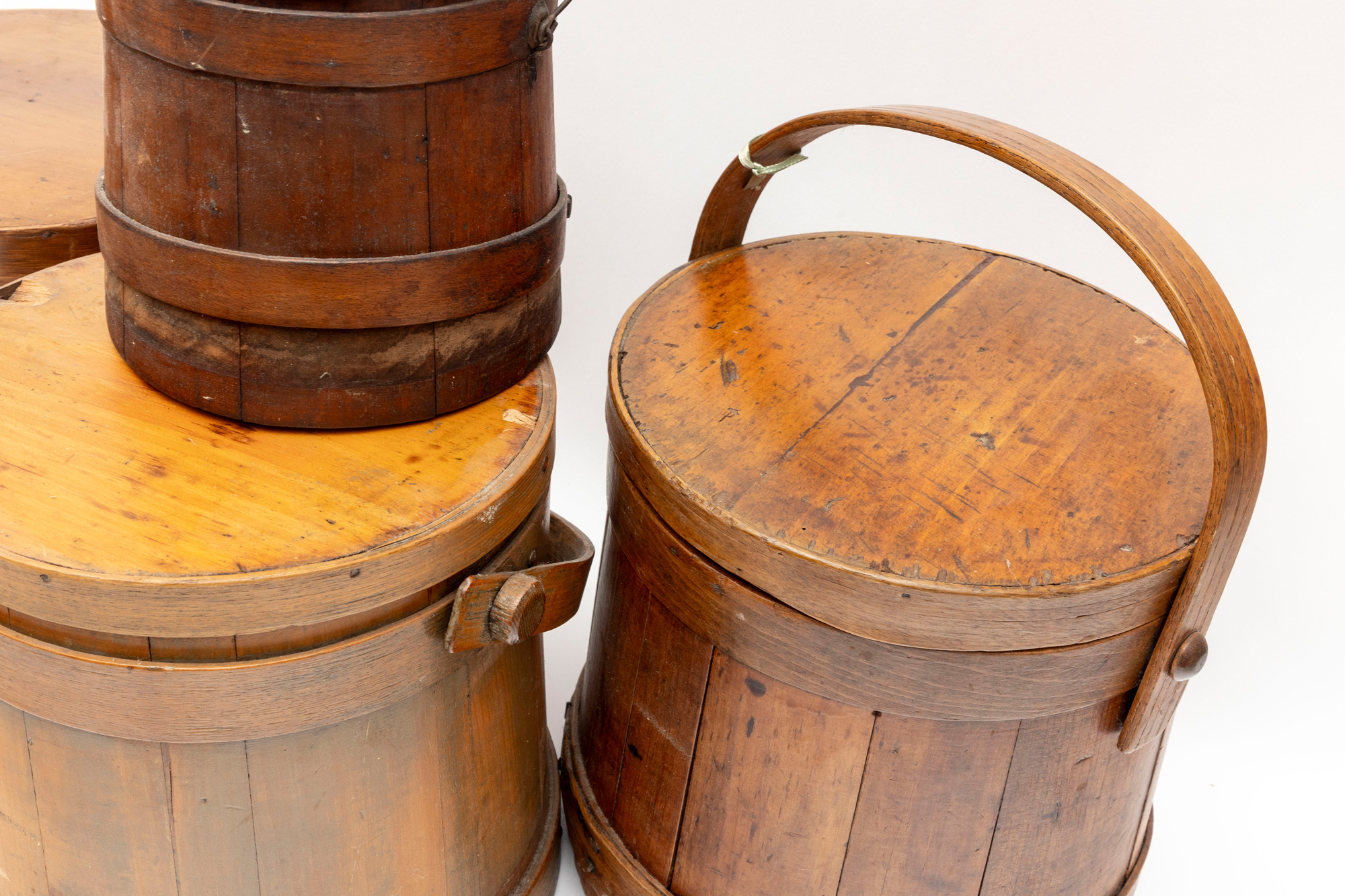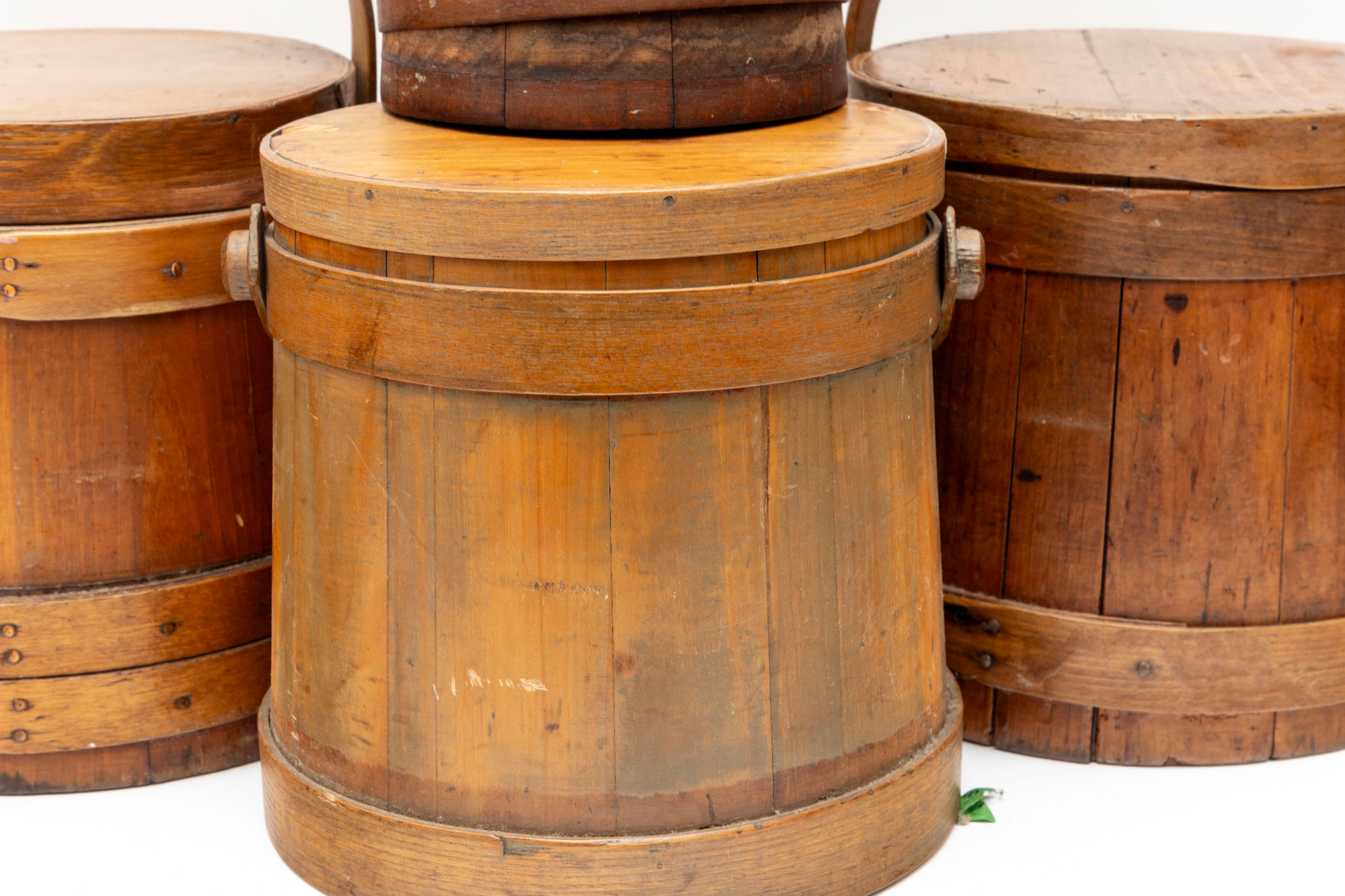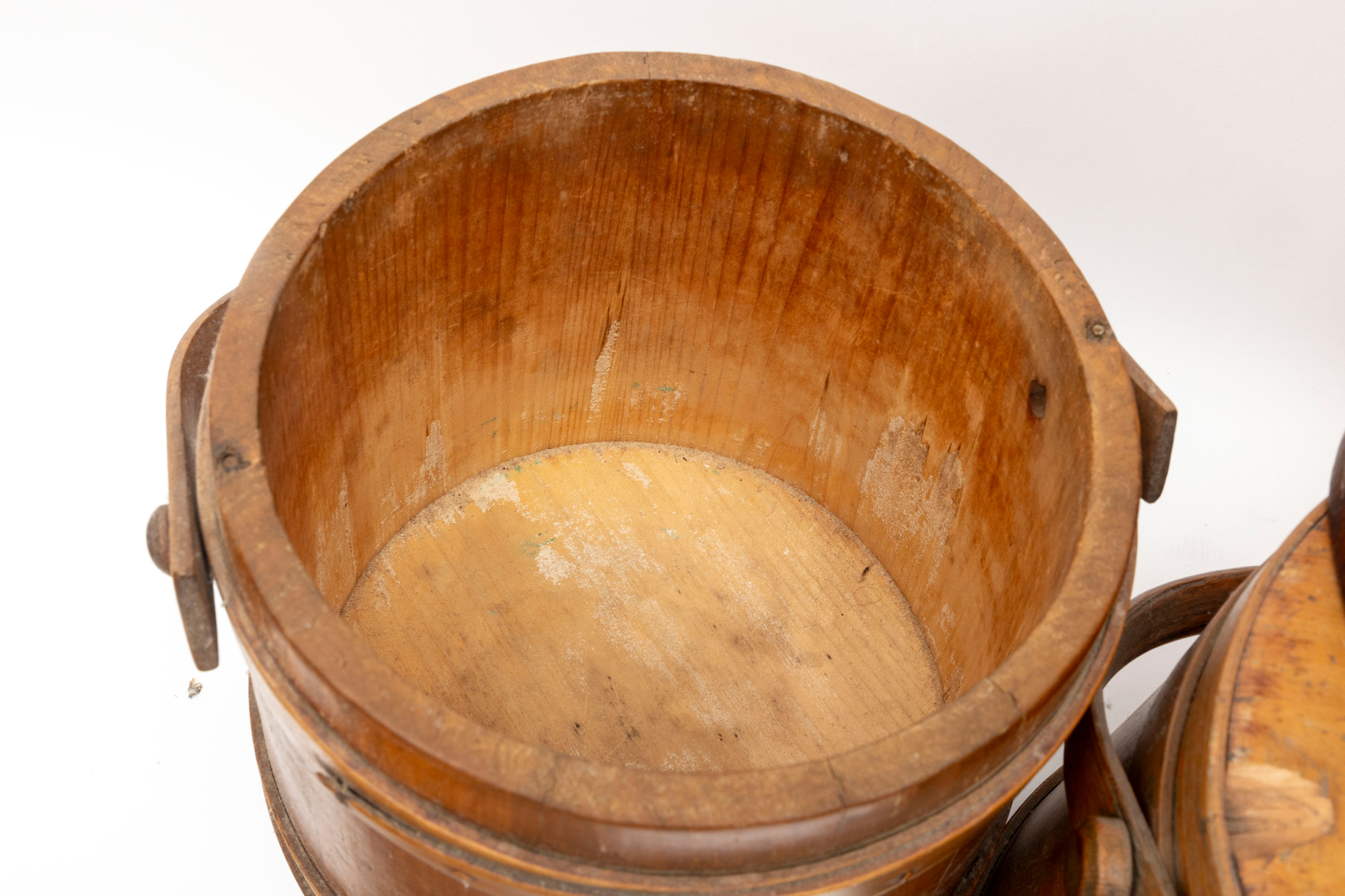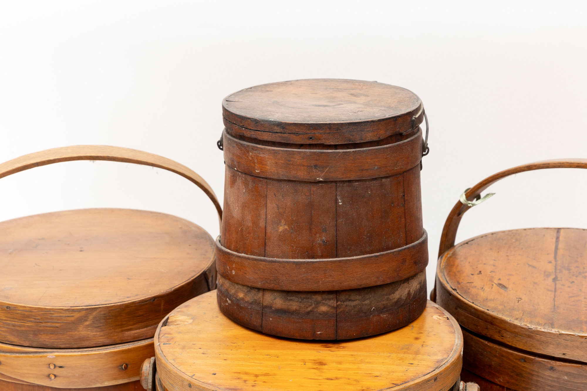 Antique 19th century primitive wooden firkins complete with lids and carry handles.