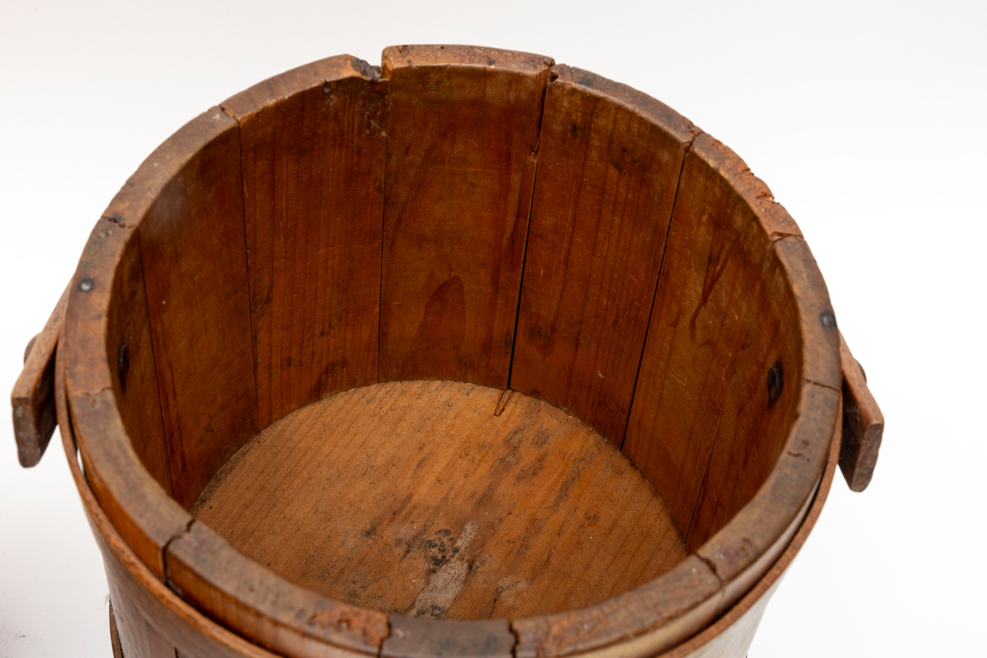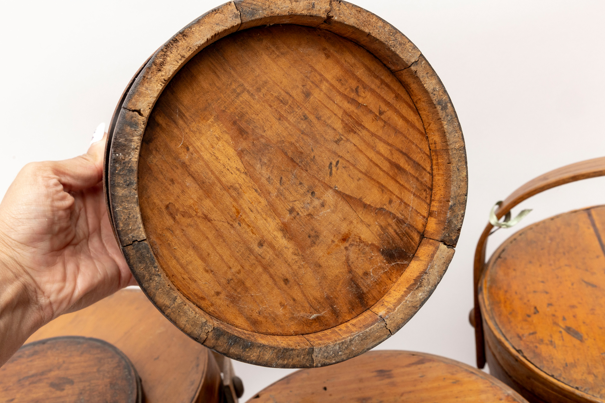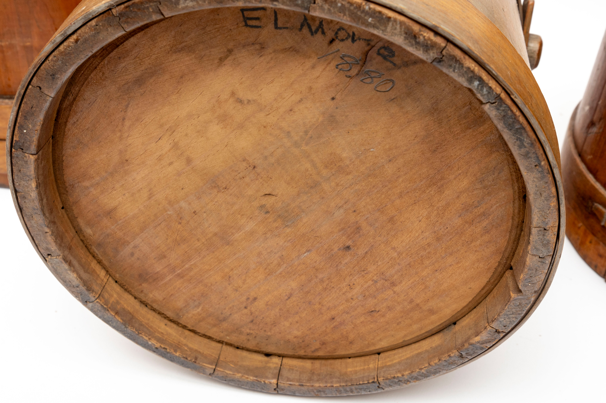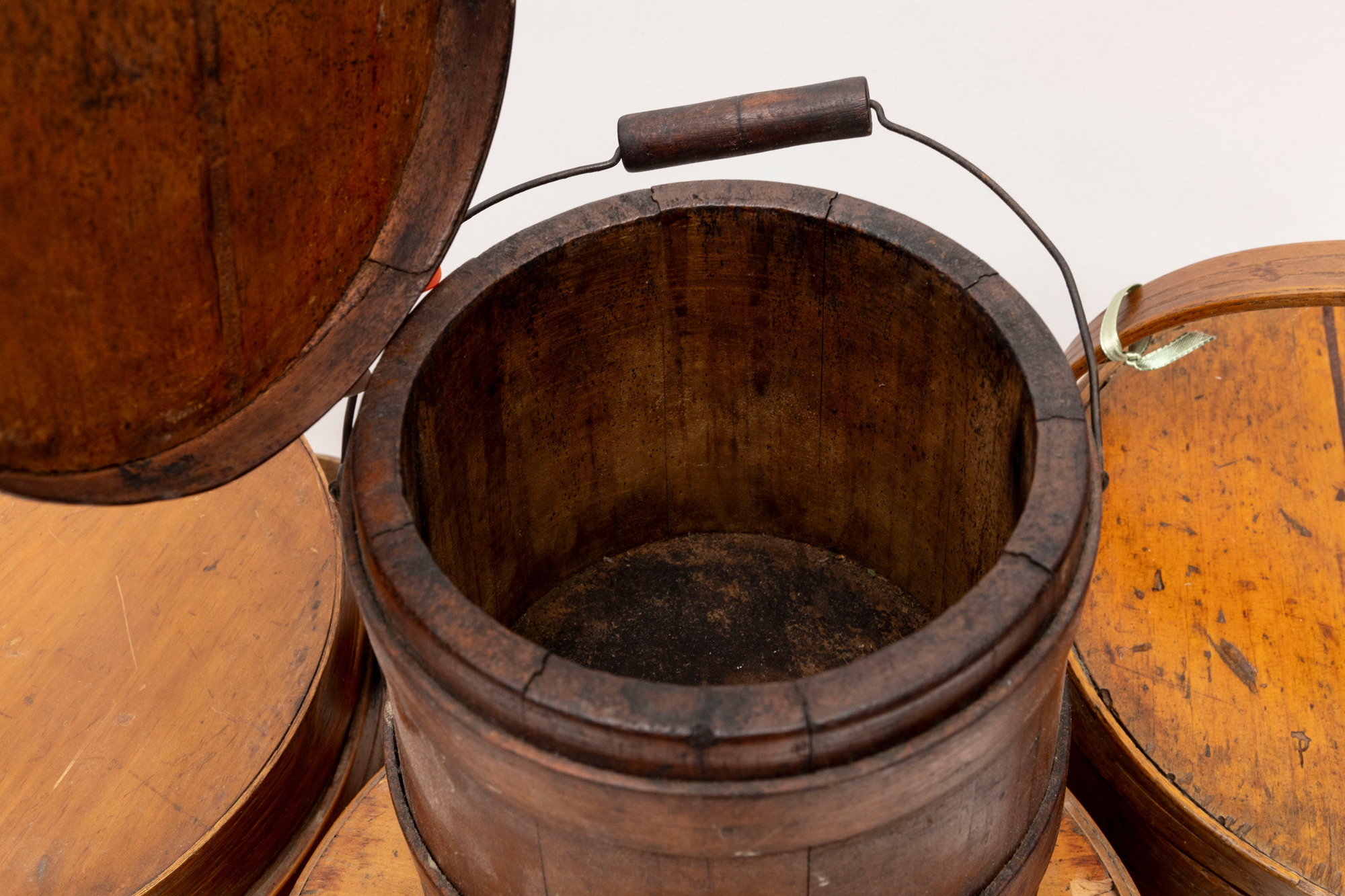 Antique 19th century primitive wooden firkins complete with lids and carry handles.