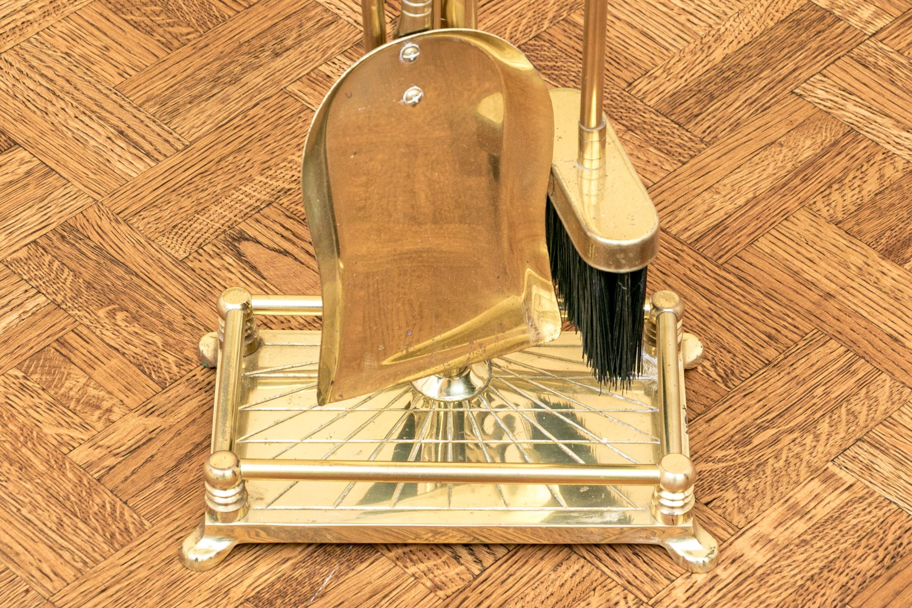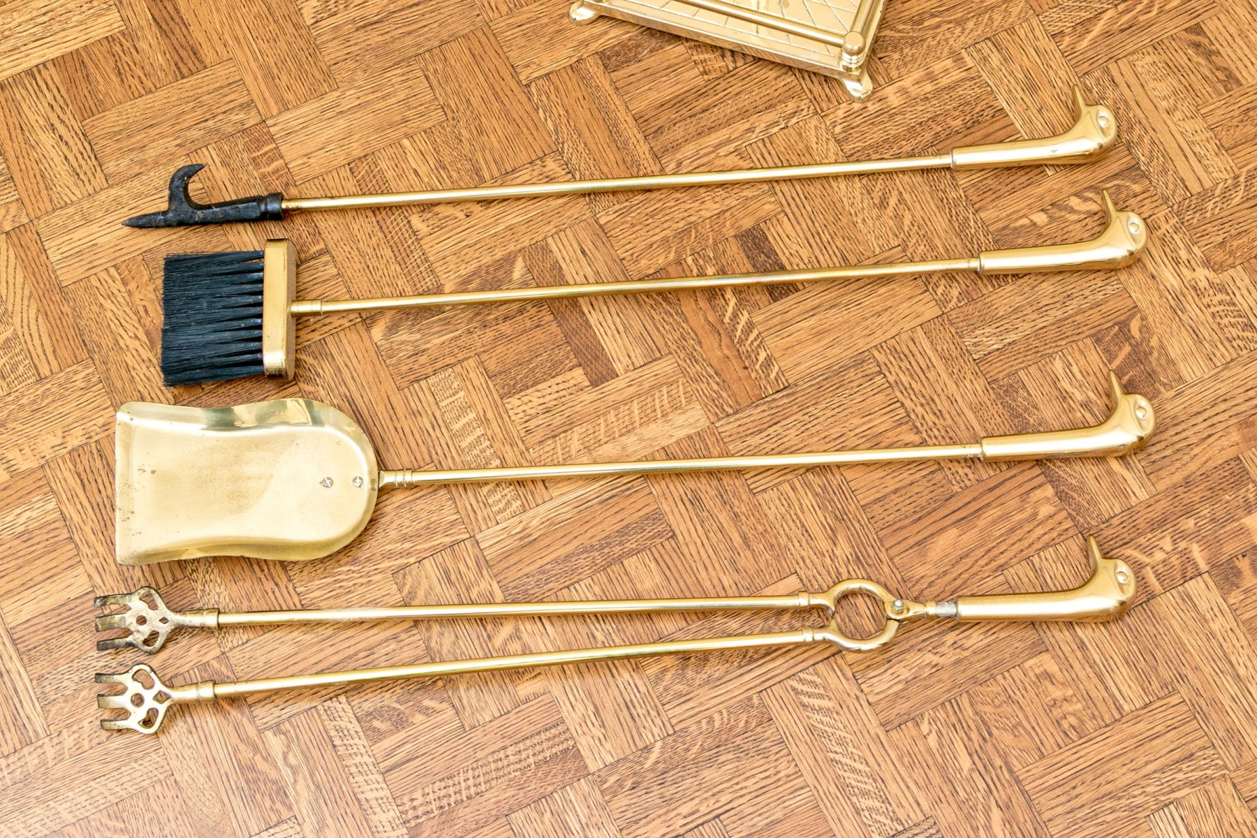 A delightful set of brass fireplace tools with duck head handles, including a shovel, brush, poker, and tongs on a stand with a rectangular base on feet.