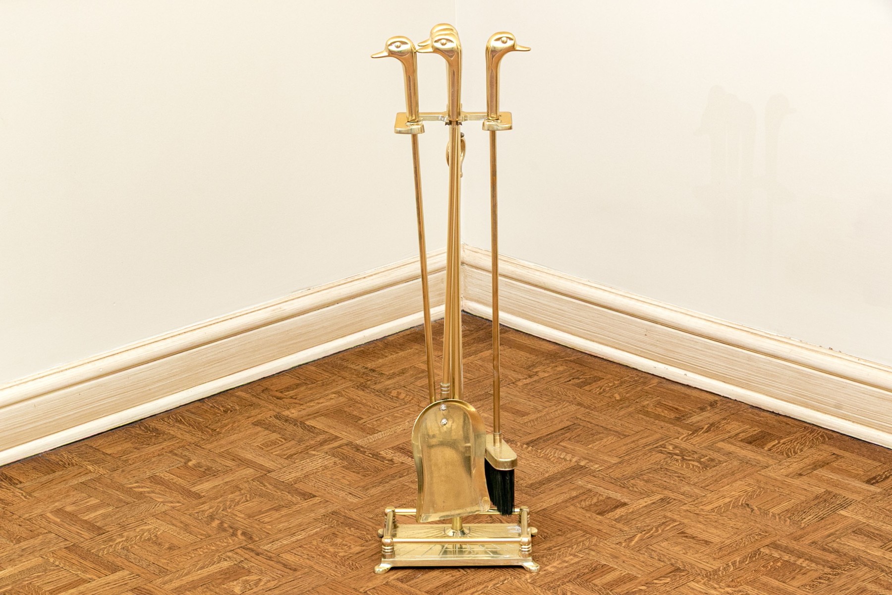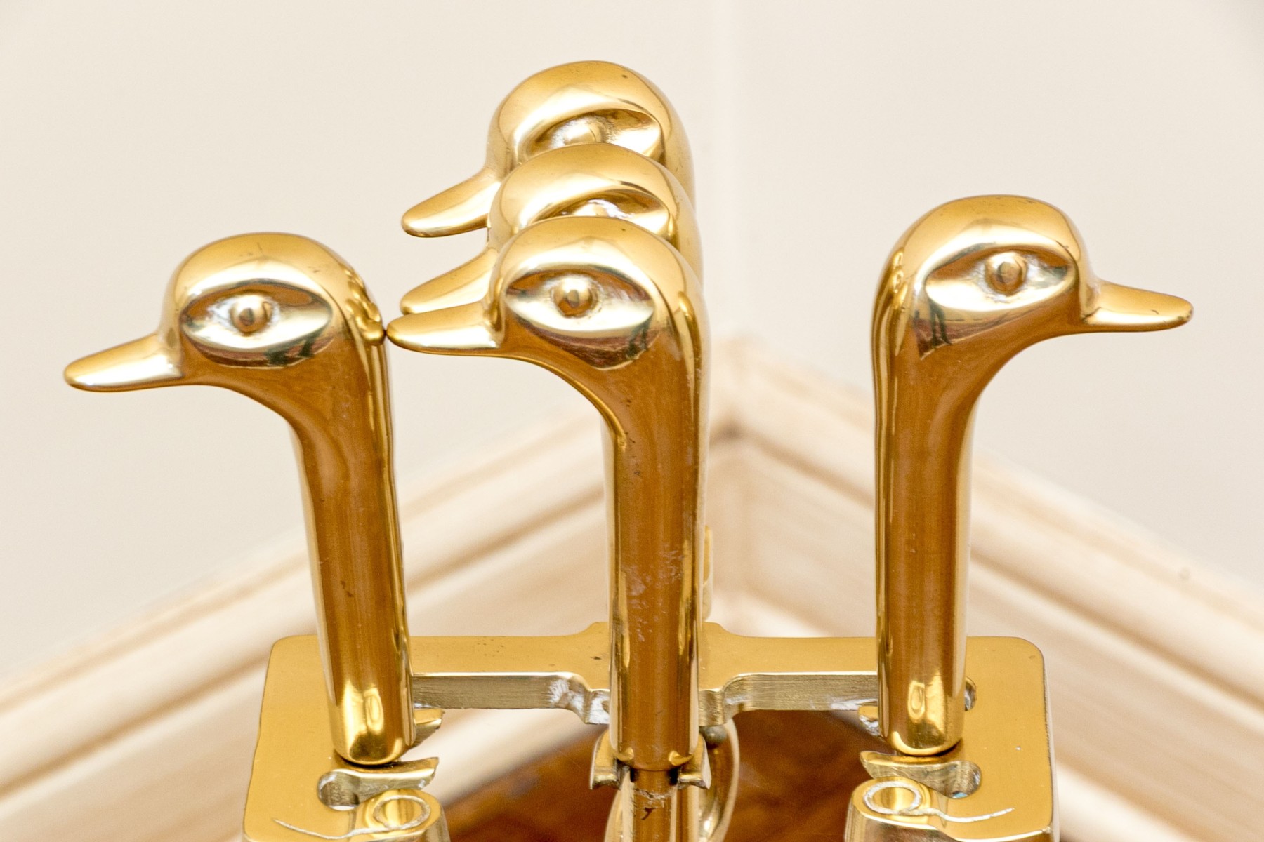 A delightful set of brass fireplace tools with duck head handles, including a shovel, brush, poker, and tongs on a stand with a rectangular base on feet.