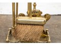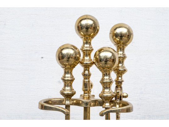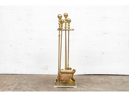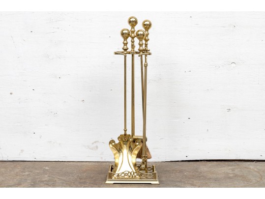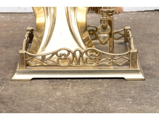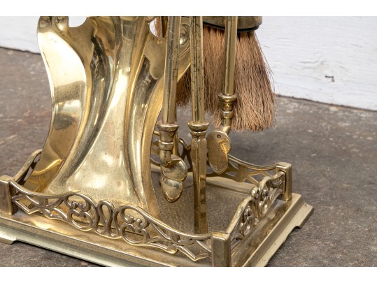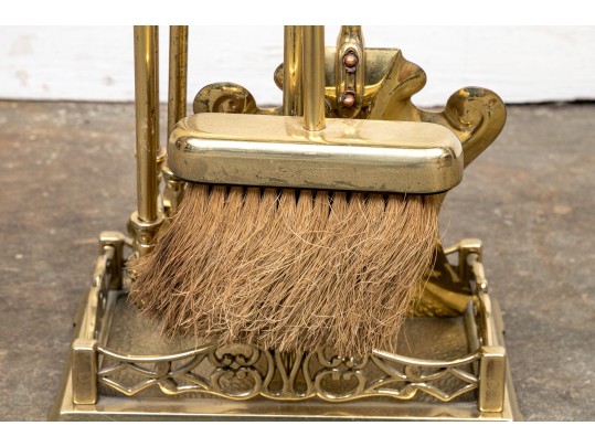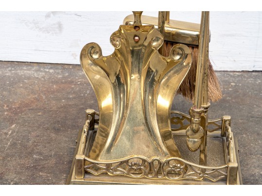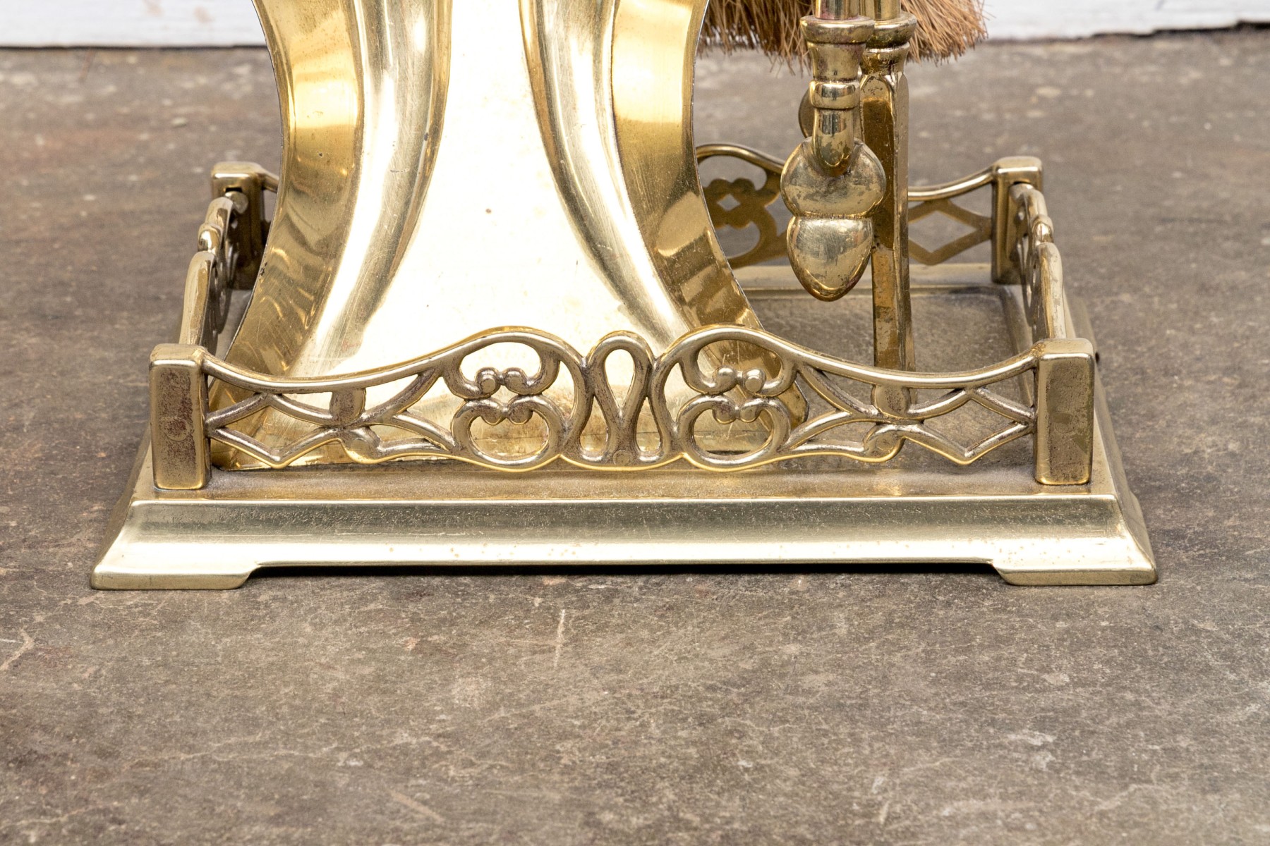 Including a shovel, brush, and tongs all with ball tops. The stand with openwork scrolled sides.